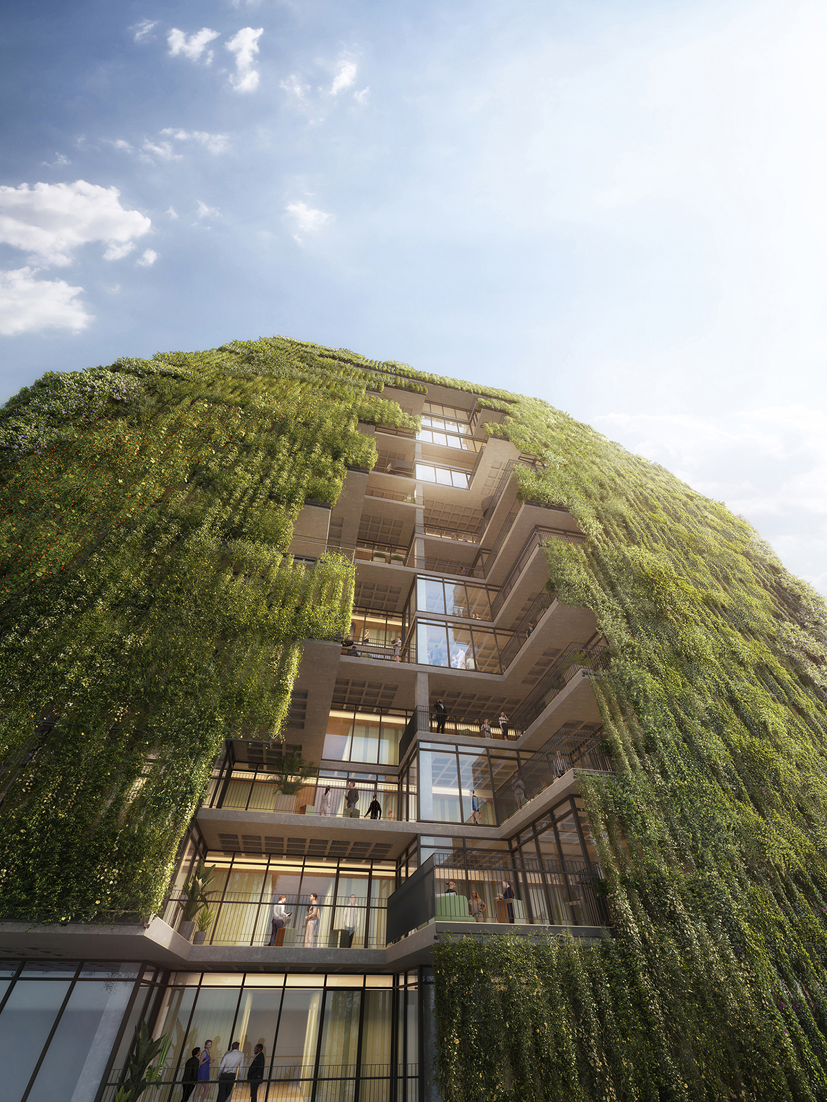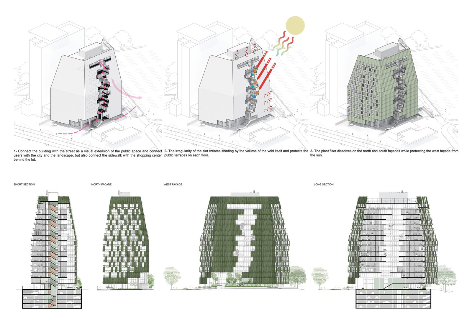 本案在一項封閉式競賽中脫穎而出。基於對建築環境影響的高度意識,團隊大膽提出僅興建15層的方案;與場地所允許、同樣具備11,000平方米可銷售面積的25層建築相比,總建築面積減少10%(因動線重複度降低),立面面積亦縮減20%。換言之,藉由這項大膽決策,不僅降低建造成本,也更友善環境。