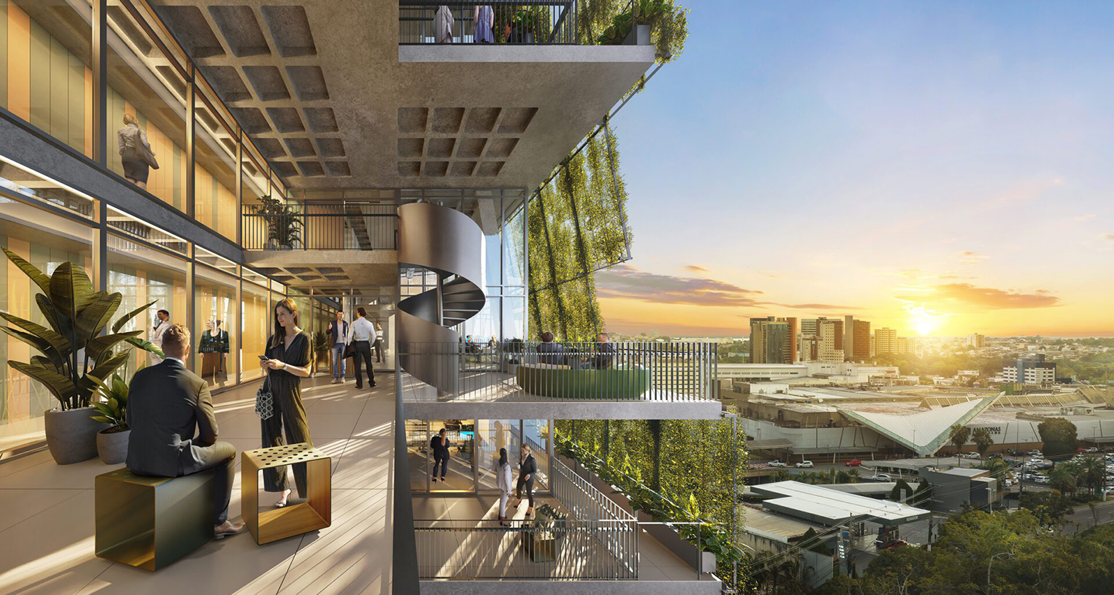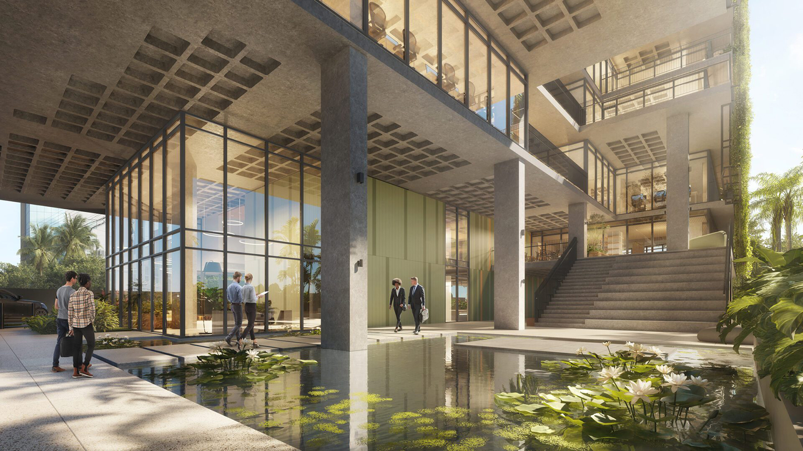 博塔尼卡辦公大樓(Botânica Office)的立面覆以攀緣植物,不僅能過濾午後日光,更以全新的企業建築理念連結使用者、自然、城市與中央中庭的日落景觀,並在露台上促進社交交流。中庭藉由其特殊造型在視覺與空間上延伸公共領域,鼓勵人們在各層公共露台進行社交與商務活動;公共空間亦延伸至建築一層,串聯人行道與後方的購物中心,將水平的公共軸線與中庭露台的垂直軸線融為一體。中庭最上方為屋頂平台,設置酒吧與餐廳,可一覽城市全景。