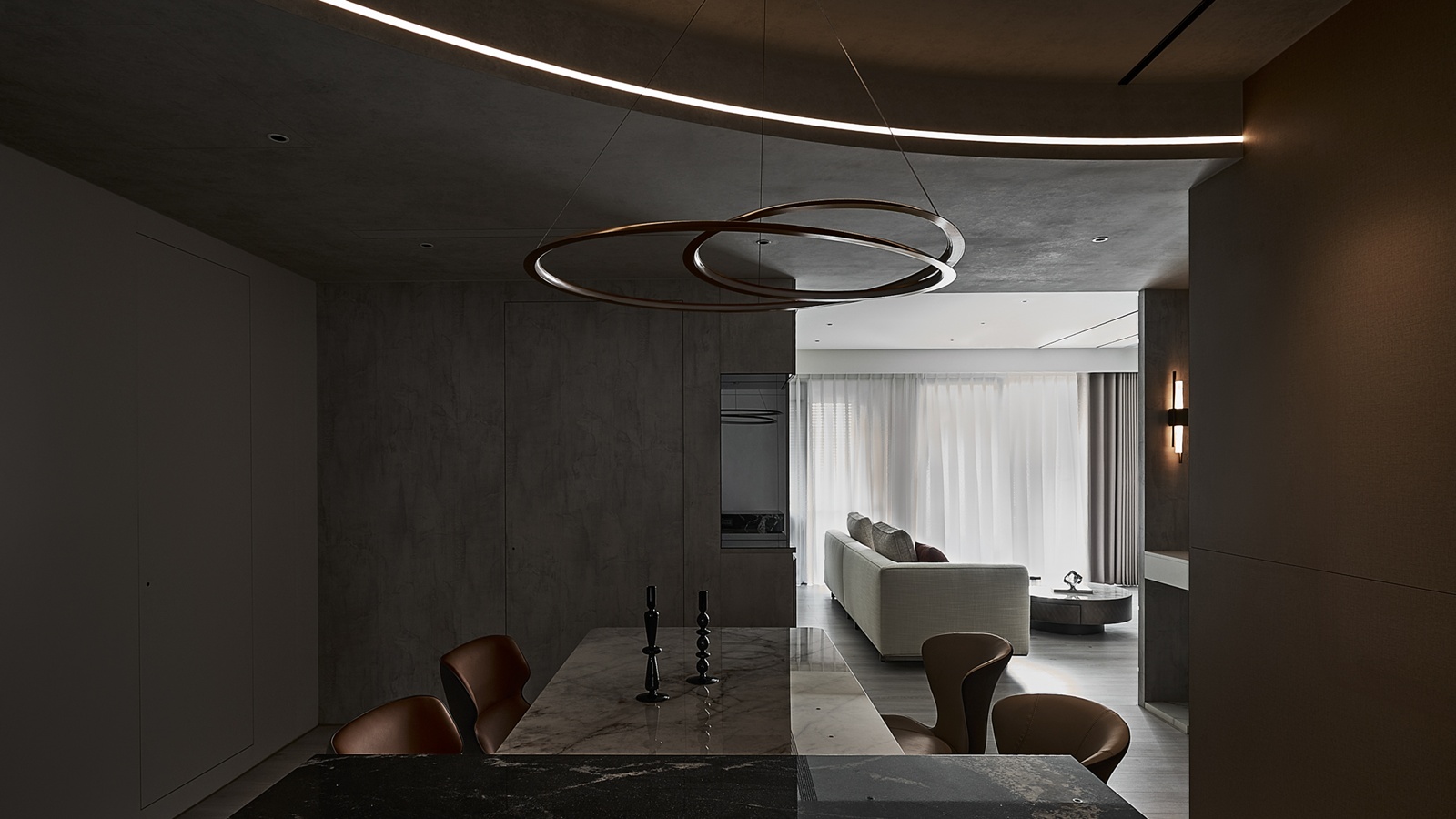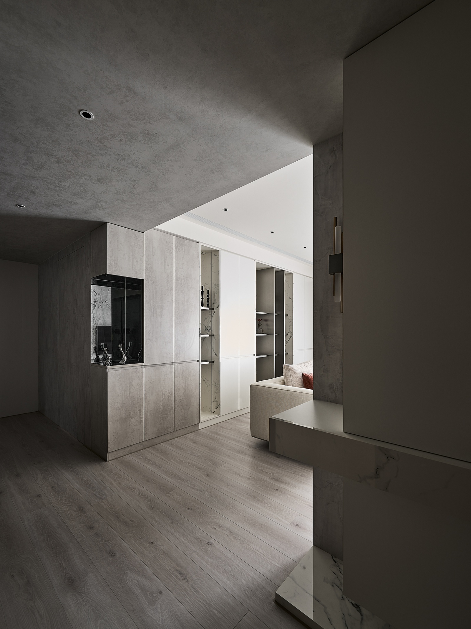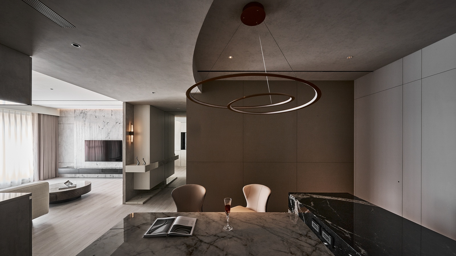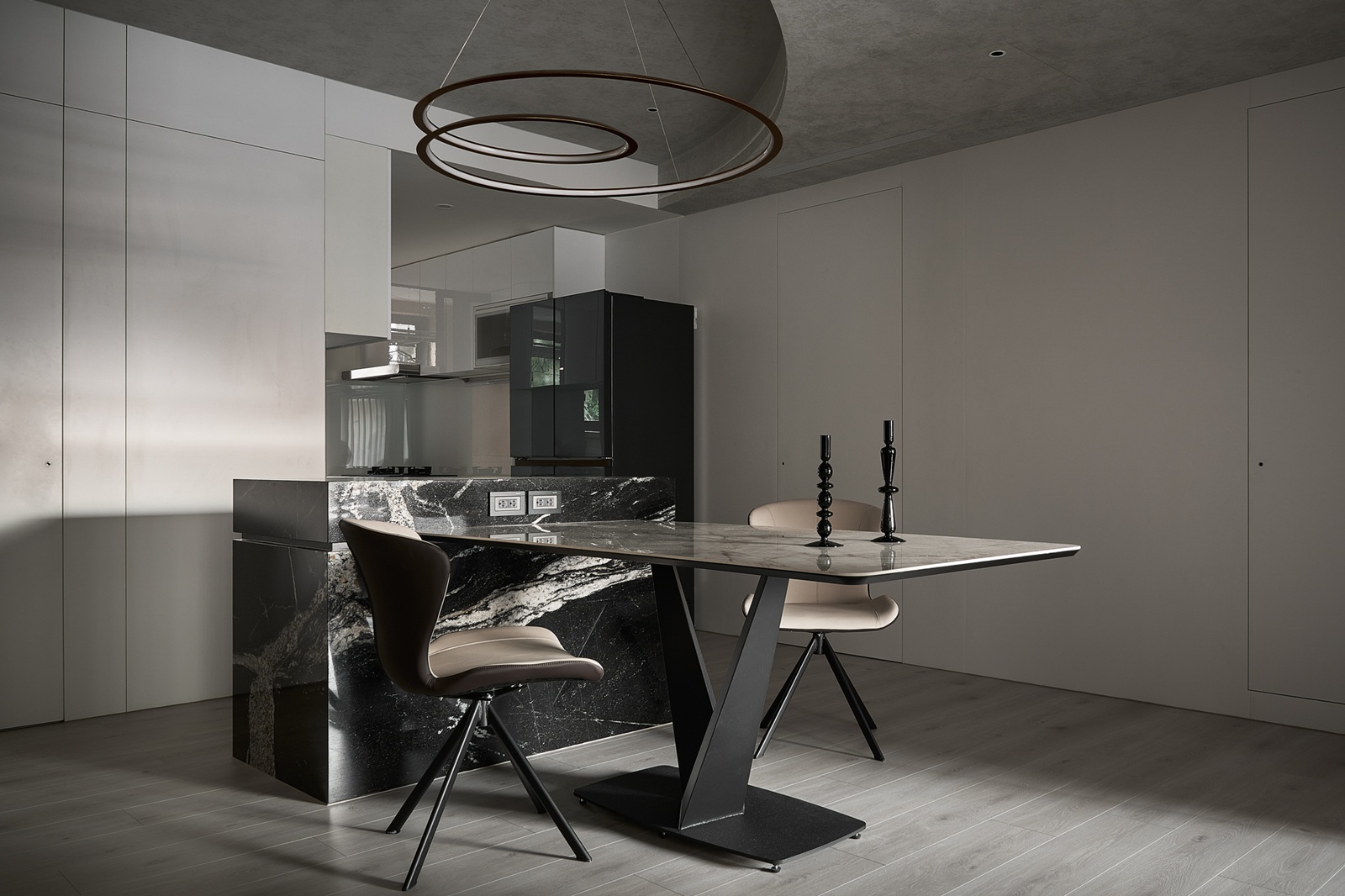 本案為高端住宅設計案,團隊因應居者期待,整體以清水模塗料與石材構築沈靜大氣的空間氛圍。設計巧妙結合大理石與大面開窗,營造光影與材質交融的視覺張力。此外,同步整合收納櫃體與展示機能,呈現俐落有序的生活景致。團隊以流暢俐落的線條拓展空間視感,形塑大器且富品味的居家體驗。