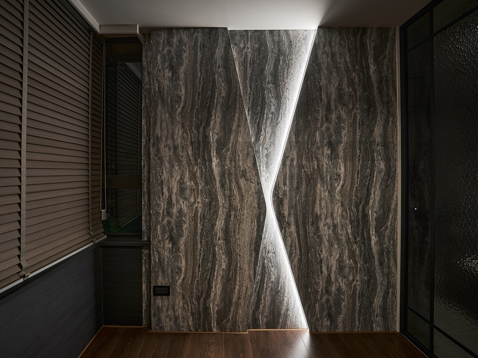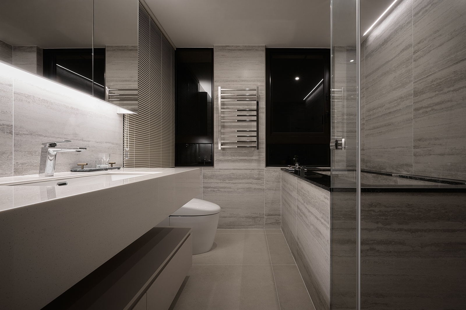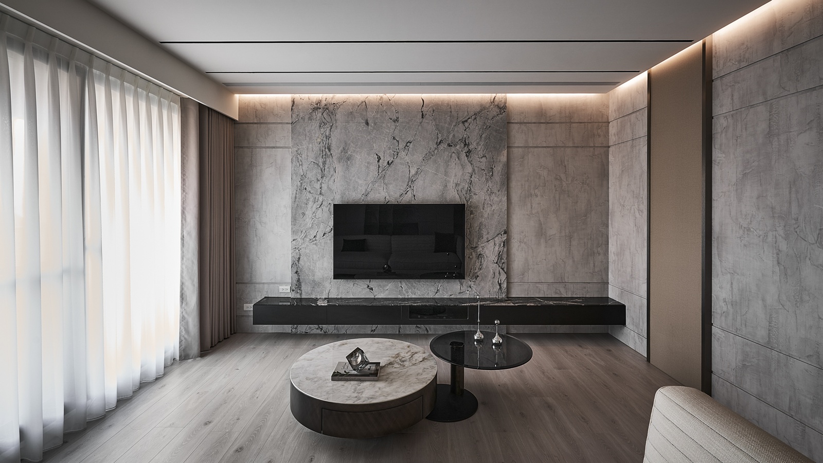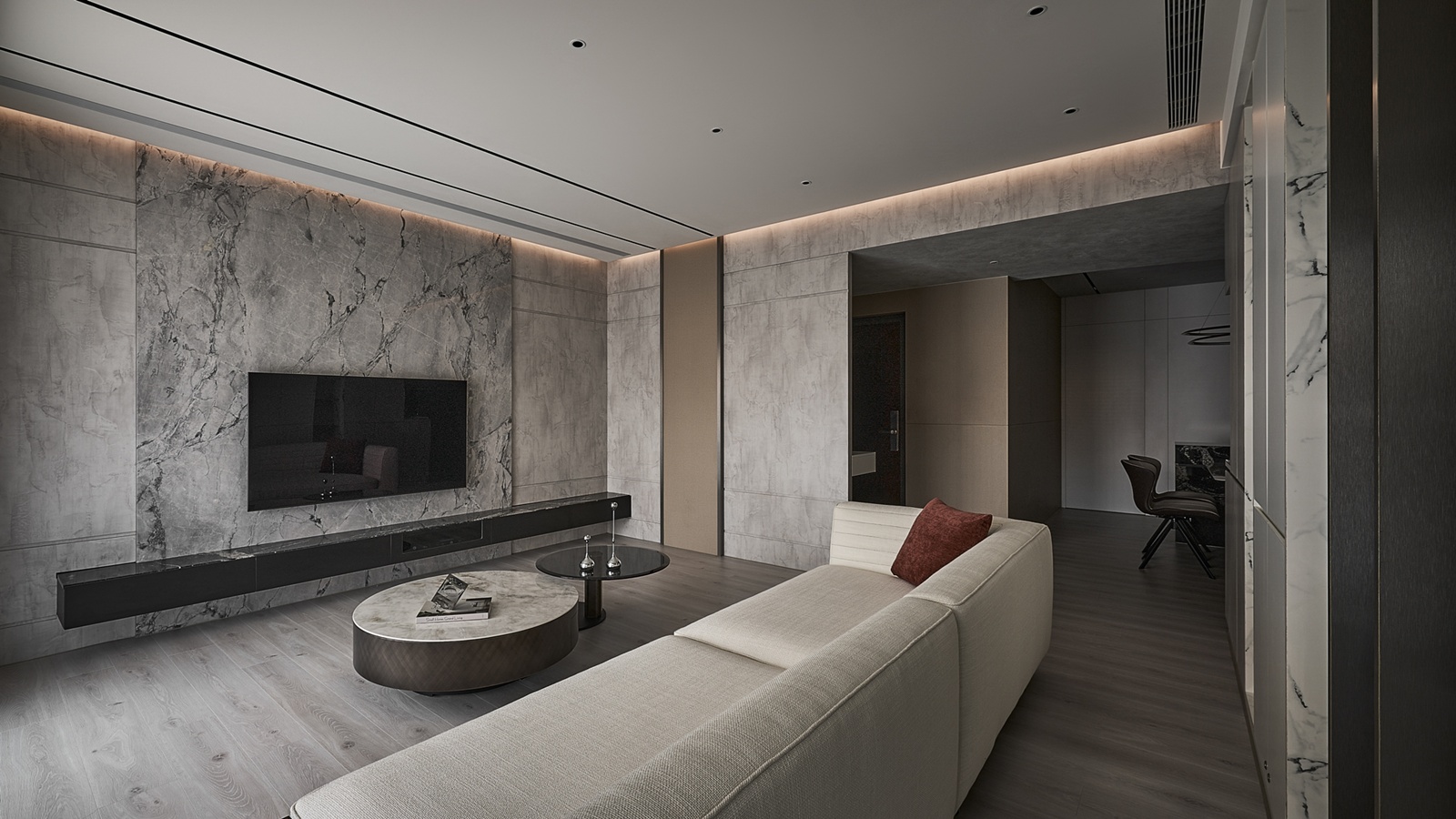 本案為高端住宅設計案,團隊因應居者期待,整體以清水模塗料與石材構築沈靜大氣的空間氛圍。設計巧妙結合大理石與大面開窗,營造光影與材質交融的視覺張力。此外,同步整合收納櫃體與展示機能,呈現俐落有序的生活景致。團隊以流暢俐落的線條拓展空間視感,形塑大器且富品味的居家體驗。