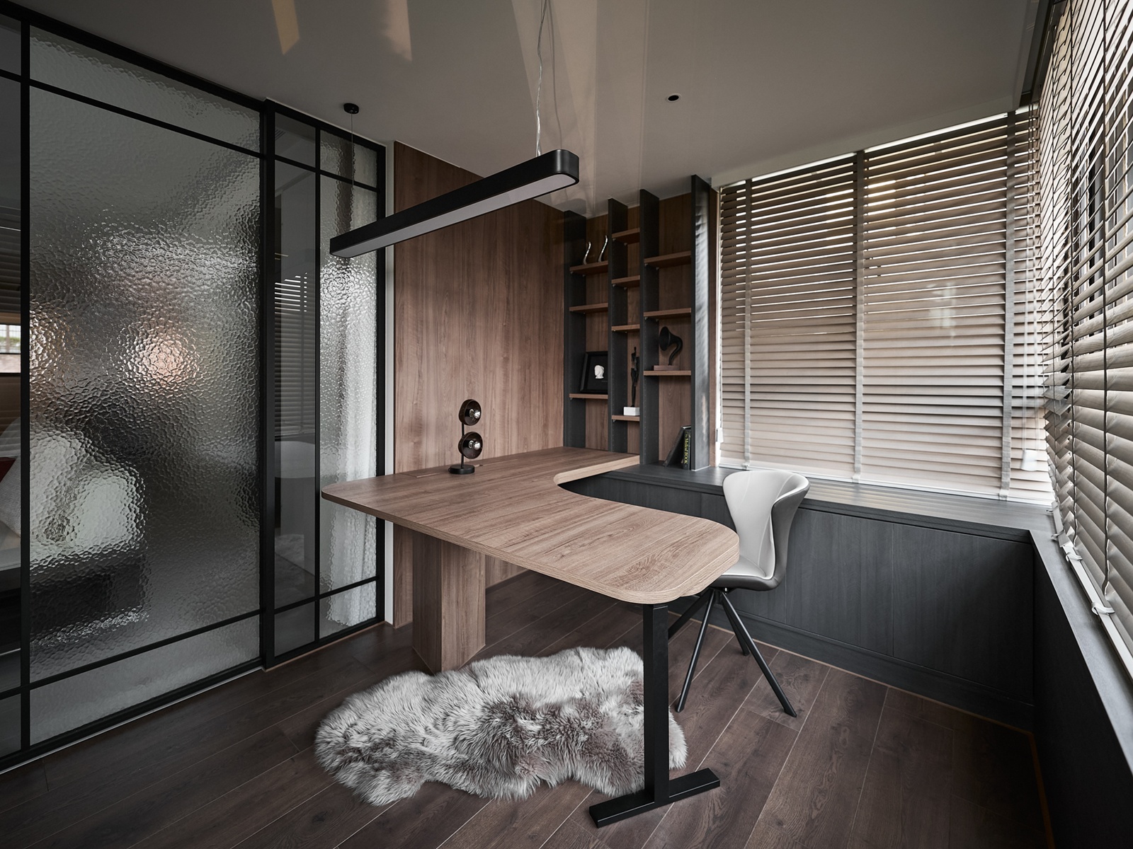 公領域以明鏡作為視覺延伸,巧妙隱藏儲藏室機能,兼具實用性與美感。客廳主牆選用大理石鋪陳,搭配同材矮櫃,勾勒出沉穩且具視覺焦點的立面質感。沙發背牆則融合石紋展示櫃、清水模立面與拉絲金屬美耐板,搭配隱藏式軌道燈,展現材質與光影層層交織的視覺效果。另外,餐廳天花採圓弧語彙結合造型燈飾,於清水模質感中增添柔雅藝術氣息;書房透過鋁製玻璃門界定場域,並設計轉角系統矮櫃與造型書桌於一體,打造靜謐專注的閱讀氛圍。