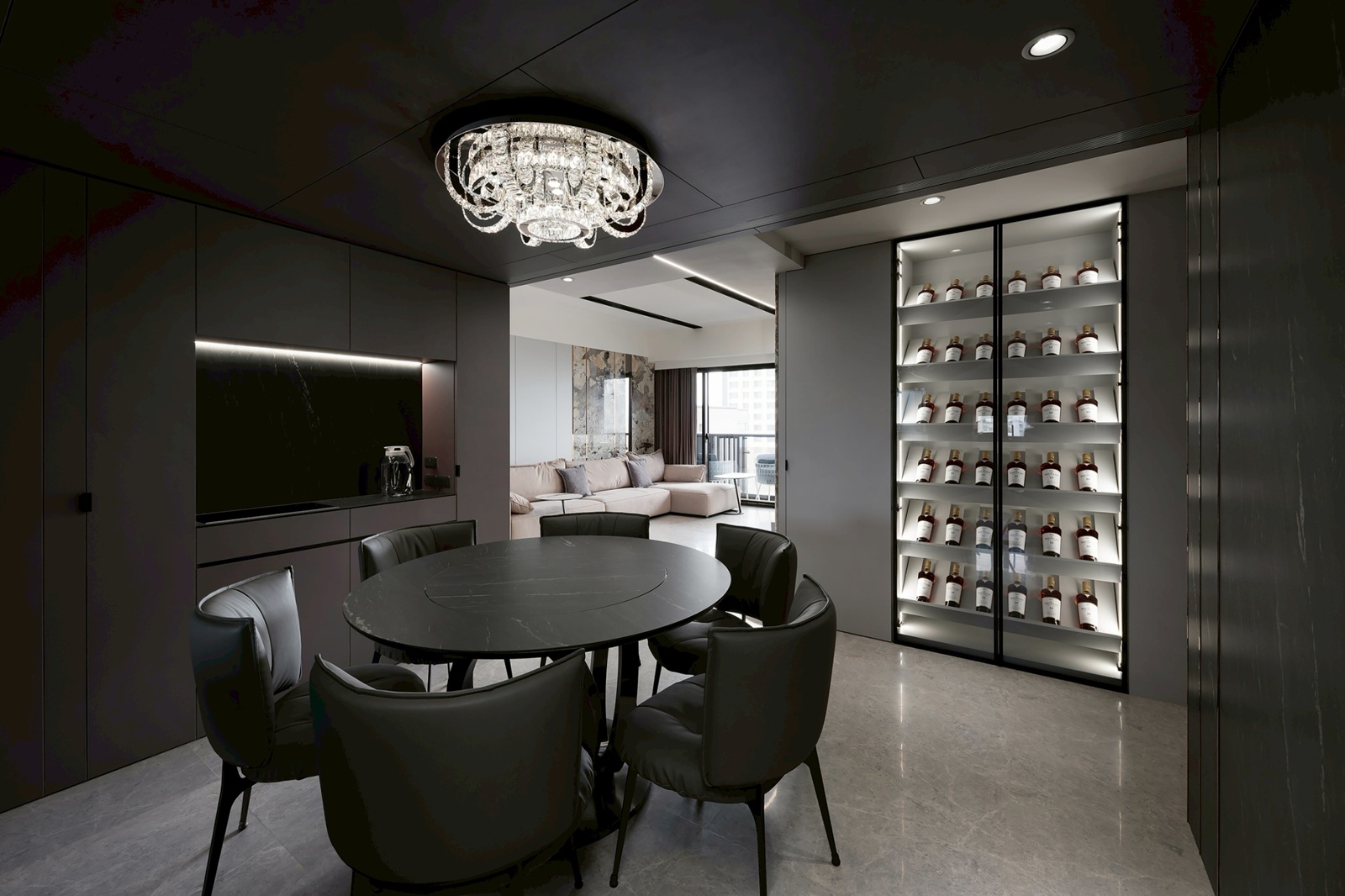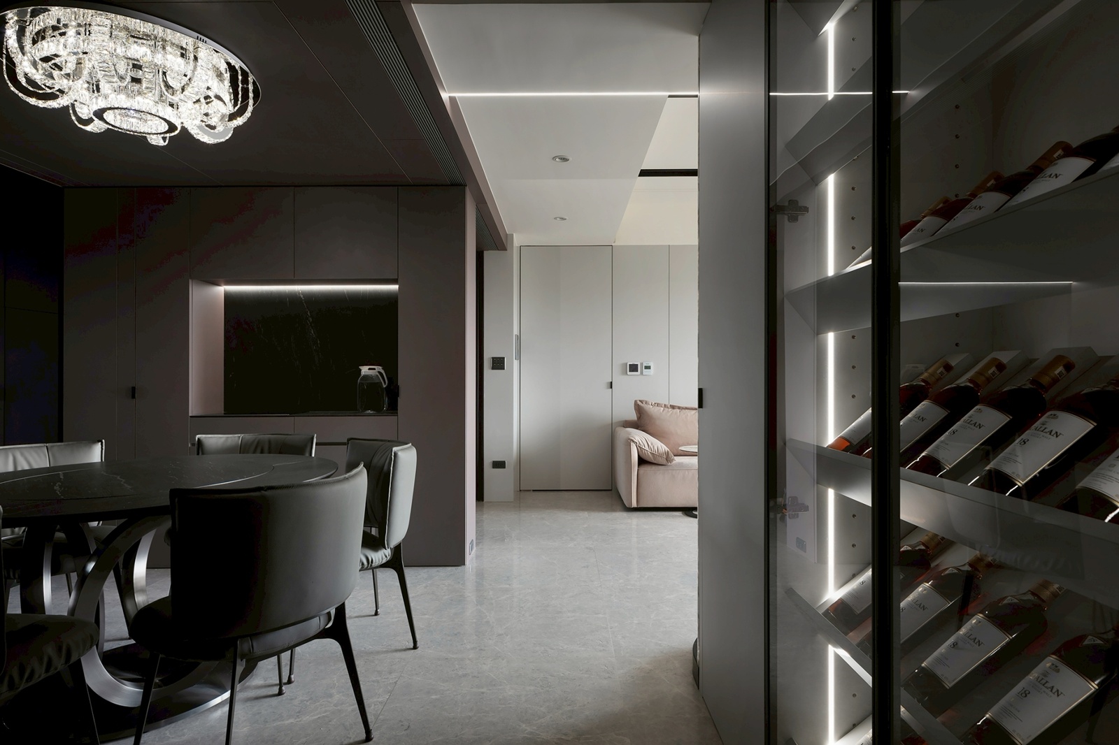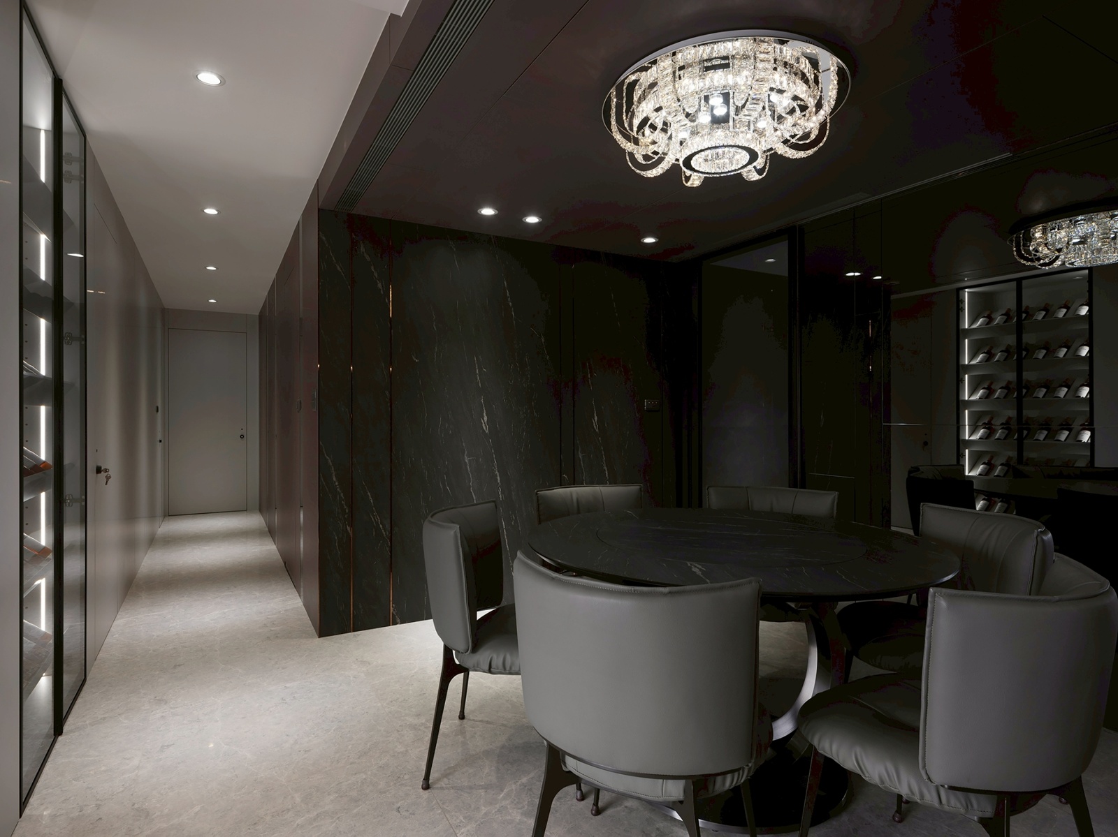色彩配置上,客餐廳統一以深淺色調區分場域,藉由視覺設色引導動線。廚房依據屋主生活習慣量身規劃,整合客製化廚具與現代風韻,並於一側設置落地玻璃酒櫃,珍藏佳釀盡收其中。浴室區域延伸精品飯店語彙,配備有大面鏡櫃、灰玻隔間及墨黑板材,濃淡連延,營造黑白錯落的洗鍊質感。主臥承襲公領域設計,融合繃布、鐵件與鏡面,一展華麗卓絕。更衣室則結合實用收納與展示功能,統一風格語境。