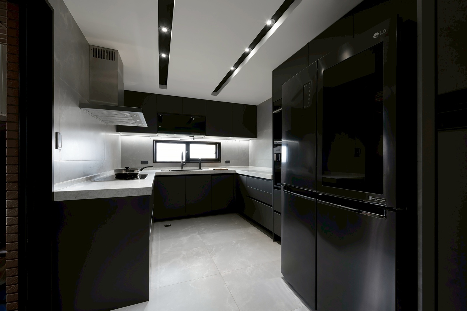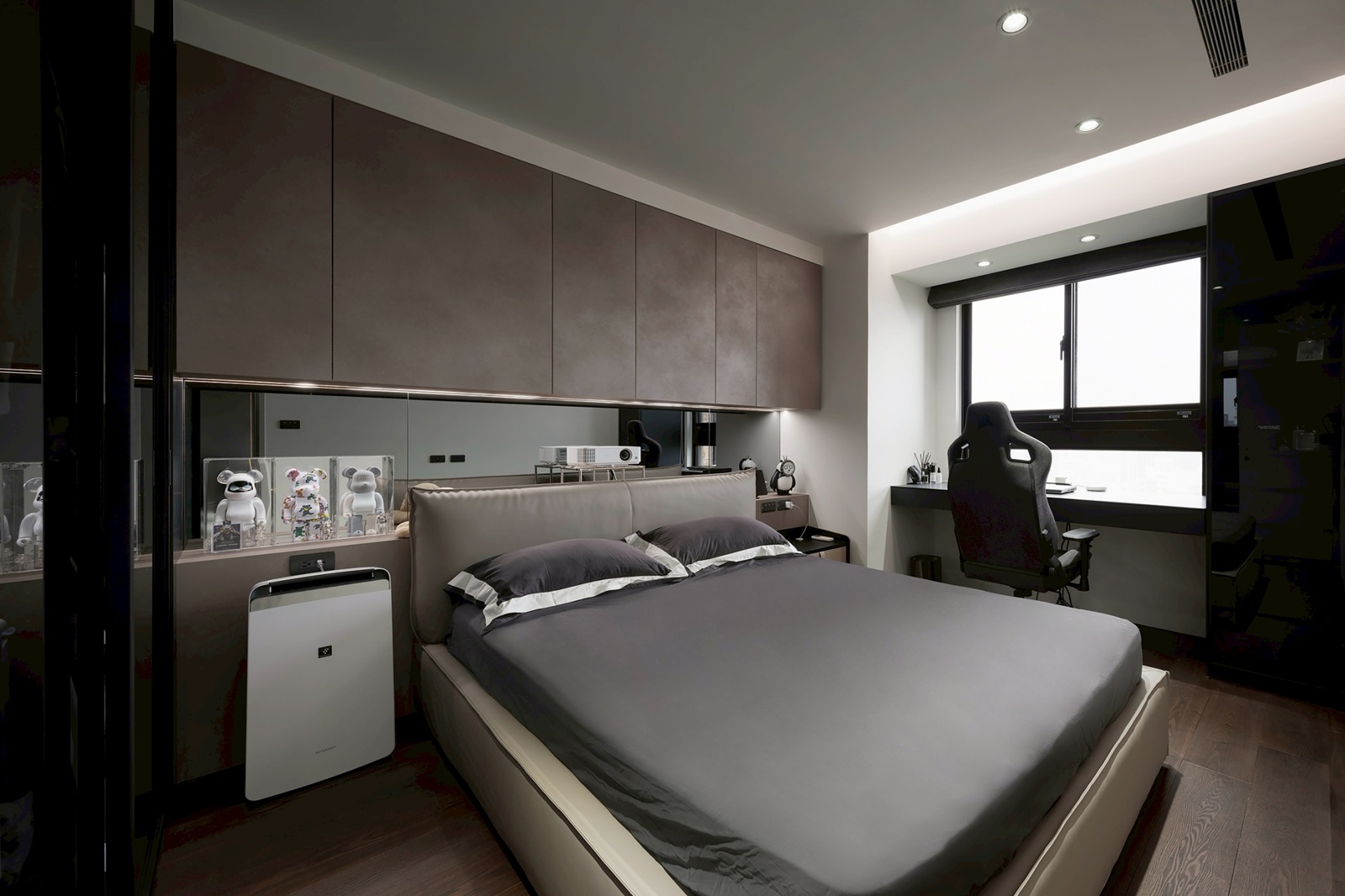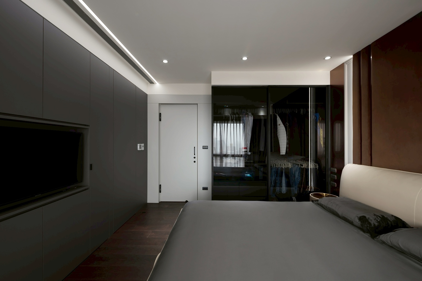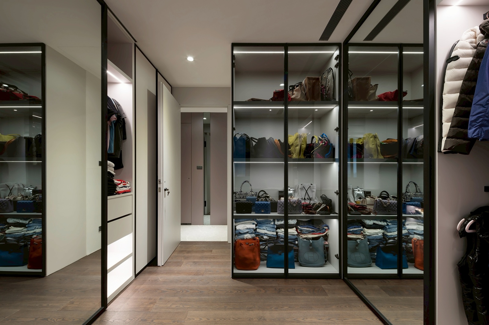 色彩配置上,客餐廳統一以深淺色調區分場域,藉由視覺設色引導動線。廚房依據屋主生活習慣量身規劃,整合客製化廚具與現代風韻,並於一側設置落地玻璃酒櫃,珍藏佳釀盡收其中。浴室區域延伸精品飯店語彙,配備有大面鏡櫃、灰玻隔間及墨黑板材,濃淡連延,營造黑白錯落的洗鍊質感。主臥承襲公領域設計,融合繃布、鐵件與鏡面,一展華麗卓絕。更衣室則結合實用收納與展示功能,統一風格語境。