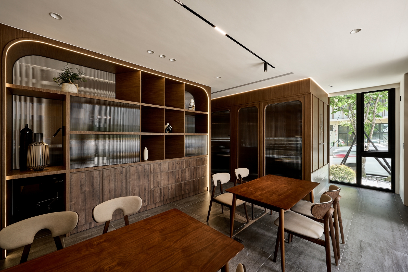 門面藉實木板材細膩鋪敘,結合大面臨窗導引天光,使室內流露沉靜明澈的場域氣質。入口立面融入枝葉形構的標誌設計,佐以霧白磁磚,創造雲霧氤氳的柔潤意象,亦呼應整體設計語彙。辦公區主燈採光膜設計,描繪天井般的通透光影,使空間流露柔潤且恆定的亮度。依循視線望去,茶水間採淡白檯面和磁磚構築,勾勒出溪澗流動的輕盈意境,使場域於理性結構中流露自然情懷。