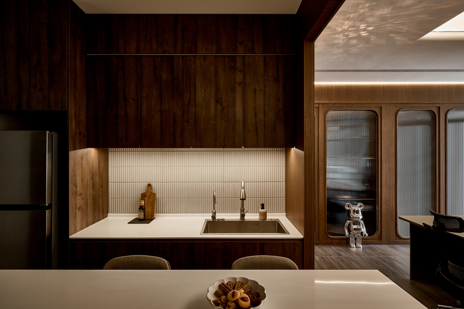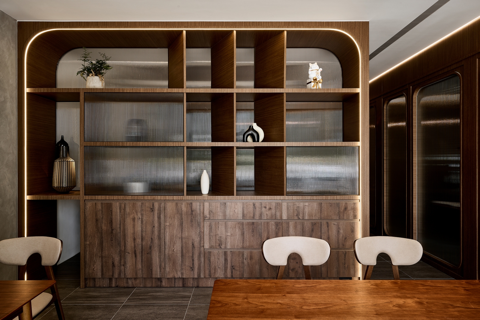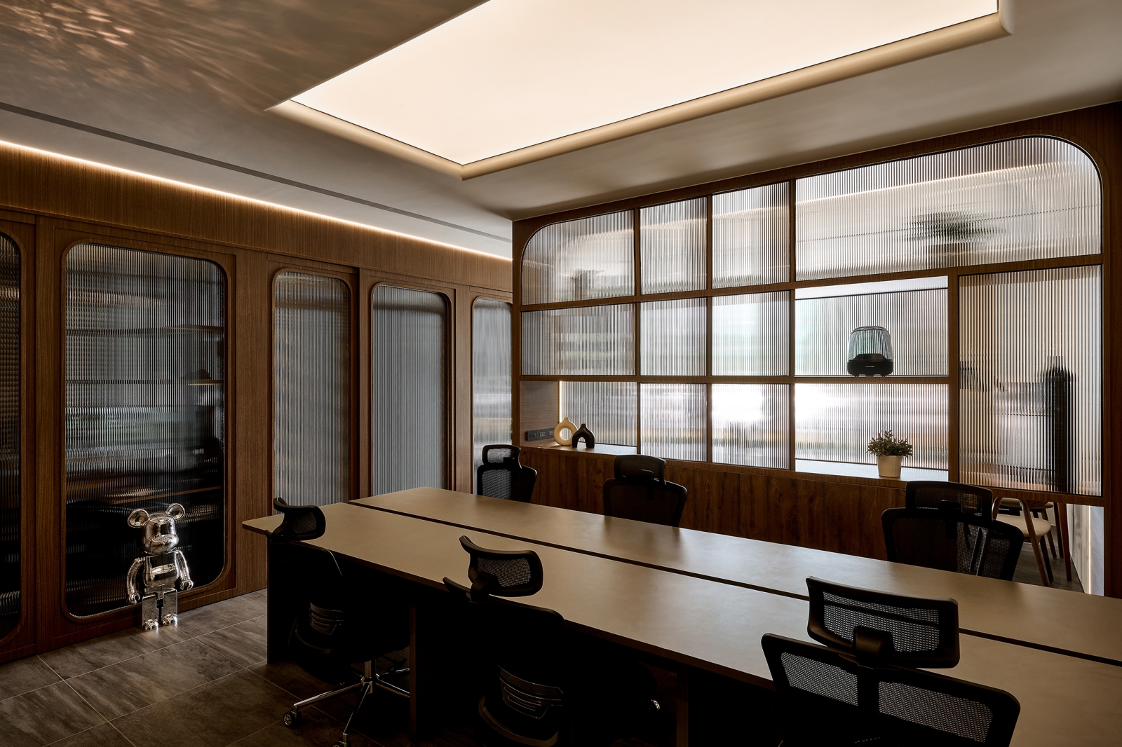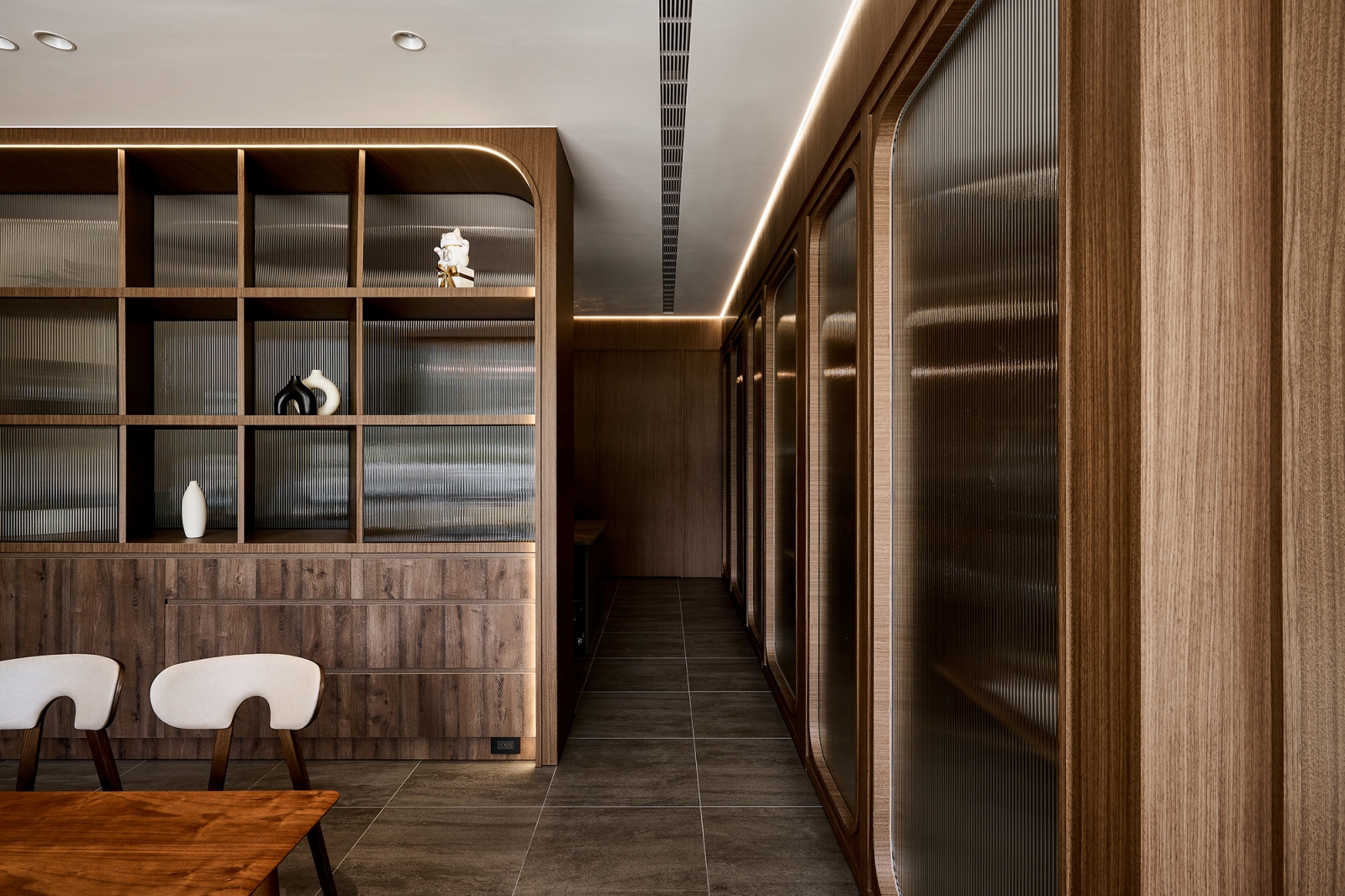 設計以實木皮暈染調配空間色澤,當光線掠過自然肌理,描摹深淺錯落的細膩層次。氛圍燈鋪展場域,照亮柔潤且穩定的光色節奏,使整體環境於明暗交織間保有專注節奏。此外,長虹玻璃作為關鍵元素,其霧化質地延續柔光特性,兼顧明亮採光與隱私需求,同時以半透之姿調和空間界線,使場域輪廓於朦朧光暈中相融,凝聚舒心且清新的空間氣息。