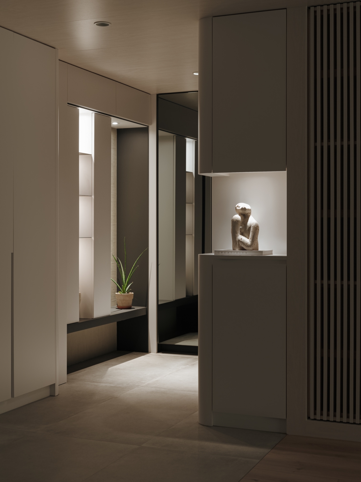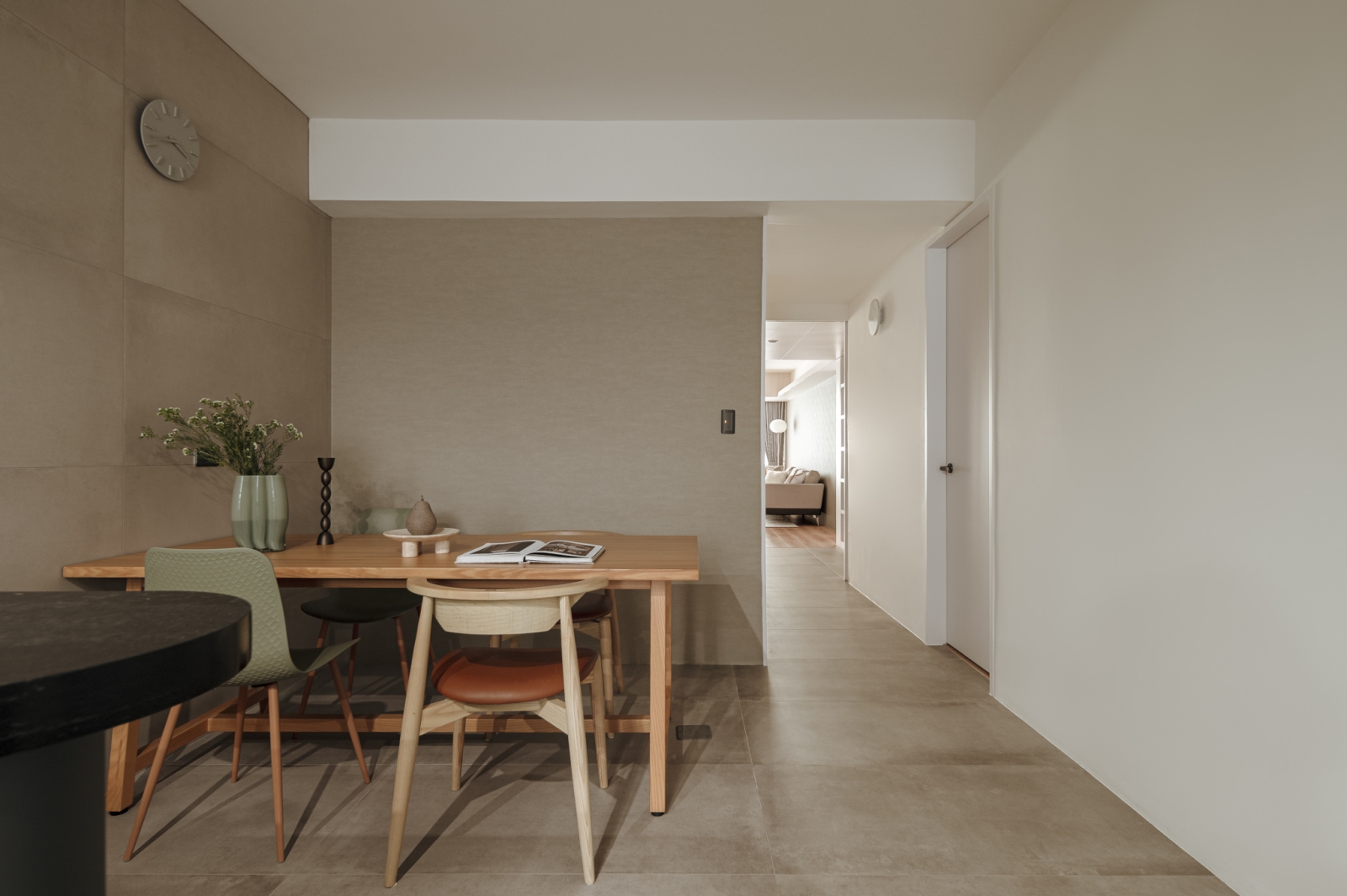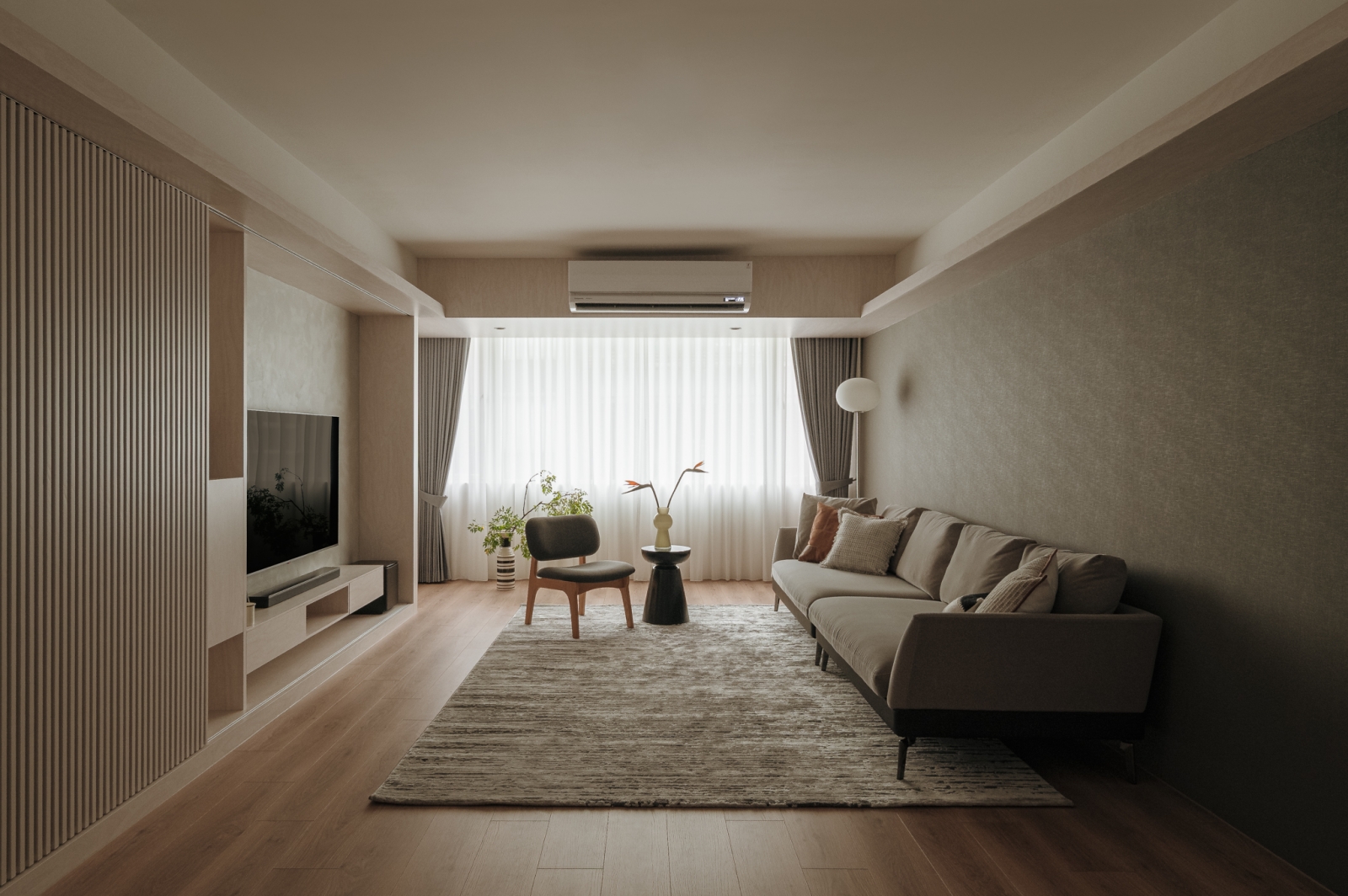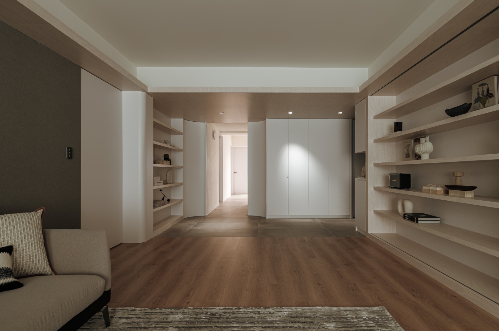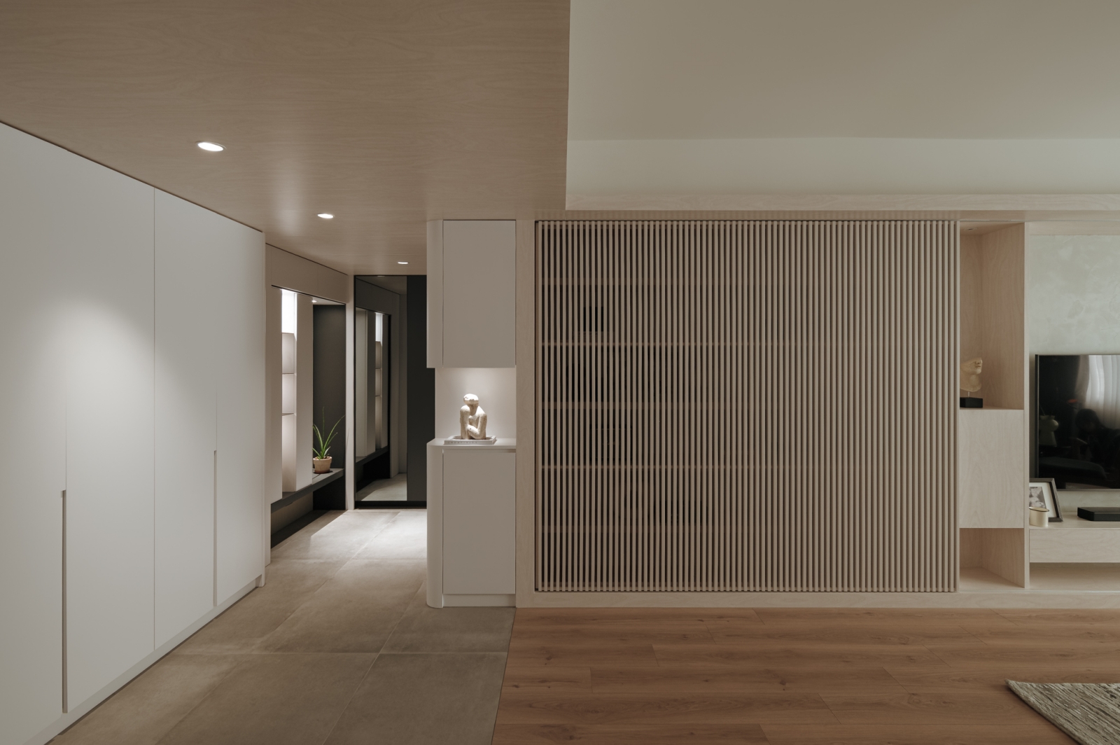 玄關區域擴大原有廊道,將視覺動線有效引導至客廳。同時於通往私領域轉折處設置隱藏門,使空間劃分更具彈性,確保臥室的靜謐與作息品質。室內場域以木紋與大地色系鋪陳,客廳主牆面劃分為書櫃、影音牆與端景展示三大機能區,並透過格柵滑門靈活調整開合,使機能與美感並存。