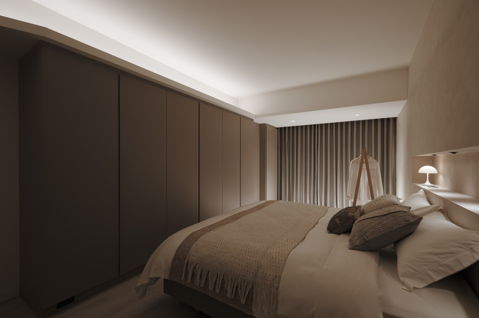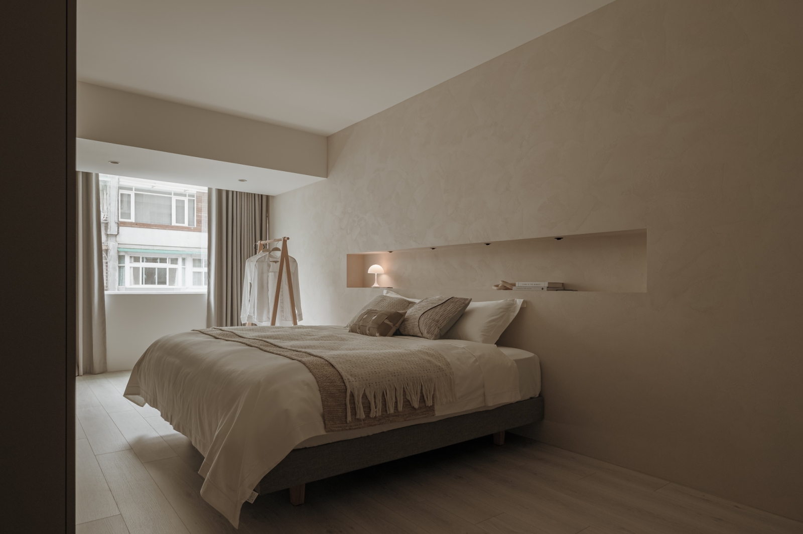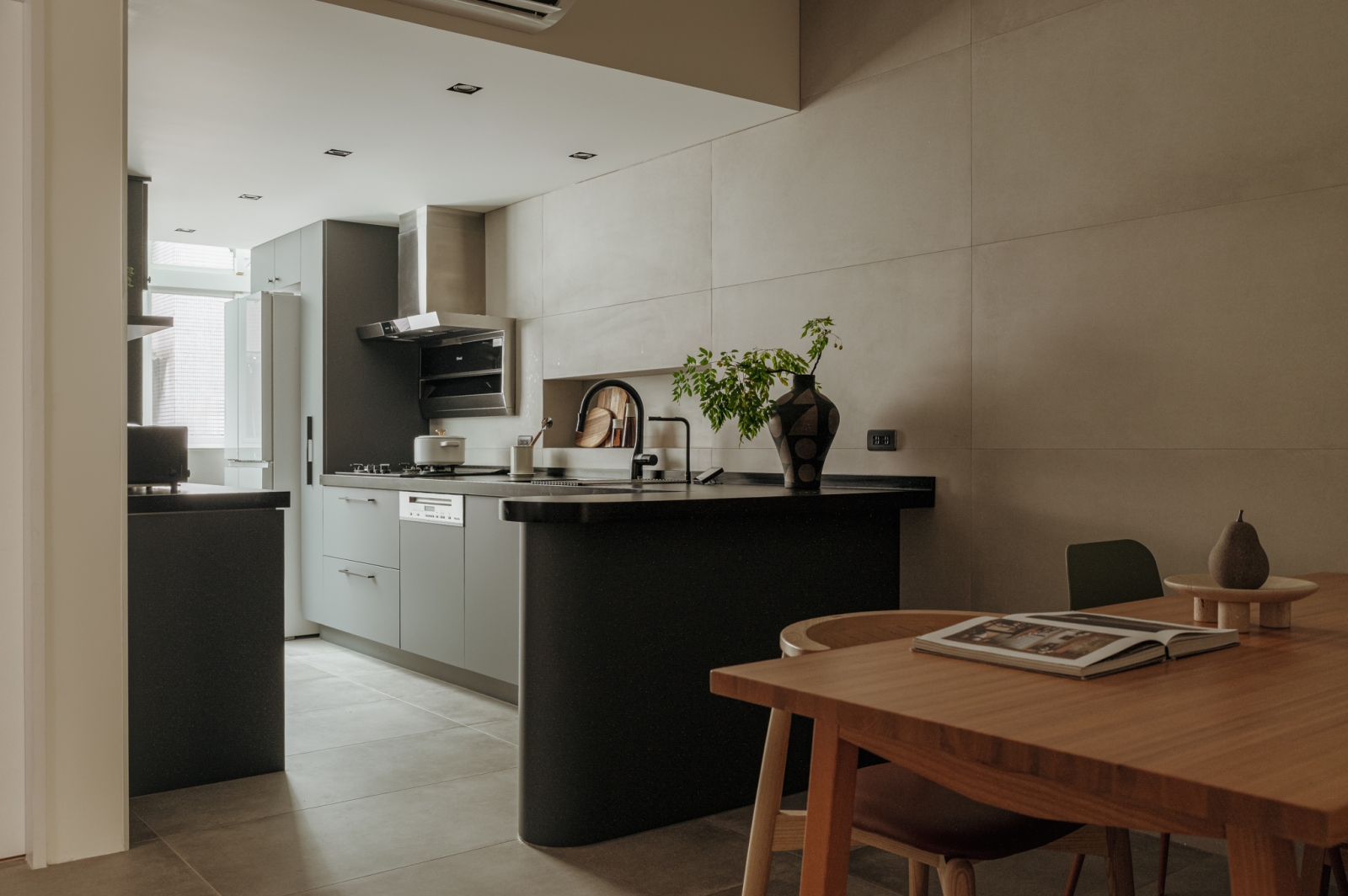 餐廚區採開放式設計,搭配小型中島,提升使用便利性與生活儀式感。深色廚具搭配低彩度磁磚,呼應空間整體風格。主臥牆面採用樂土塗佈,形塑安靜、沉穩的休憩氛圍。並依照現階段家庭需求進行規劃,為兼顧夫妻與幼兒共眠之安排,特別延伸床頭尺度,並預留未來恢復雙人生活的彈性配置。