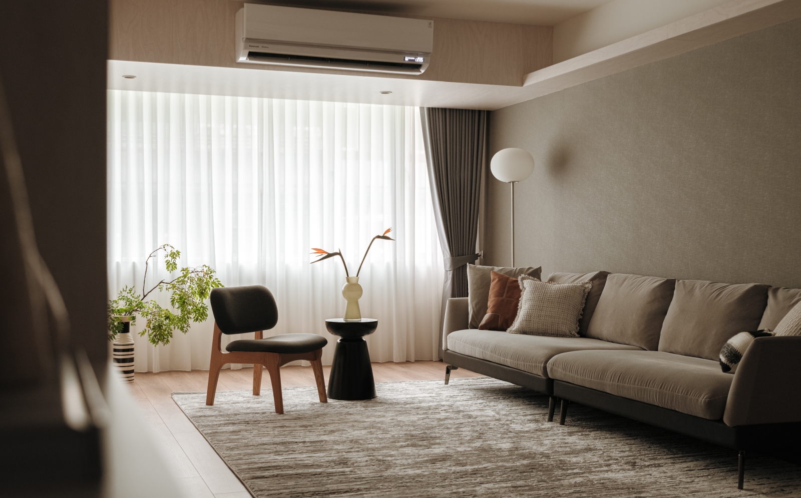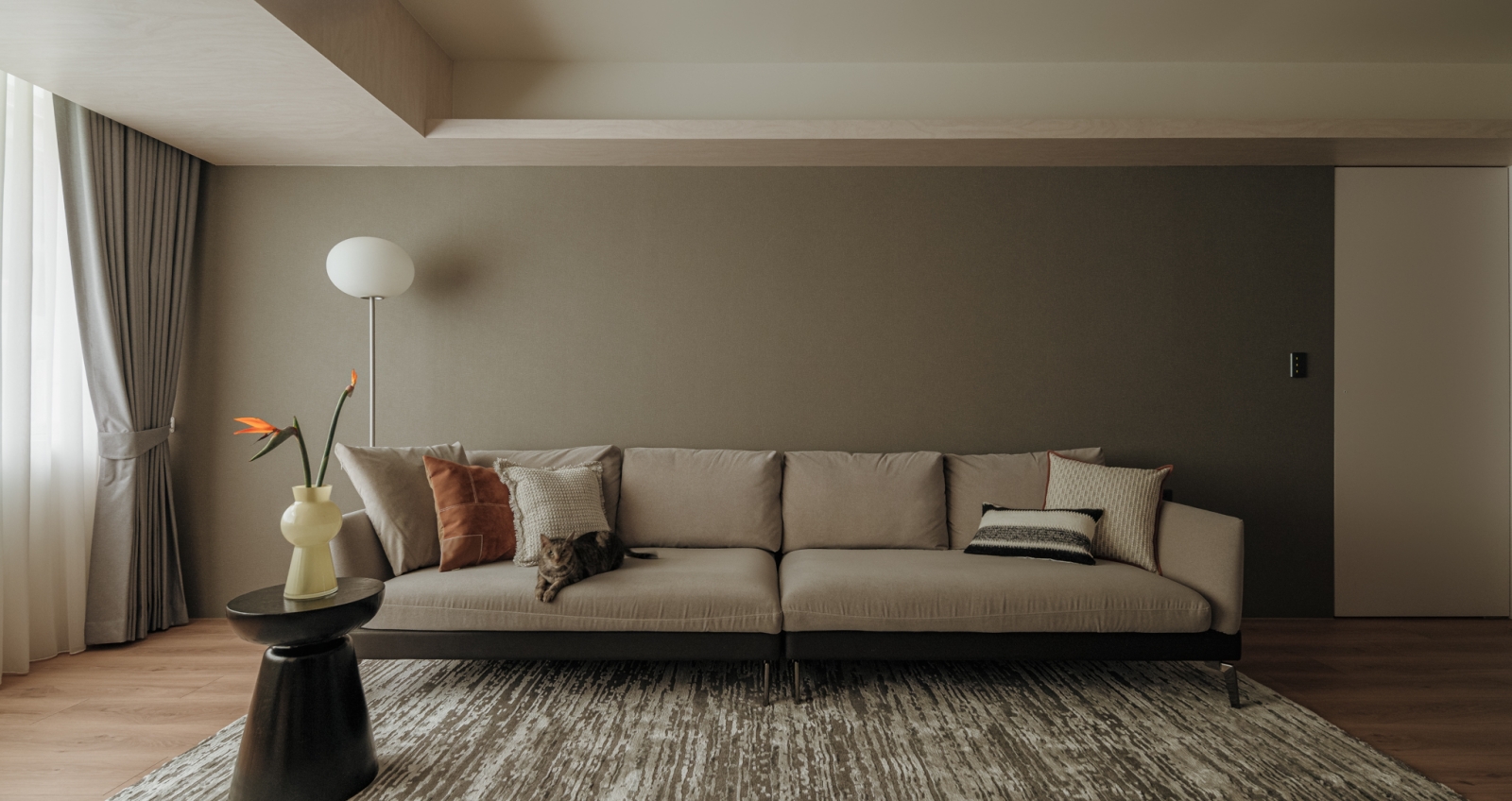 本案貫徹永續設計理念,選用Formica CORA系列淺色木紋美耐板、Formica Fenix廚具用美耐板,以及AICA純白色美耐板。地坪部分,客廳與各臥室皆鋪設Alsafloor超耐磨木地板,具備良好的耐用性與環境認證。客廳電視主牆與主臥壁面採用台灣在地品牌「樂土」塗料,其原料來自水庫淤泥的資源再生技術,近年更融入南台灣廢棄蚵殼,實踐廢料再利用的循環精神,展現深具在地文化與環保價值的設計態度。