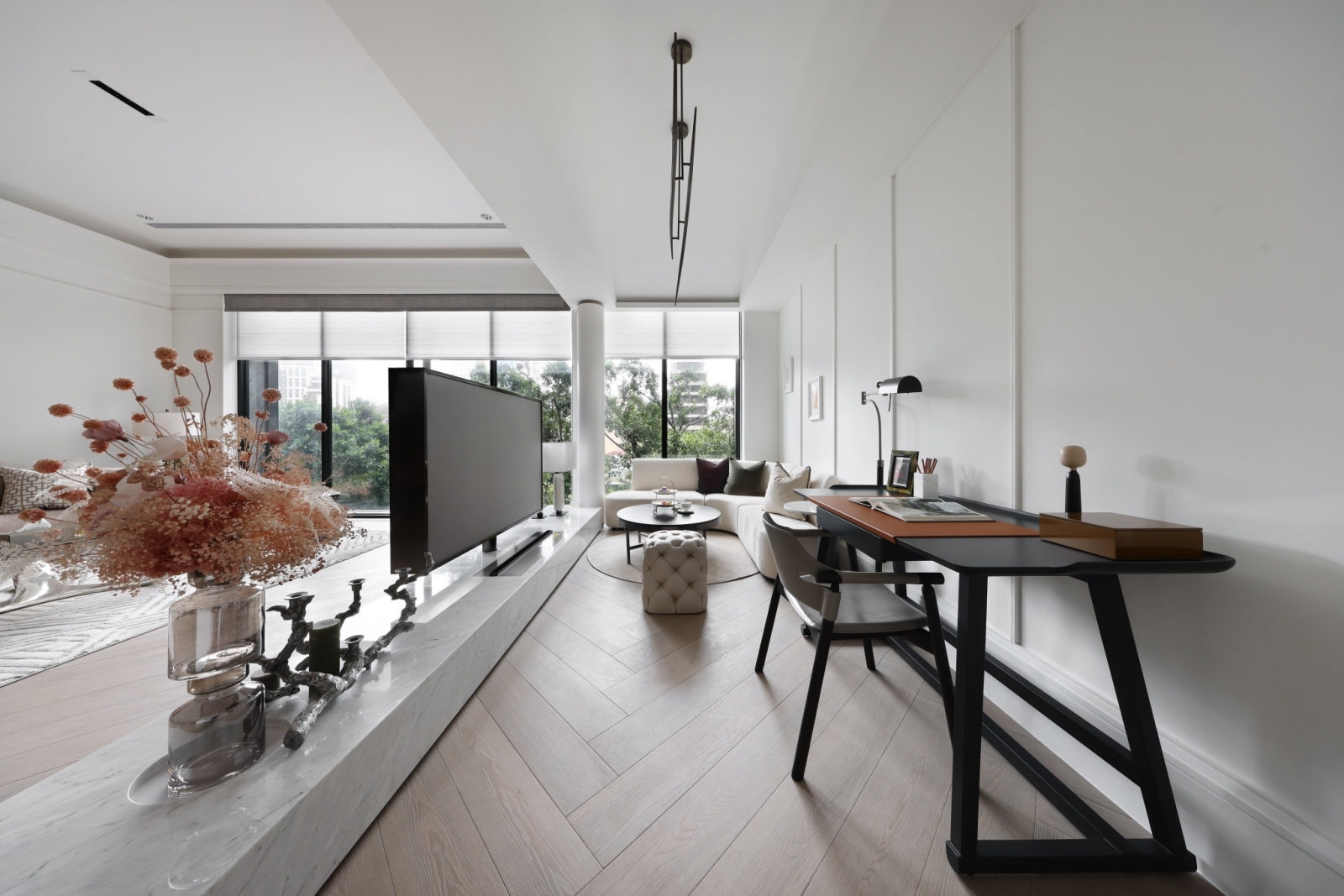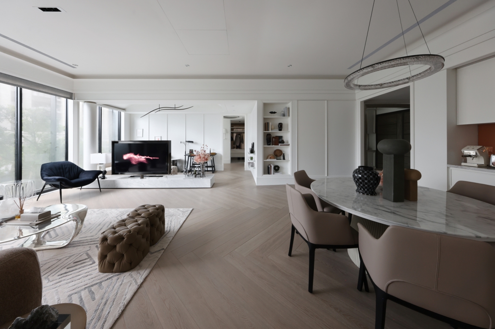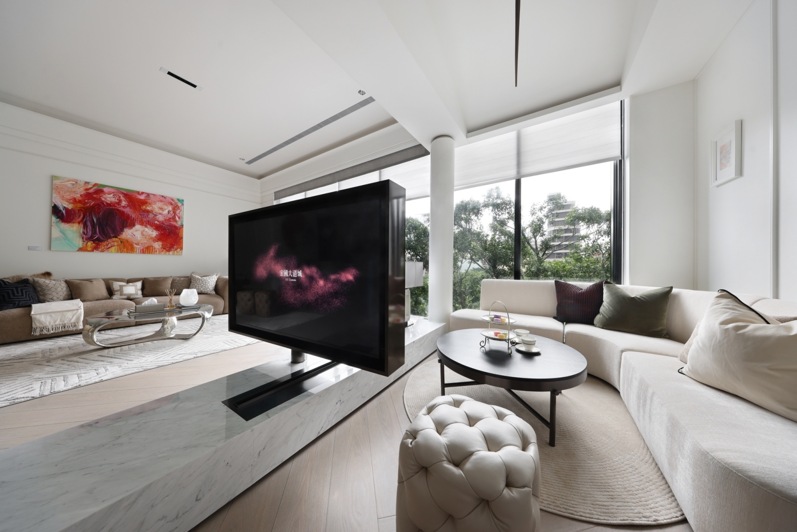 甫入室內,整體場域以簡潔且優雅的美學為基礎,選用溫潤的石材、人字拼木地板,搭配柔和的燈光與大地色調,營造出溫暖又富有現代感的氛圍。牆面上的抽象藝術畫作與流線型燈具相互呼應,展現精緻的藝術氣息,增添了視覺上的層次與美感。客廳運用旋轉電視柱的設計,避免了傳統電視牆帶來的空間壓迫感。而可旋轉的功能使電視可靈活調整角度,讓居者自由選擇觀賞位置,提升實用性與舒適度。此外,大面積的落地窗將蒼翠綠意引入室內,呈現都會生活與自然共生的和諧意境。
