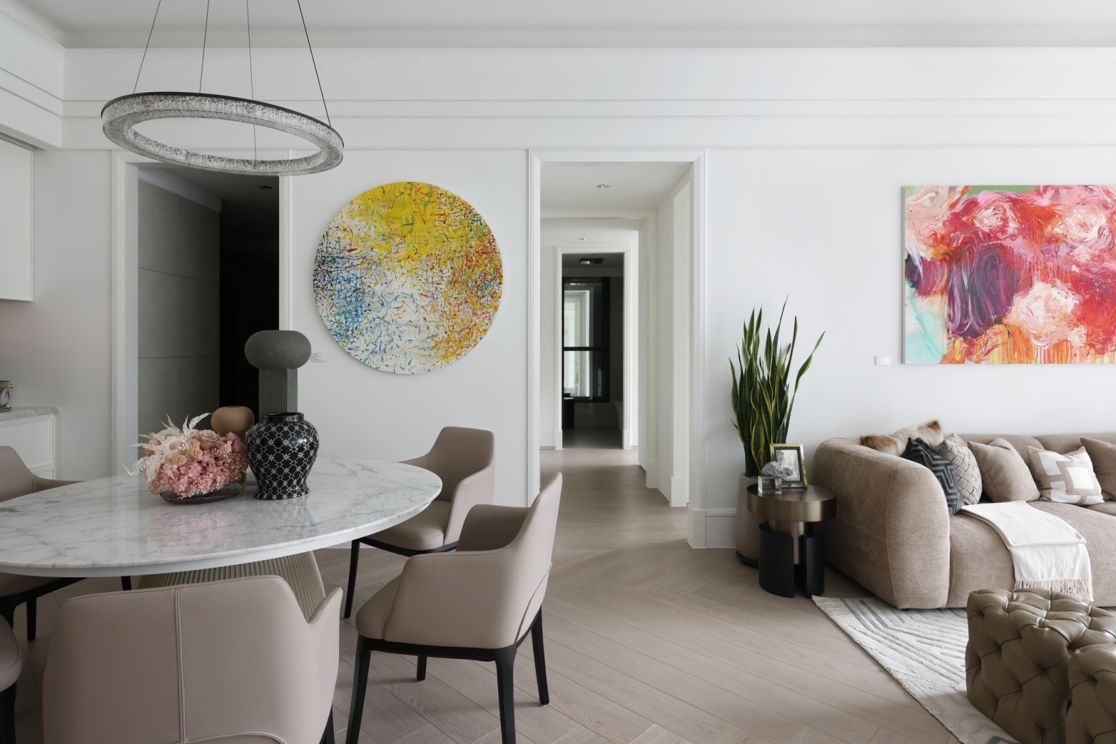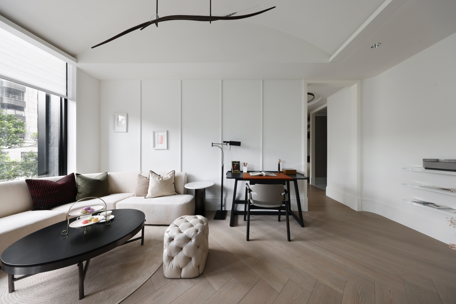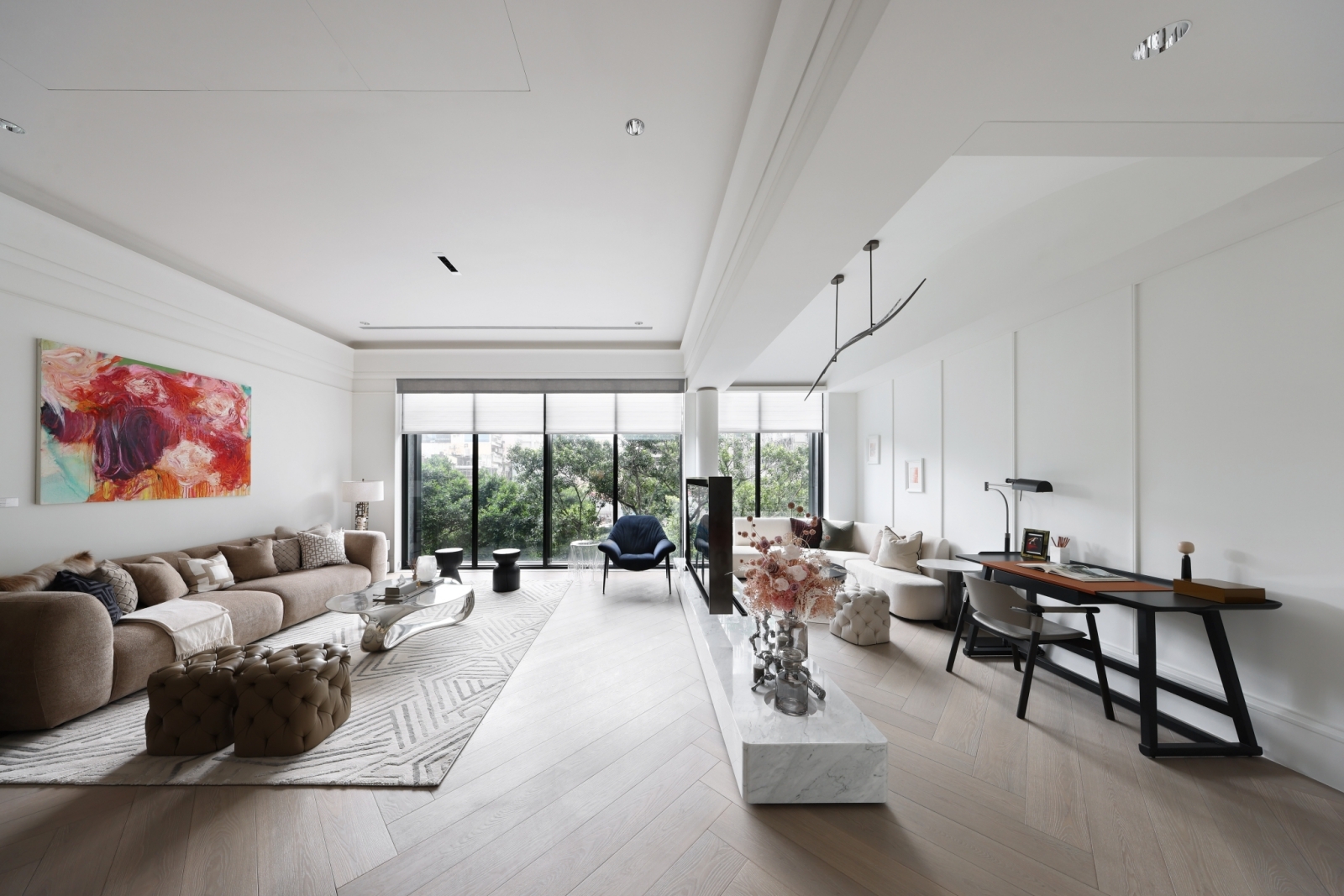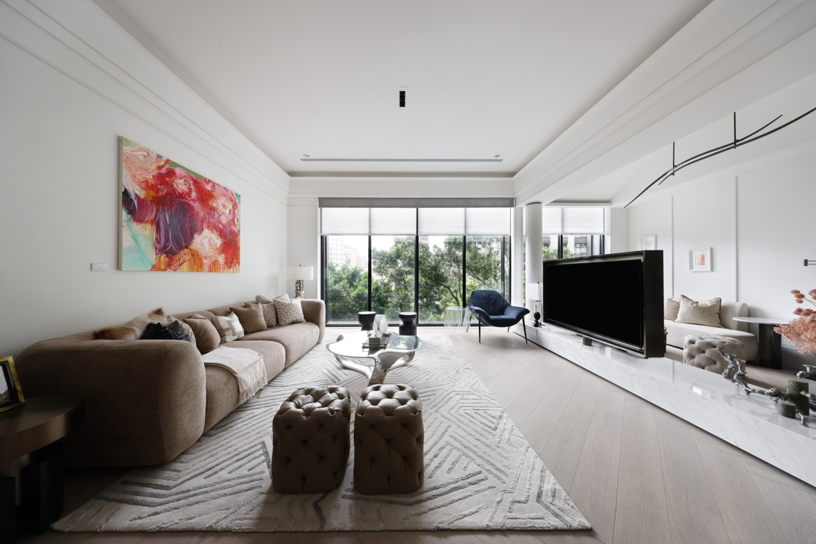 甫入室內,整體場域以簡潔且優雅的美學為基礎,選用溫潤的石材、人字拼木地板,搭配柔和的燈光與大地色調,營造出溫暖又富有現代感的氛圍。牆面上的抽象藝術畫作與流線型燈具相互呼應,展現精緻的藝術氣息,增添了視覺上的層次與美感。客廳運用旋轉電視柱的設計,避免了傳統電視牆帶來的空間壓迫感。而可旋轉的功能使電視可靈活調整角度,讓居者自由選擇觀賞位置,提升實用性與舒適度。此外,大面積的落地窗將蒼翠綠意引入室內,呈現都會生活與自然共生的和諧意境。