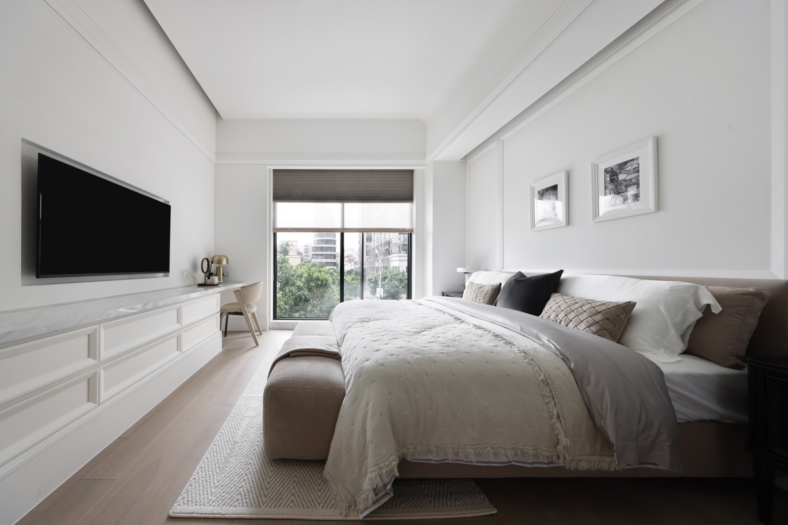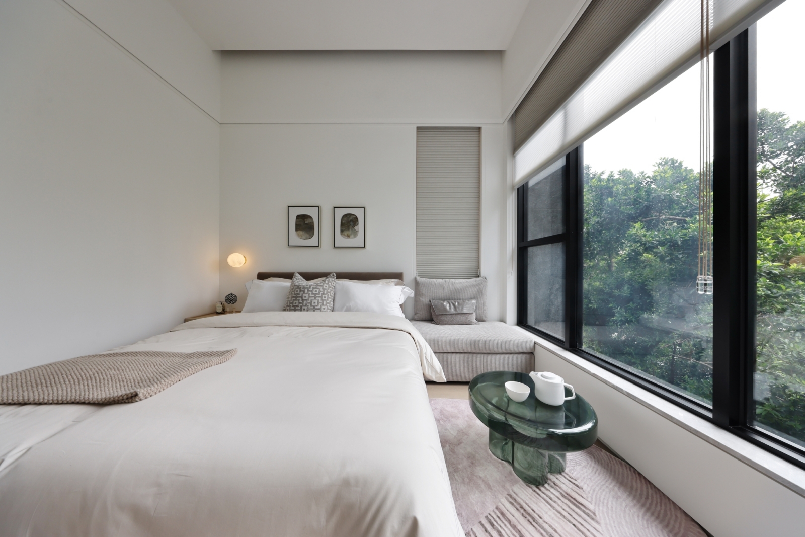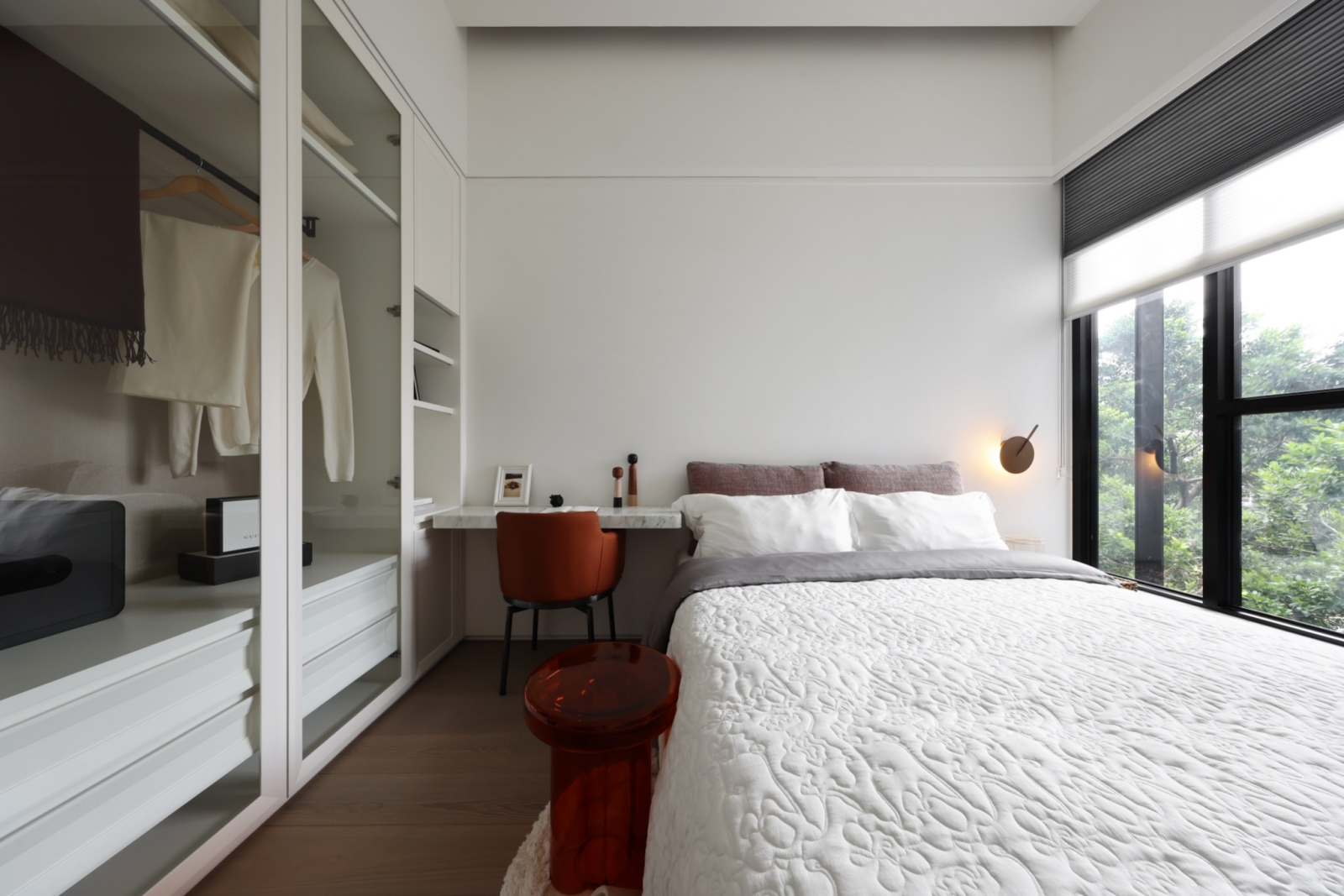 用餐區設置了一張大圓桌,並為四周保留充足的走道空間,確保居者能活動自如。於造型燈飾優美的光線下,為居者帶來高雅的用餐環境。餐桌旁的餐櫃提供靈活的收納機能,可擺放餐廚器具與電器用品,讓居者便於隨手取用。緩步移至私領域,三間臥室皆以潔白的牆面搭配木質地板,締造寧靜、愜意的氛圍,提供居者清新簡約的休憩場域。