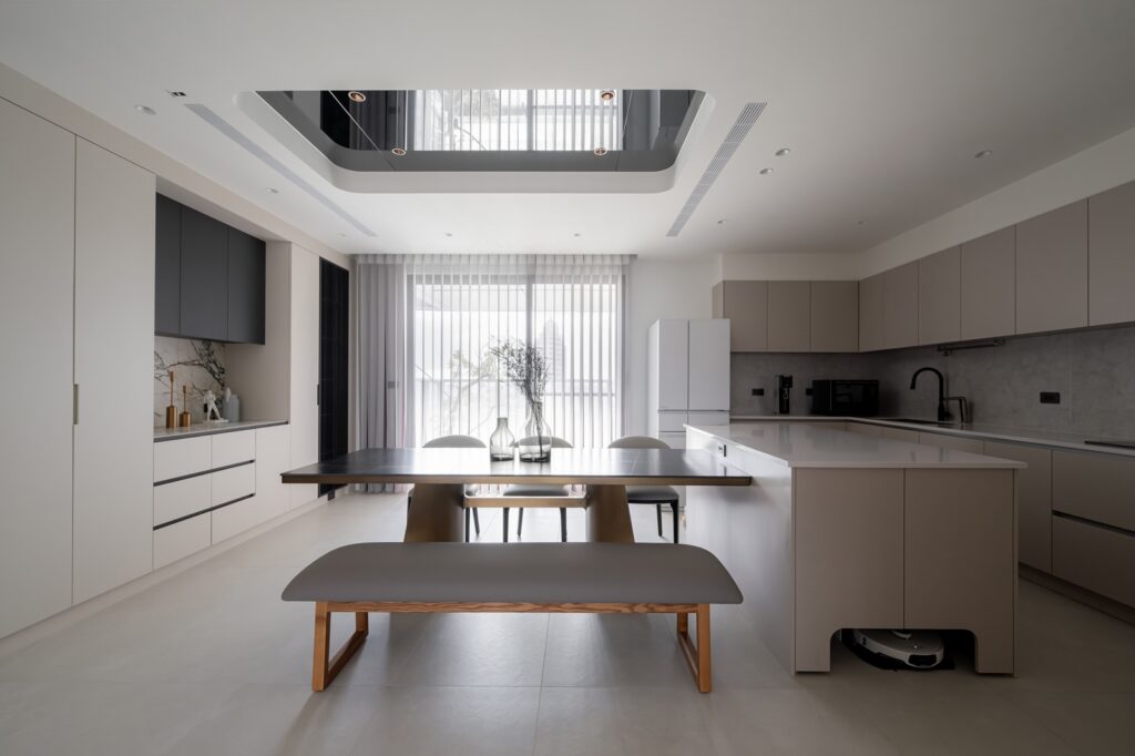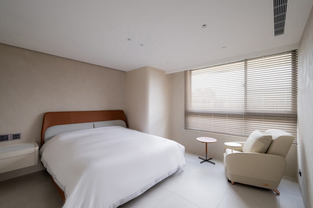 公領域採義大利礦物塗料搭配奶油色弧面牆體,營造自然漫射光感;電視牆整合隱藏式收納與圓弧轉角,維持整體純淨感受。餐廚區以中島銜接用餐與生活動線,採「無銳角」設計,兼顧安全性與溫潤觸感。臥室方面,藉低差照明與塗料肌理的細緻層次,勾勒靜謐深邃的休憩氛圍。