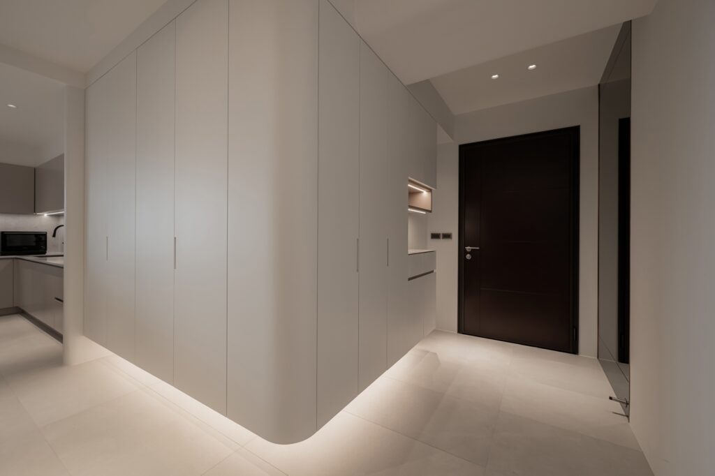設計運用弧形語彙貫穿全室,從玄關櫃角到進門量體轉折,皆以圓潤線條取代方正結構,使視覺動線更為連貫,亦帶來心理上的放鬆與安全感。團隊透過「柔性結構」使空間在理性框架中展現情感溫度,形塑專屬當代奶油風的輕盈和靜謐氣質。