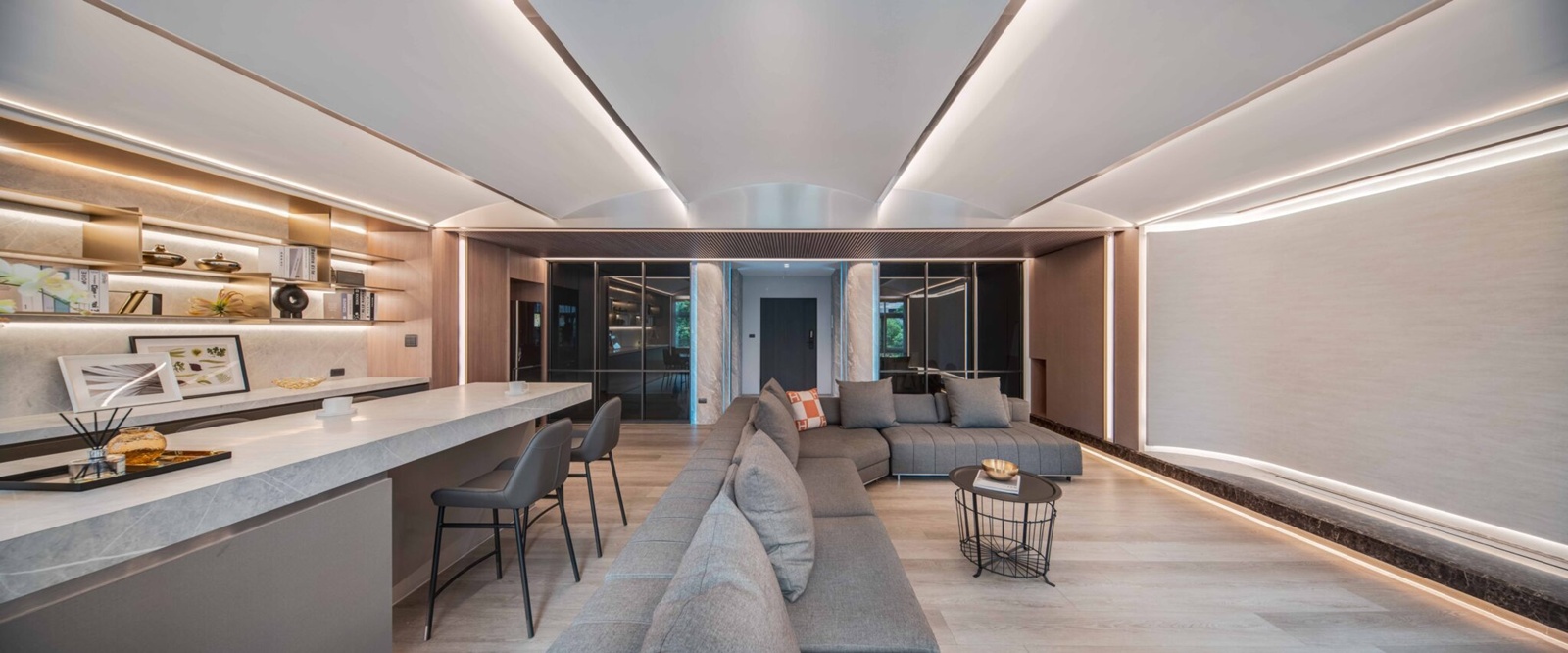 • 天花語彙:拱形層疊造型融入樑體,增添空間律動與視覺深度。