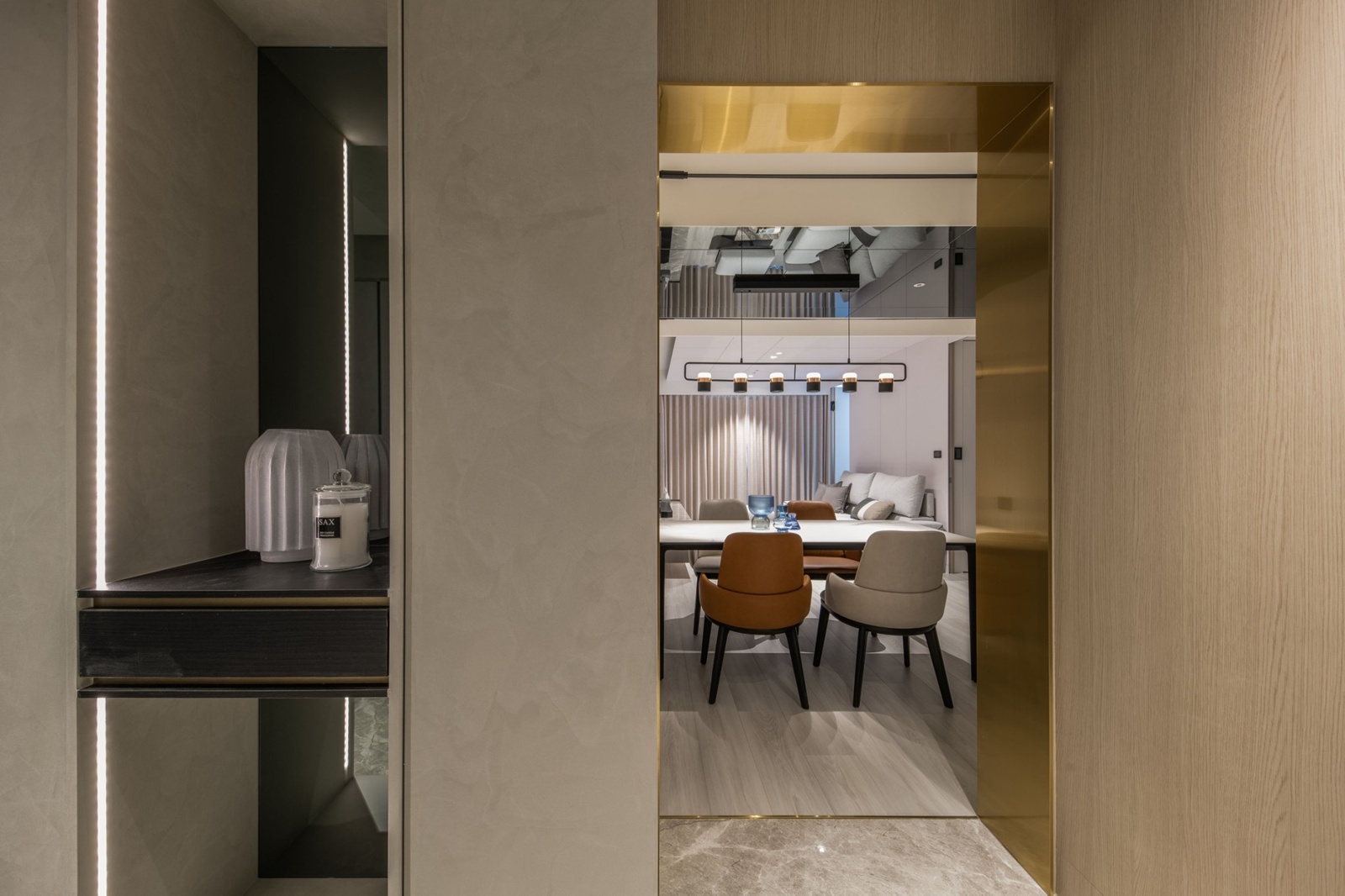 • 細節鋪排:鏡面與鍍鈦元素銜接門框與家具,增添視覺延伸與奢華氛圍。