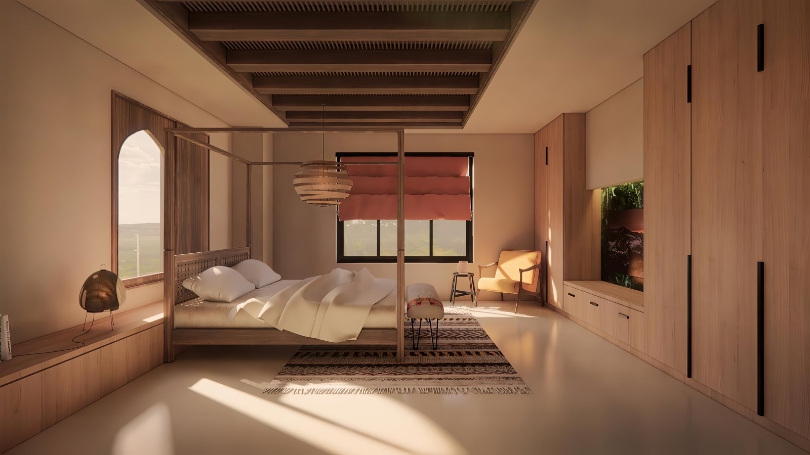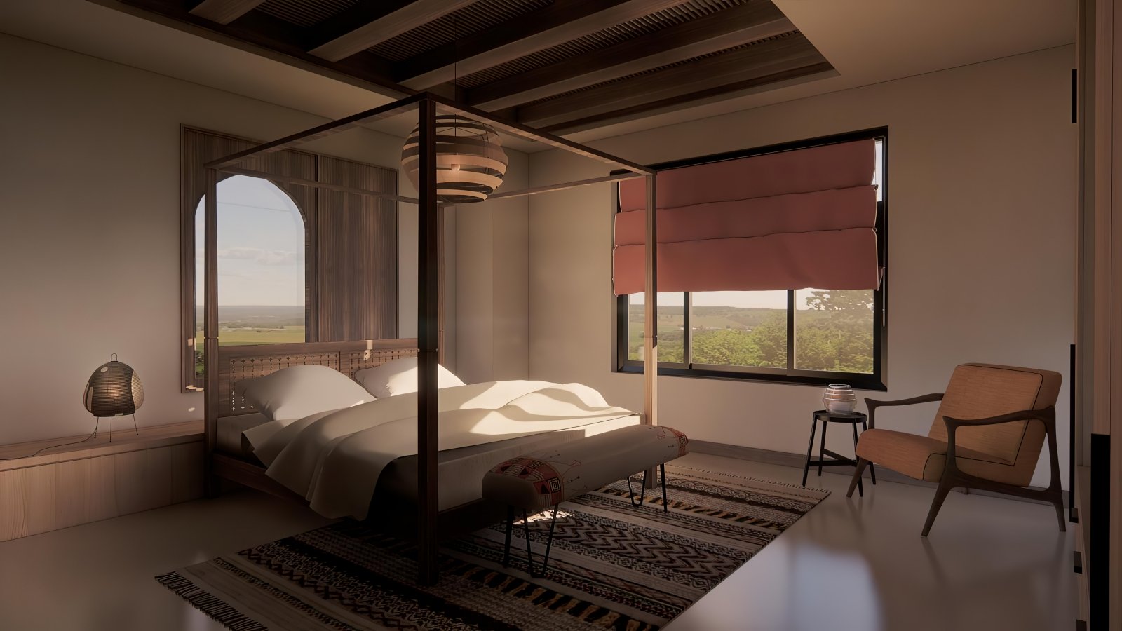 The layout involves a series of semi-open spaces, reflecting the movement in their dance and providing flexible areas that flow naturally from one to another, balancing privacy with opportunities for connection. Rich color schemes and textures inspired by the Bharatanatyam costume are applied to the FFE selection, bringing a traditional Indian flavor while also being visually accommodating for the elderly. Additionally, the modernized Hindu temple details and Jhula swing provide a sense of belonging and contribute to their emotional well-being. Large windows and indoor greenery add vibrancy, while carefully chosen furniture, including handcrafted pieces, ensures comfort and familiarity. The lighting is designed to enhance the space with both subtle ambiance and functional illumination, setting the right mood for relaxation, socializing, or quiet reflection.