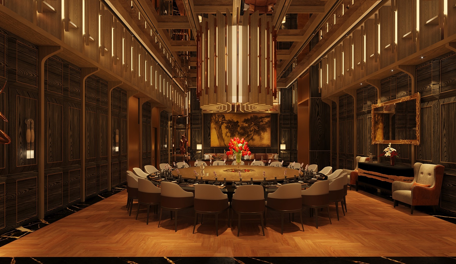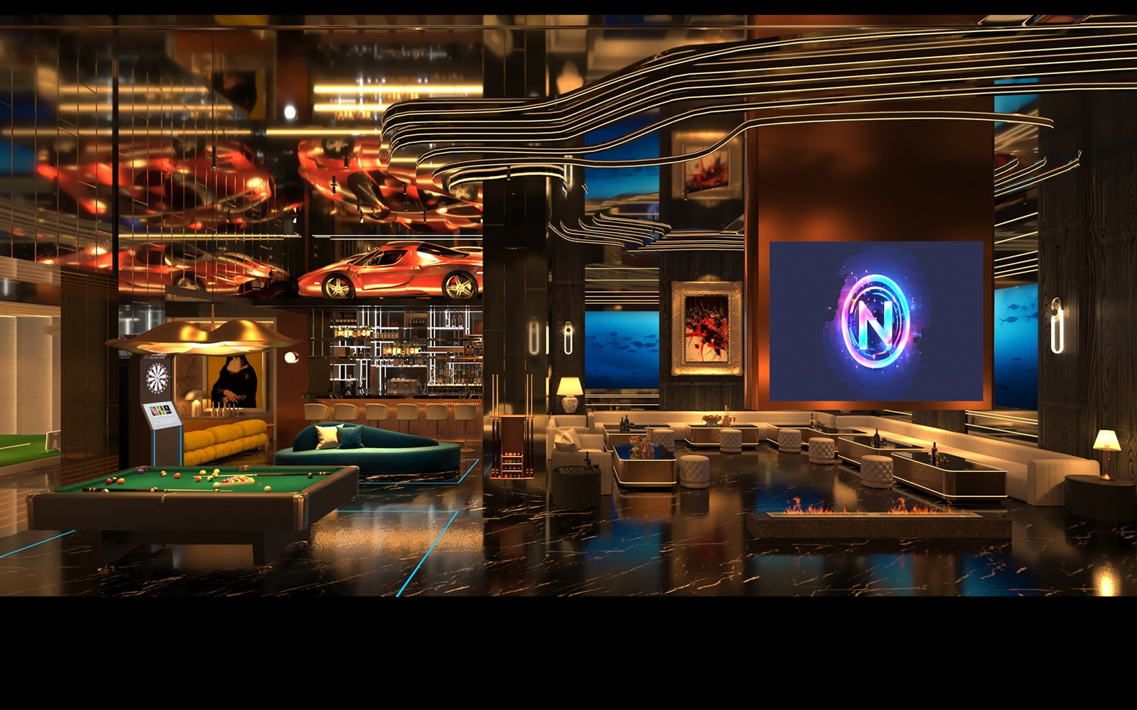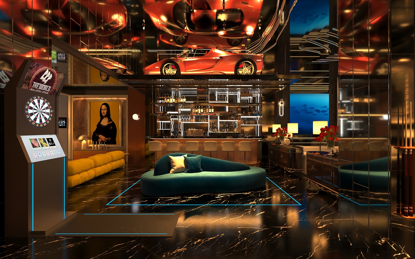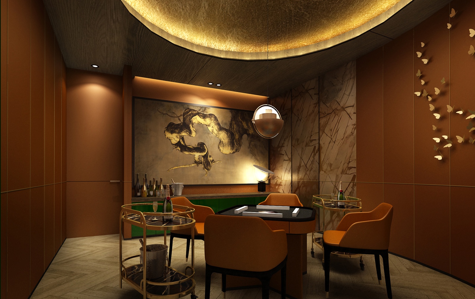 走進接待區,其是採對稱、開放的形式進行擘劃,能予人從容、舒適的入室體驗。而內部亦有設置足夠的座位供賓客、司機做使用。沿著動線進入招待會所,偌大的空間內有規劃KTV、吧台與撞球區等機能區。其中,開放式KTV與吧台區巧妙運用了別樣的天花板造型劃分出區域性。在同樣是深色反射材質的天花板,KTV的天花板是採立體等高線結合LED軟條燈做呈現;而吧台區則是以簡約的鏡面天花板做呈現,可讓整體視覺和諧又不失獨立性。置身於KTV,其座位區是以U型皮革沙發做圍塑,搭配金屬邊框的茶几。而座位區的後方有設置LED螢幕,可作為動態背景牆。再結合音樂與燈光的烘托下,便能營造出沉浸式的空間氛圍。走向吧台區,映入眼簾的即是陳設在吧台上方的法拉利車體。為妥善放置業主這一珍貴收藏,團隊特別選用鋼材打造開放式夾層結構,以確保其能安全承載車體的重量。其中,搭配隱藏式支撐結構網材,便能讓展示平台顯得輕盈的同時,又清晰呈現車輛底盤的細節。另外,層架是以傾斜的形式裝設,讓車體斜放在層架上時,能透過鏡面天花板完整反射車身。緩步移動至宴會廳,團隊特別配置直徑極寬的大型圓桌,以因應多人用餐之需求。圓桌是以大理石材、金屬面材打造而成,再搭配電動轉盤設計,能讓賓客用餐時更輕鬆、優雅。另外,由木材、金屬板製成的大型造型吊燈,可為場域增添視覺亮點,並營造高雅大氣的氛圍。