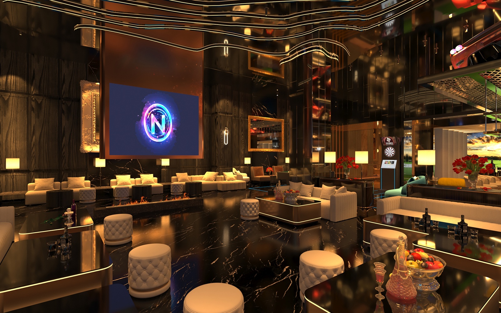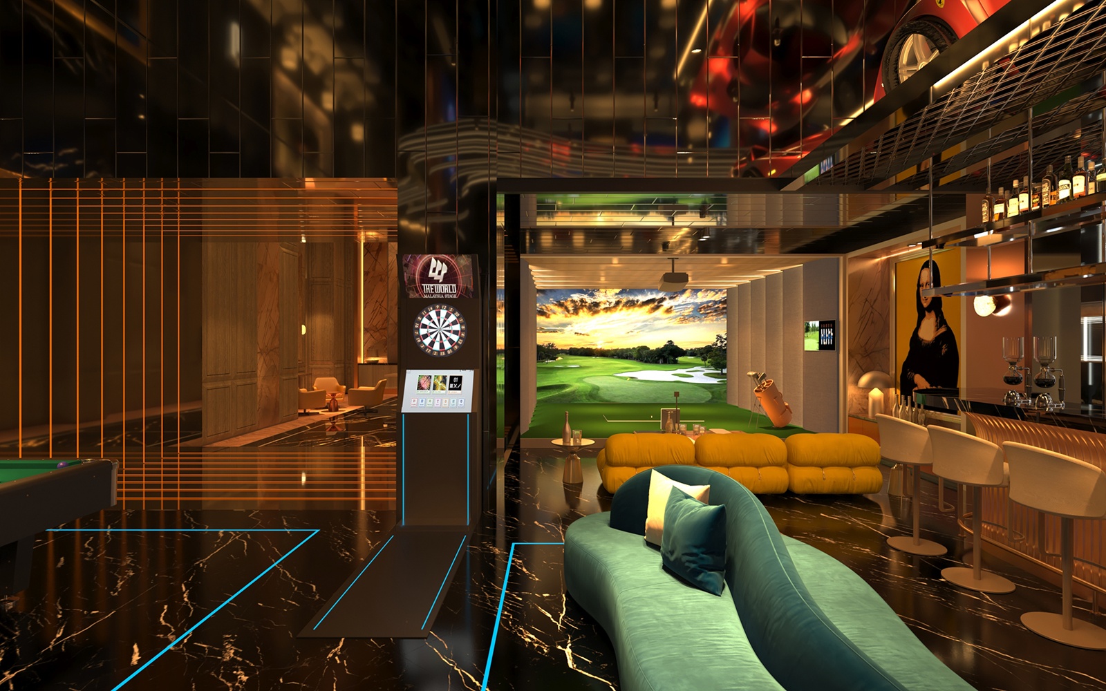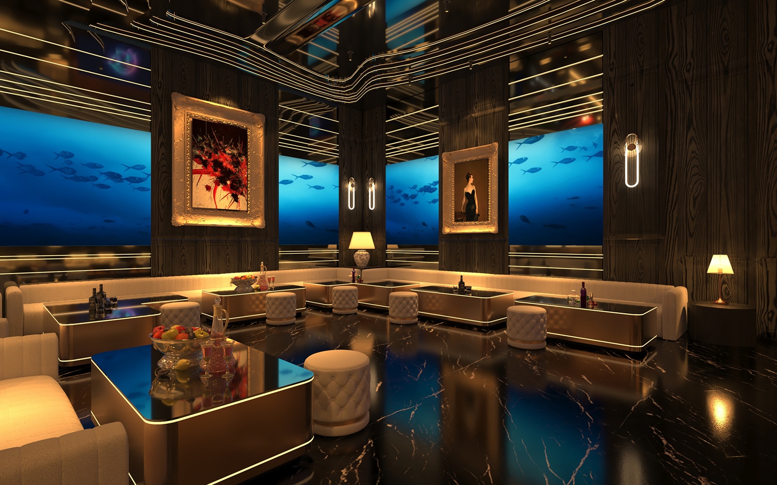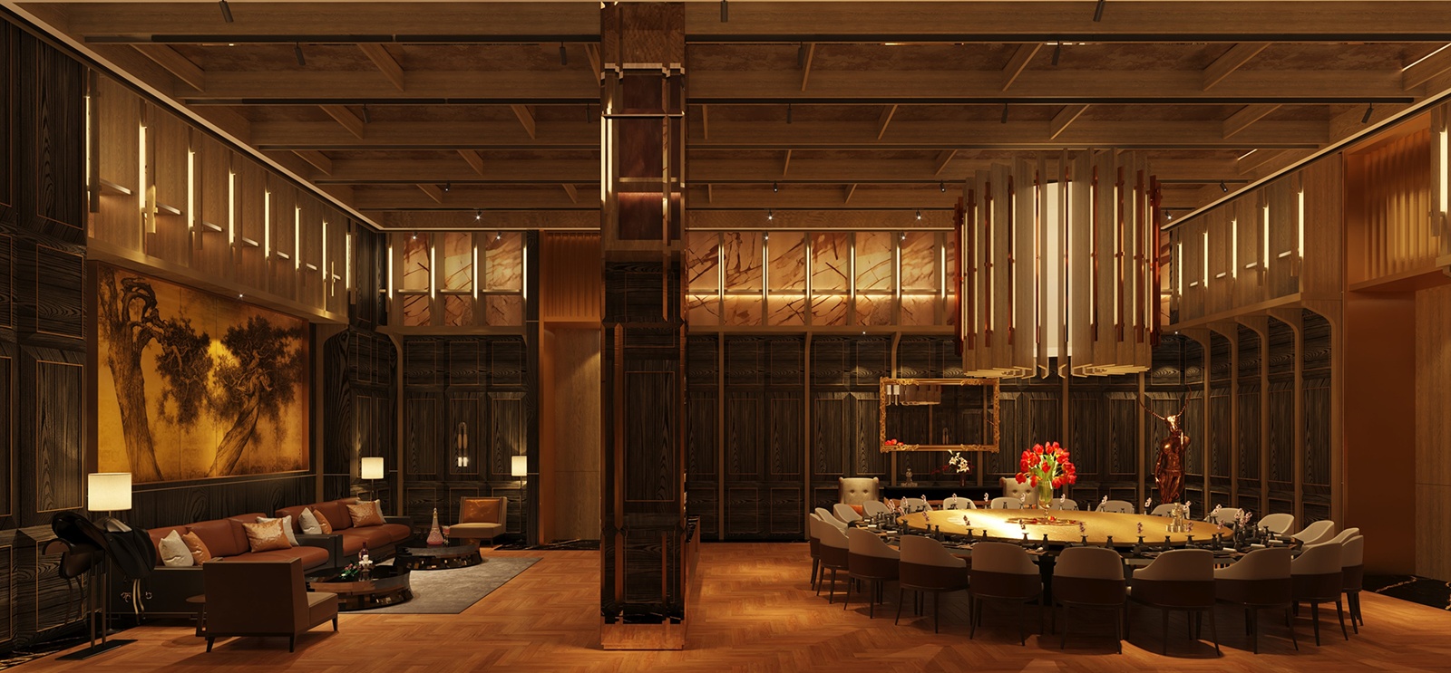 走進接待區,其是採對稱、開放的形式進行擘劃,能予人從容、舒適的入室體驗。而內部亦有設置足夠的座位供賓客、司機做使用。沿著動線進入招待會所,偌大的空間內有規劃KTV、吧台與撞球區等機能區。其中,開放式KTV與吧台區巧妙運用了別樣的天花板造型劃分出區域性。在同樣是深色反射材質的天花板,KTV的天花板是採立體等高線結合LED軟條燈做呈現;而吧台區則是以簡約的鏡面天花板做呈現,可讓整體視覺和諧又不失獨立性。置身於KTV,其座位區是以U型皮革沙發做圍塑,搭配金屬邊框的茶几。而座位區的後方有設置LED螢幕,可作為動態背景牆。再結合音樂與燈光的烘托下,便能營造出沉浸式的空間氛圍。走向吧台區,映入眼簾的即是陳設在吧台上方的法拉利車體。為妥善放置業主這一珍貴收藏,團隊特別選用鋼材打造開放式夾層結構,以確保其能安全承載車體的重量。其中,搭配隱藏式支撐結構網材,便能讓展示平台顯得輕盈的同時,又清晰呈現車輛底盤的細節。另外,層架是以傾斜的形式裝設,讓車體斜放在層架上時,能透過鏡面天花板完整反射車身。緩步移動至宴會廳,團隊特別配置直徑極寬的大型圓桌,以因應多人用餐之需求。圓桌是以大理石材、金屬面材打造而成,再搭配電動轉盤設計,能讓賓客用餐時更輕鬆、優雅。另外,由木材、金屬板製成的大型造型吊燈,可為場域增添視覺亮點,並營造高雅大氣的氛圍。