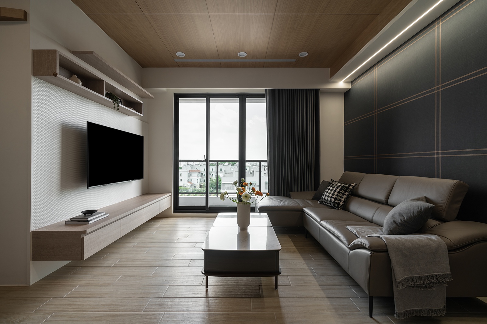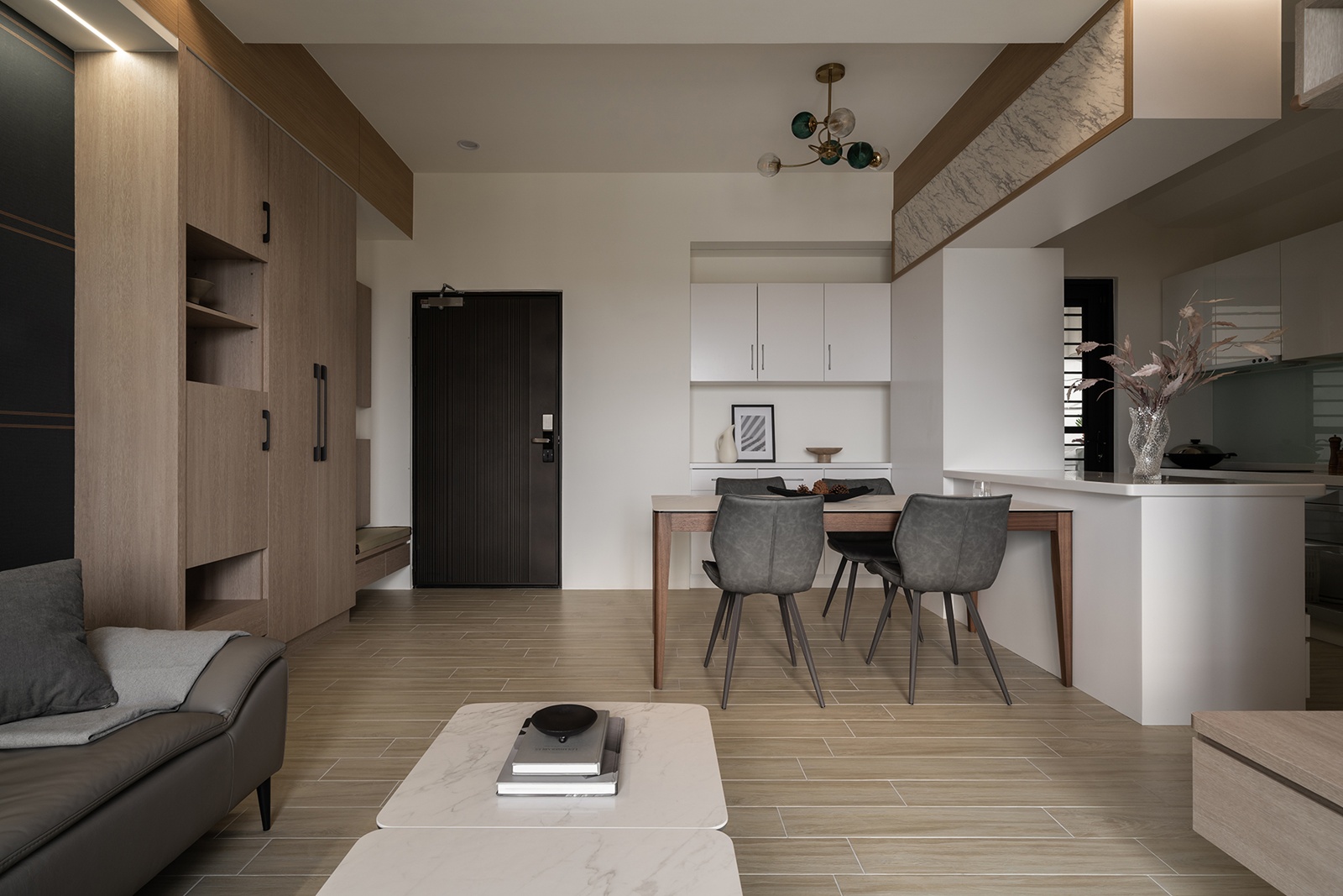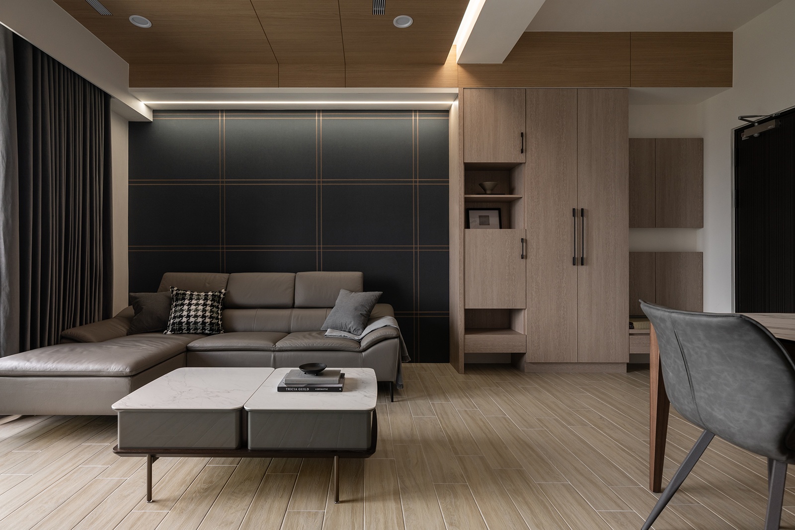 空間自玄關展開,客廳進門如飯店大廳般大器迎賓。天花以實木皮包覆,配置隱藏式冷房系統;並於梁位嵌入燈帶,拓展場域縱深,引導佈局分劃與照明均勻。沙發背牆嚴選質感壁紙,閃現金線與暗色相映成襯,增添細節趣味。主臥與次臥透過深淺飾材導引視線,放大小坪數視感;末間臥房擘劃為現代和風茶室,座區結合收納效能與單框邊榻榻米,延伸生活尺度,無縫契合當代居住的多元需求。