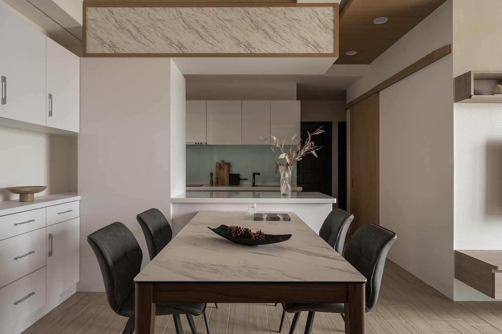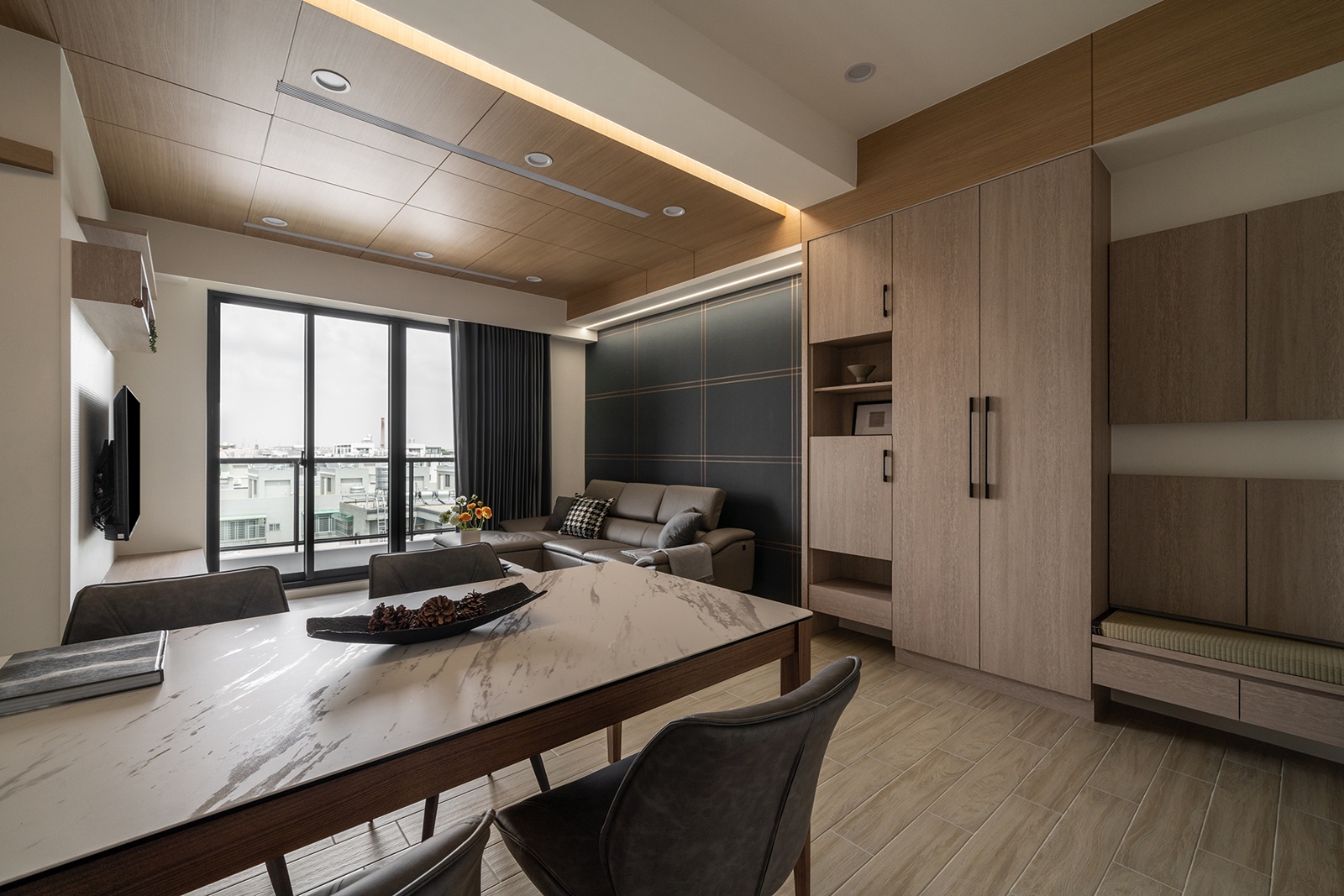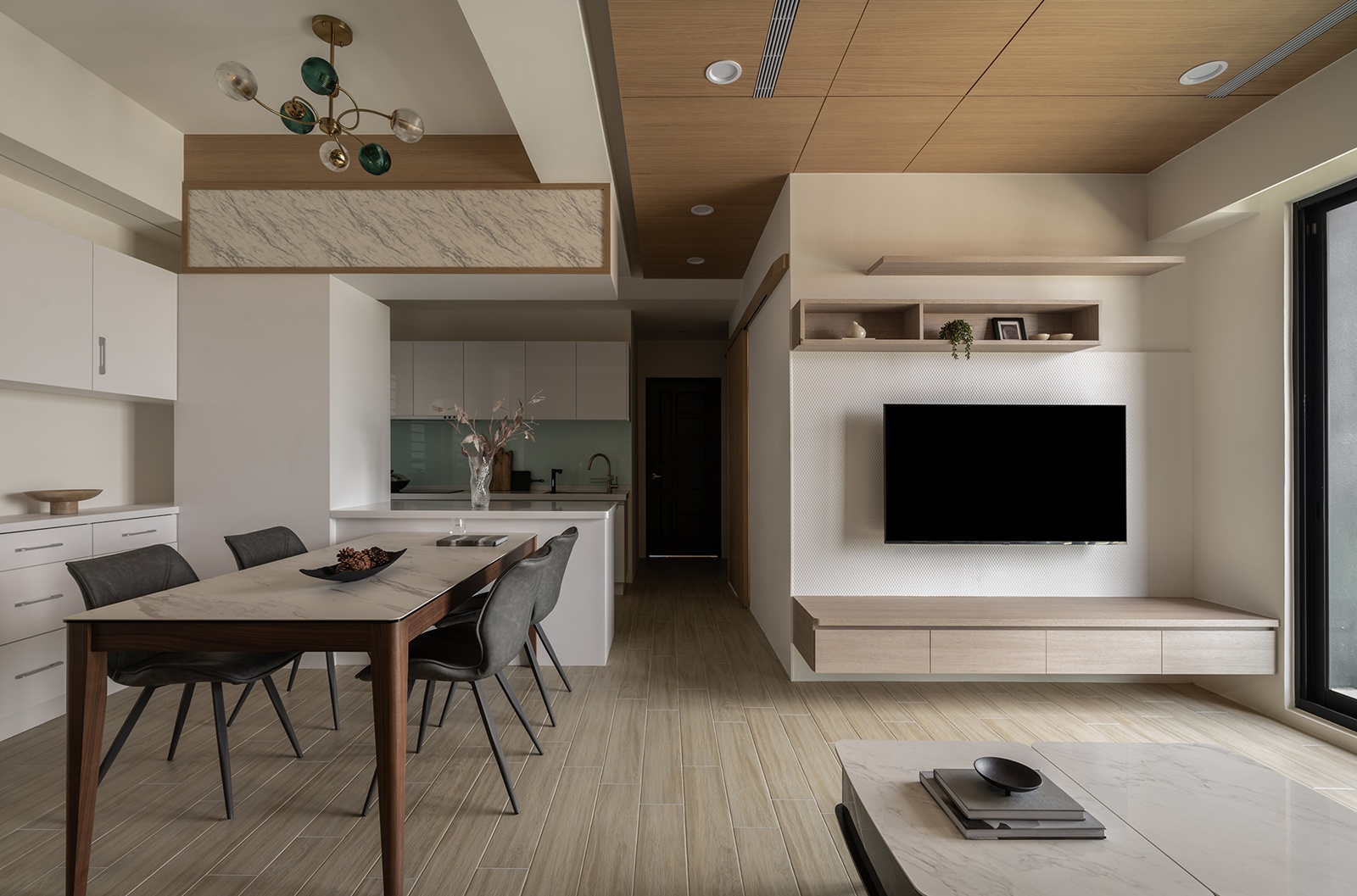 環保策略貫穿建材與採光設計,全案減少現場塗裝工序,引進KD木皮板材,有效降低甲苯與VOC使用比例;同時導入天然鋪材與可調式捲簾,提升日照滲入。此案全面落實減碳及節能方針,踐行綠建精神,反映小宅設計於環境意識與永續思維的具體實踐。