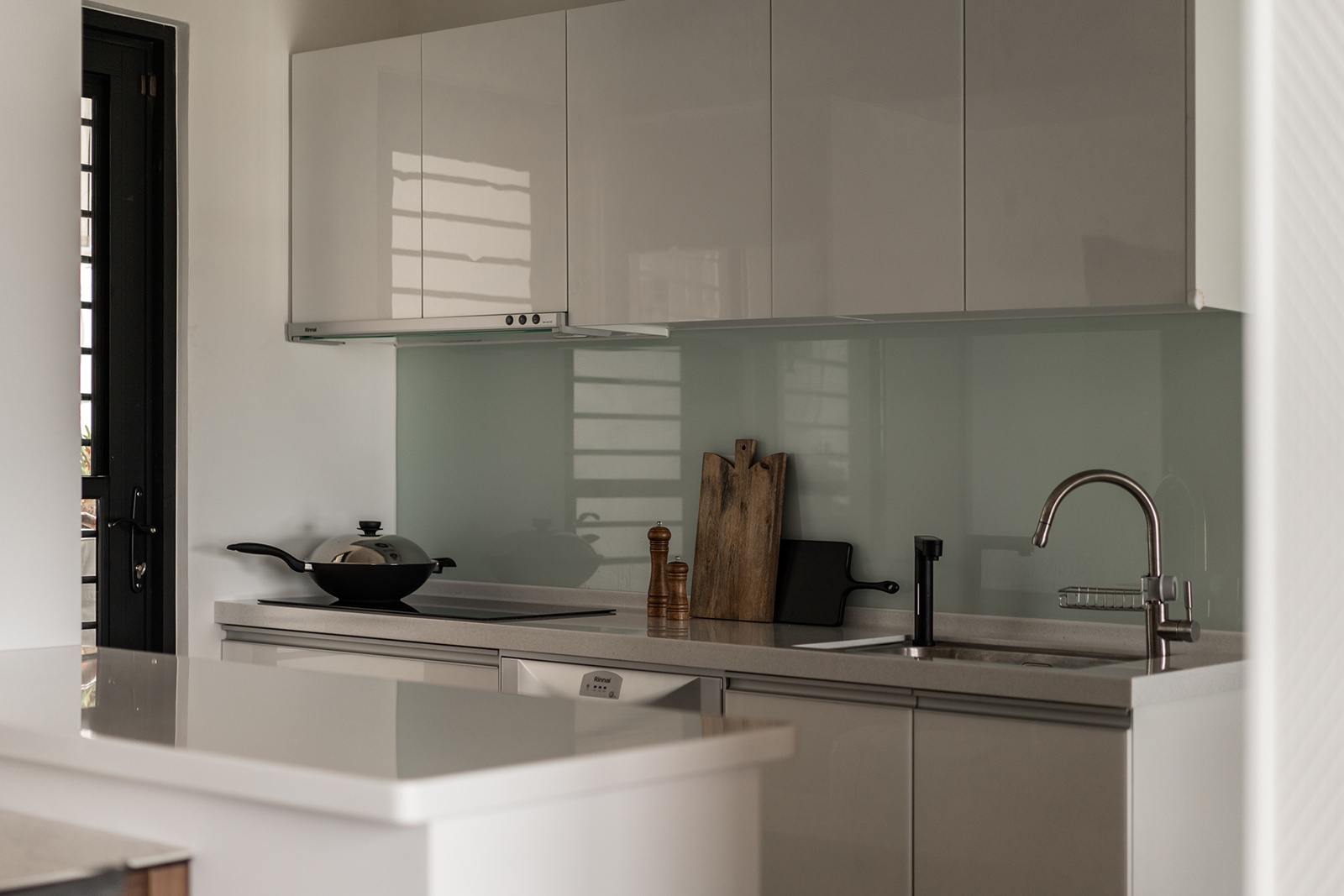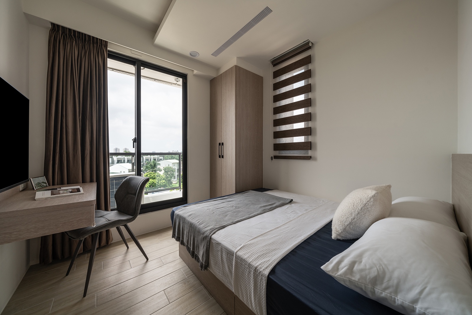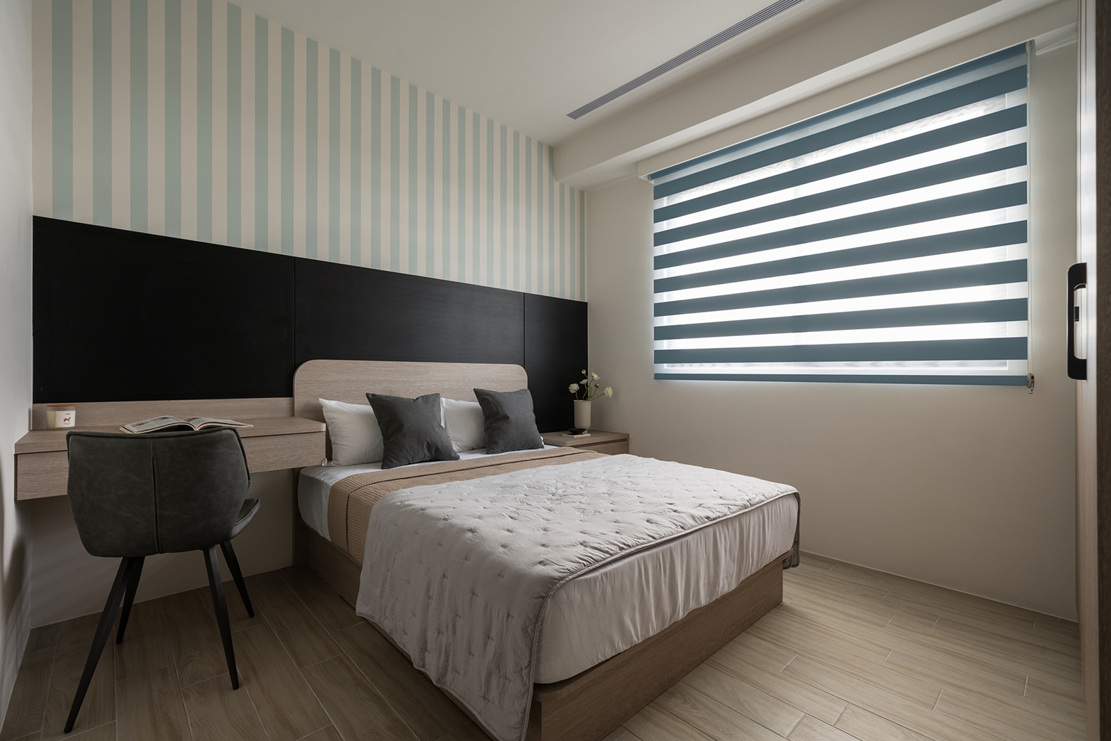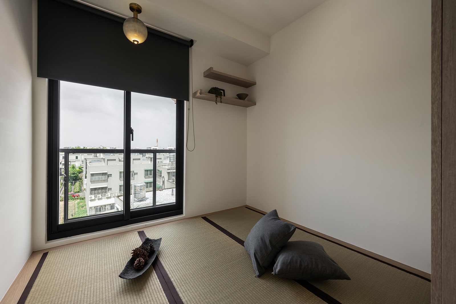 環保策略貫穿建材與採光設計,全案減少現場塗裝工序,引進KD木皮板材,有效降低甲苯與VOC使用比例;同時導入天然鋪材與可調式捲簾,提升日照滲入。此案全面落實減碳及節能方針,踐行綠建精神,反映小宅設計於環境意識與永續思維的具體實踐。