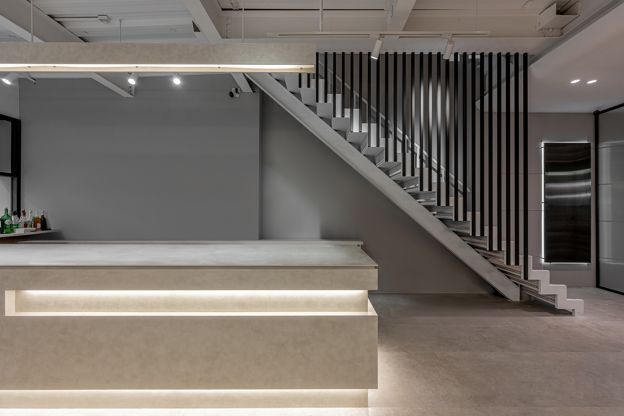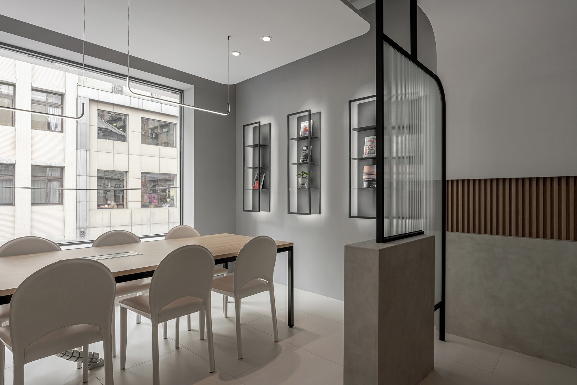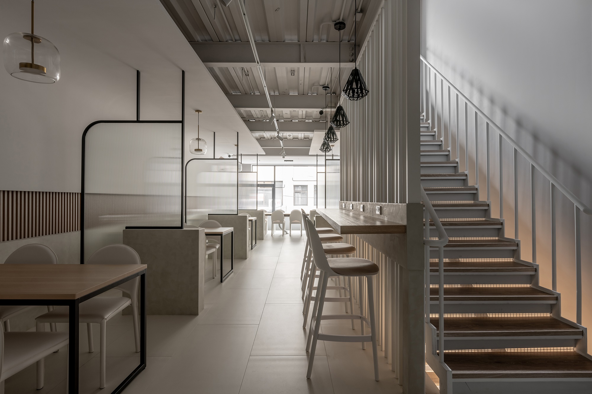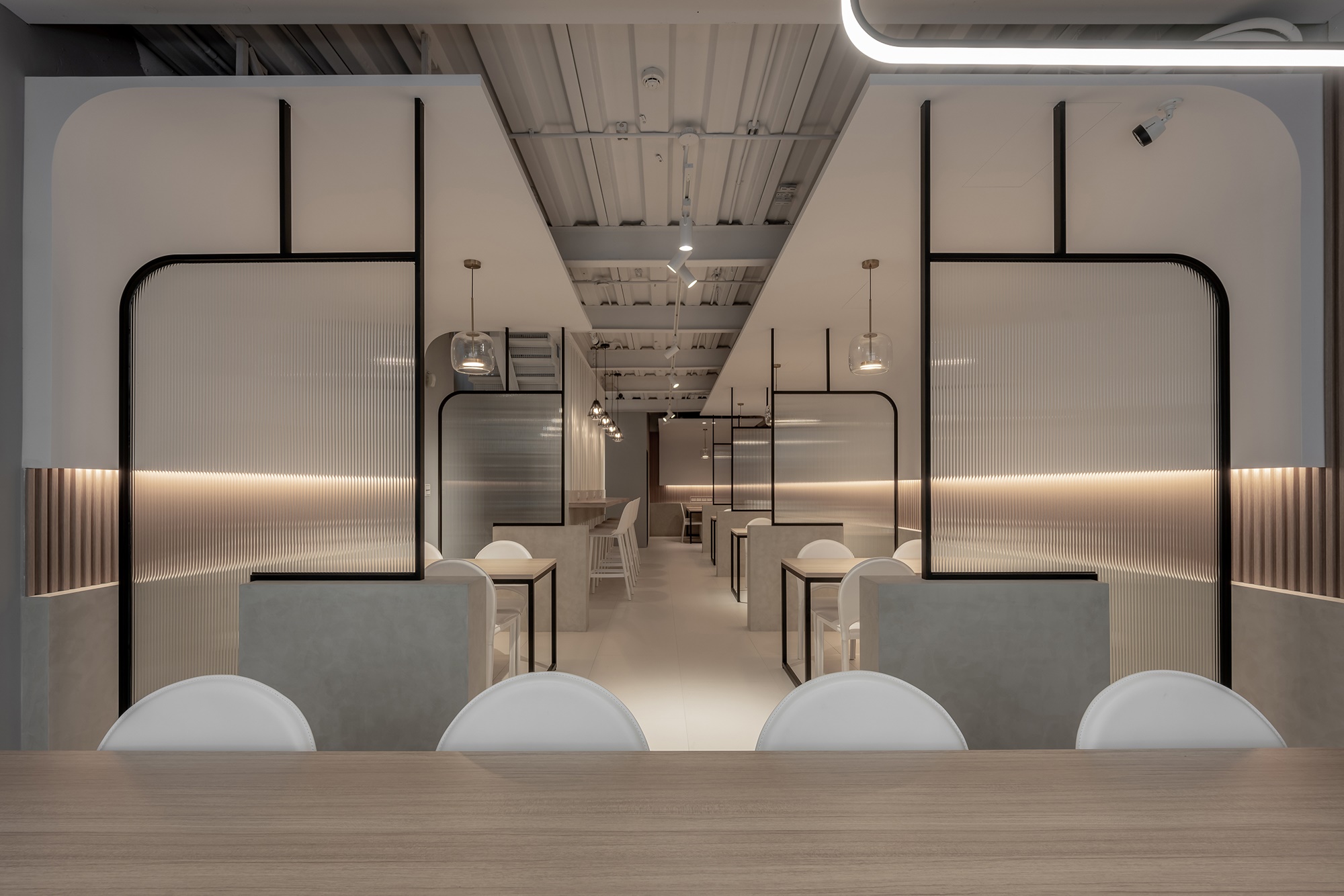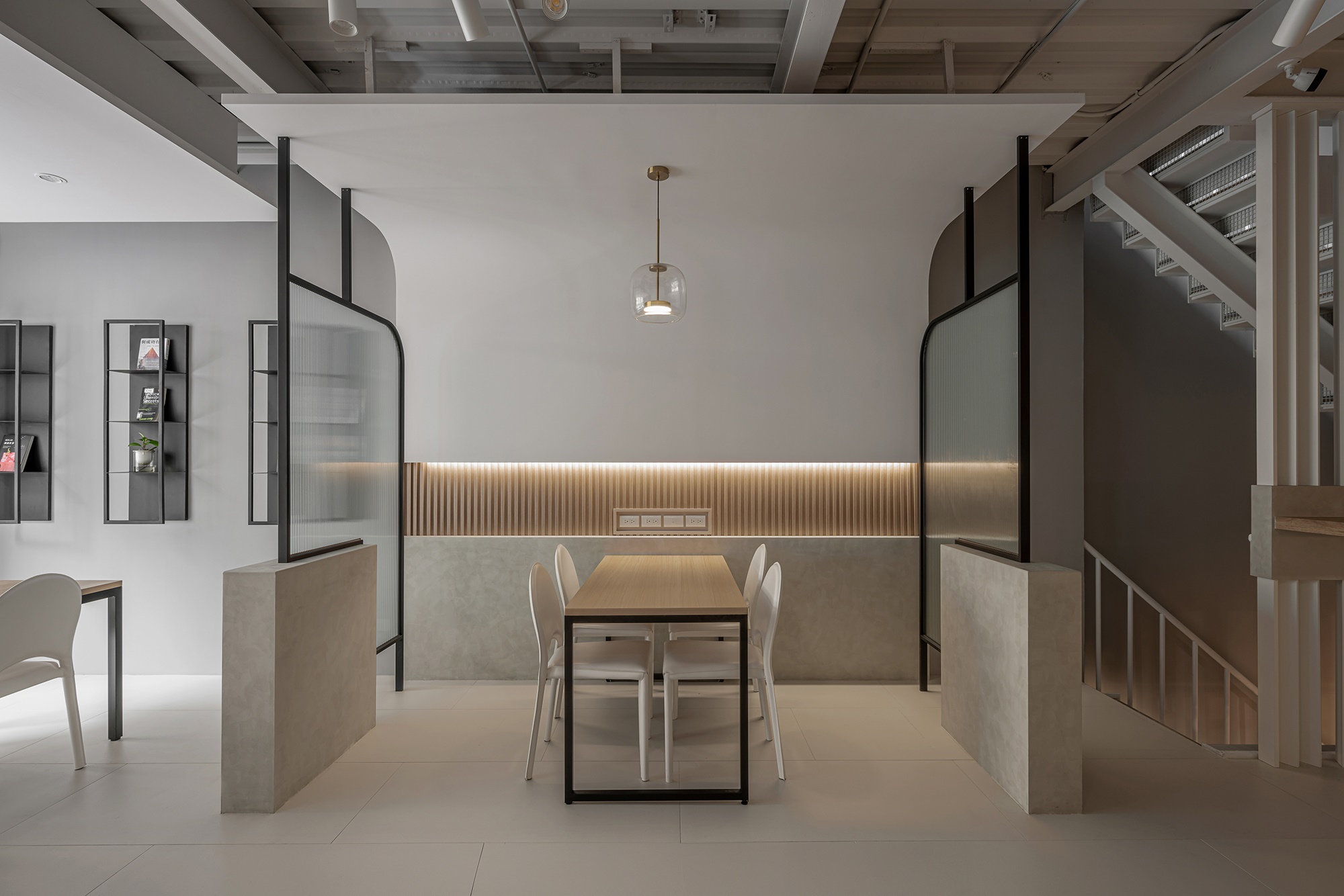 走進店內,空間主要選用清水模塗料進行鏝抹,再搭配燈光的映射,以營造出動態的光影效果,增添視覺層次。同時,本案在座椅、燈具、隔屏與天花板均有導入圓弧元素,能消弭狹長空間結合隔間時產生的制式、冷硬感。置身於二樓,其主打半開放式的場域規劃。不同座位區之間是採透光、不透視的長虹玻璃隔屏做區隔,不僅能維持空間的通透度、不顯擁擠,又能保障顧客的隱私。