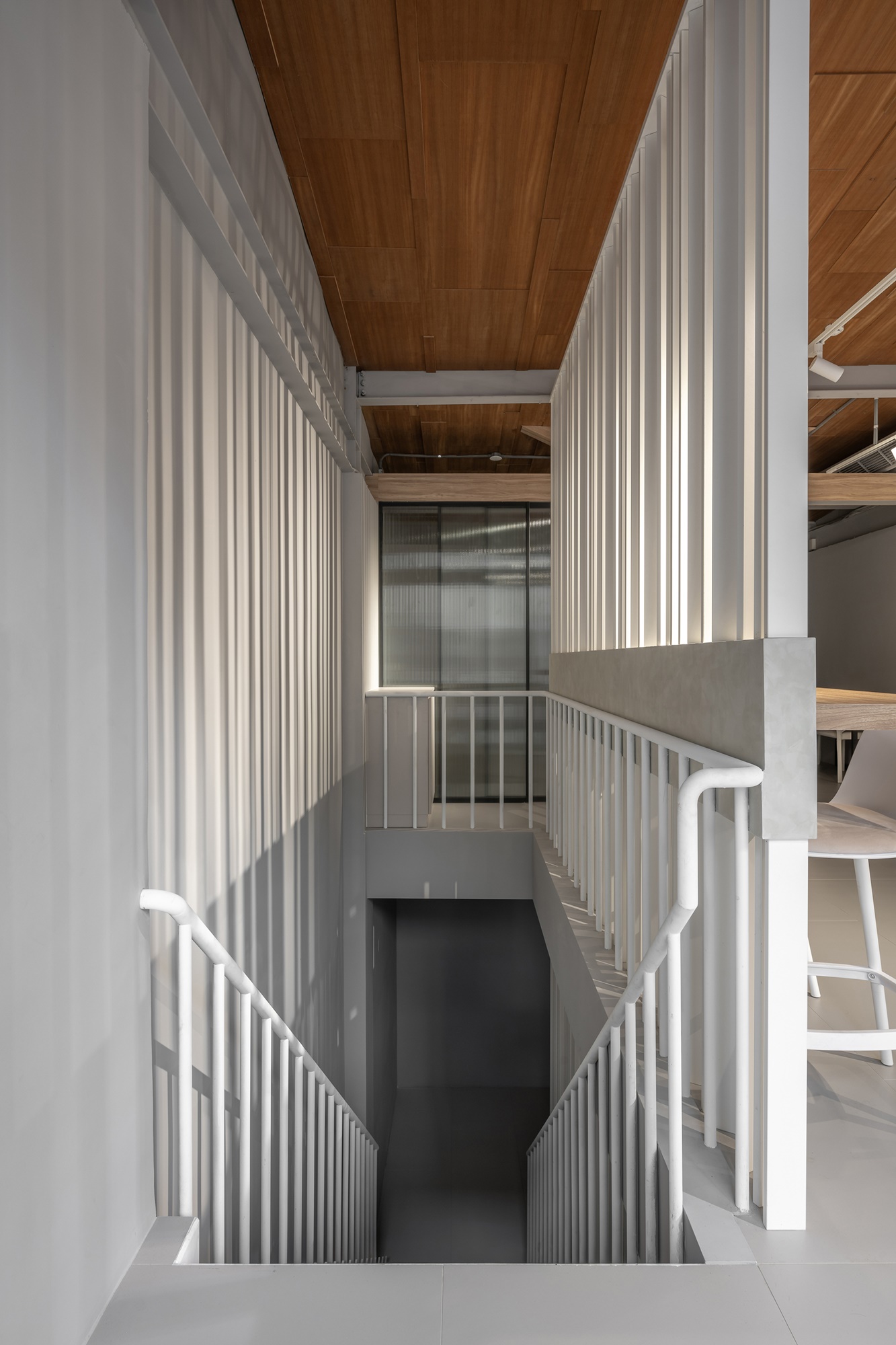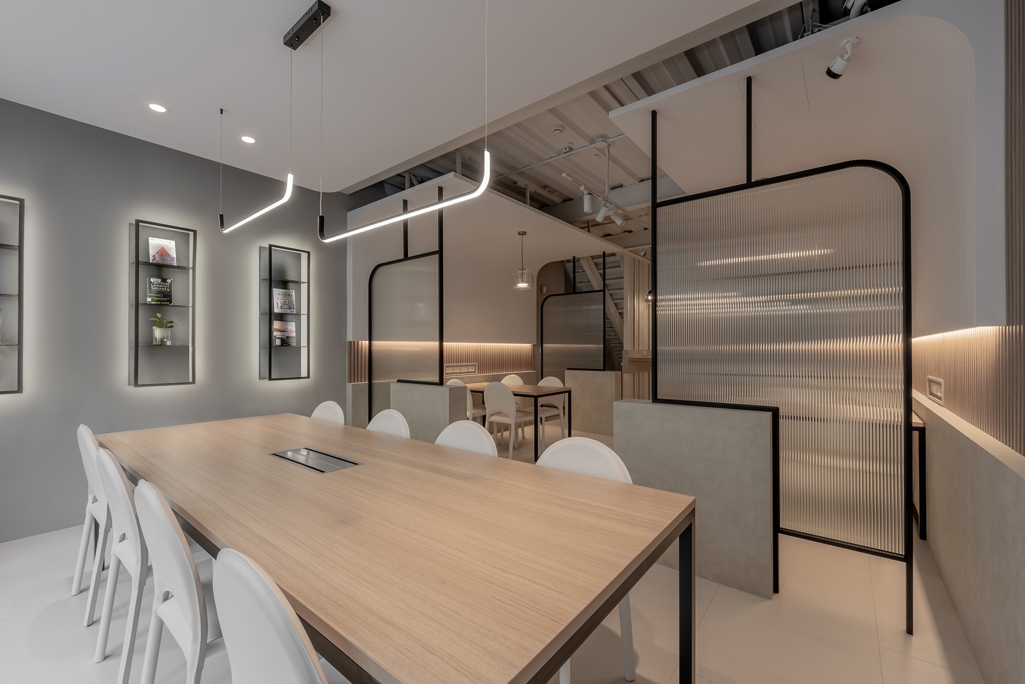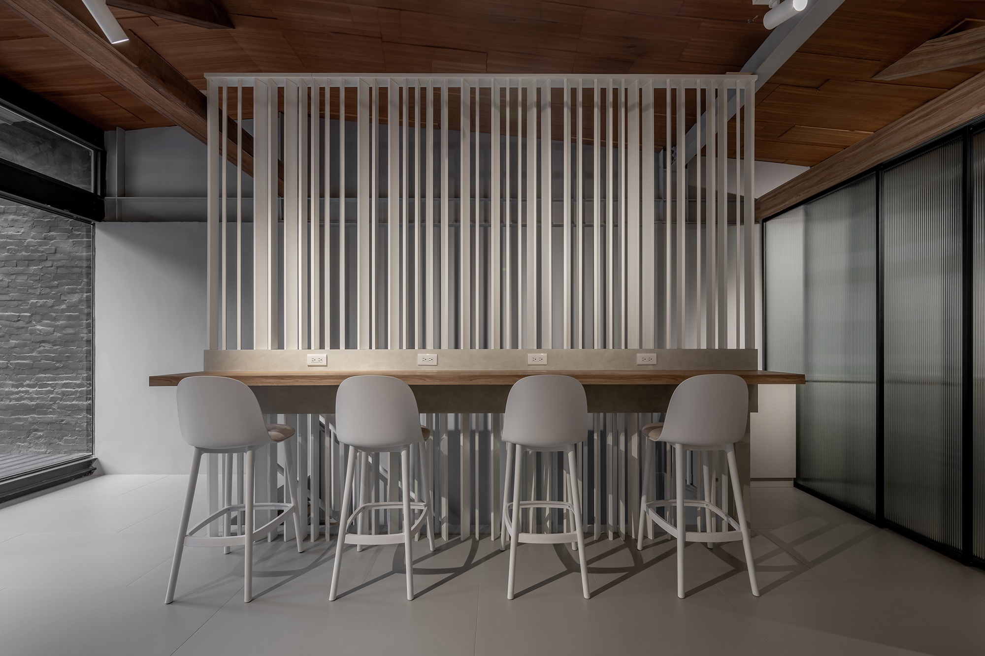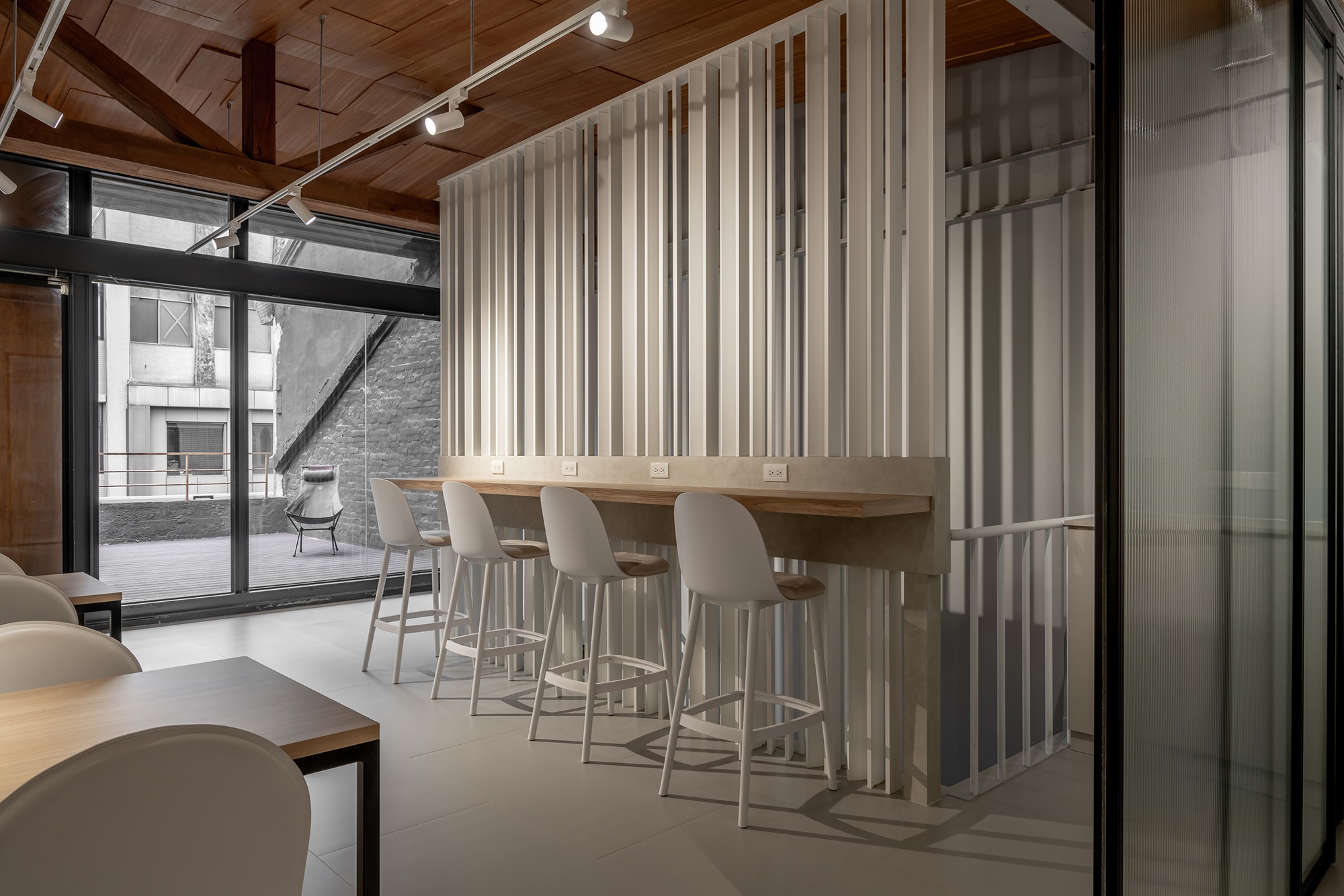 其中,將10人用大型會議桌安排於臨窗處,可為來此辦公的顧客提供舒適、優質的體驗。另外,團隊妥善利用空間尺度,於二樓、三樓的樓梯旁皆設置了單人使用的吧台區。透過恰到好處的場域佈局,狹長的基地也能圍塑出寬敞、明亮的空間感受,為顧客帶來愜意放鬆的使用環境。