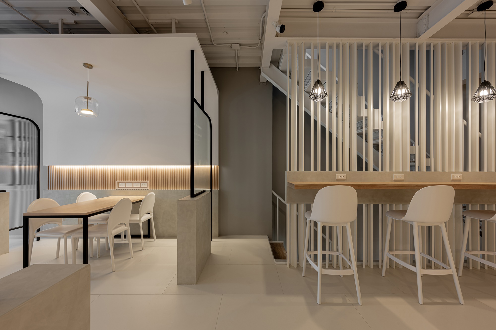 此案為咖啡館設計案,共有三層樓。鑒於本案和周圍房屋均為屋齡40年的老屋,團隊便決定以大面積開窗和敞亮的空間作為設計主軸,冀望打破傳統咖啡廳昏暗的既定印象、吸引過路人的目光,以增加客流量。且為因應現代生活型態的轉變,該場所除了販售咖啡飲品之外,還有規劃共享空間提供顧客辦公使用。透過大型會議桌、半開放式獨立場域和吧台區的設置,進而滿足不同客群的使用需求。