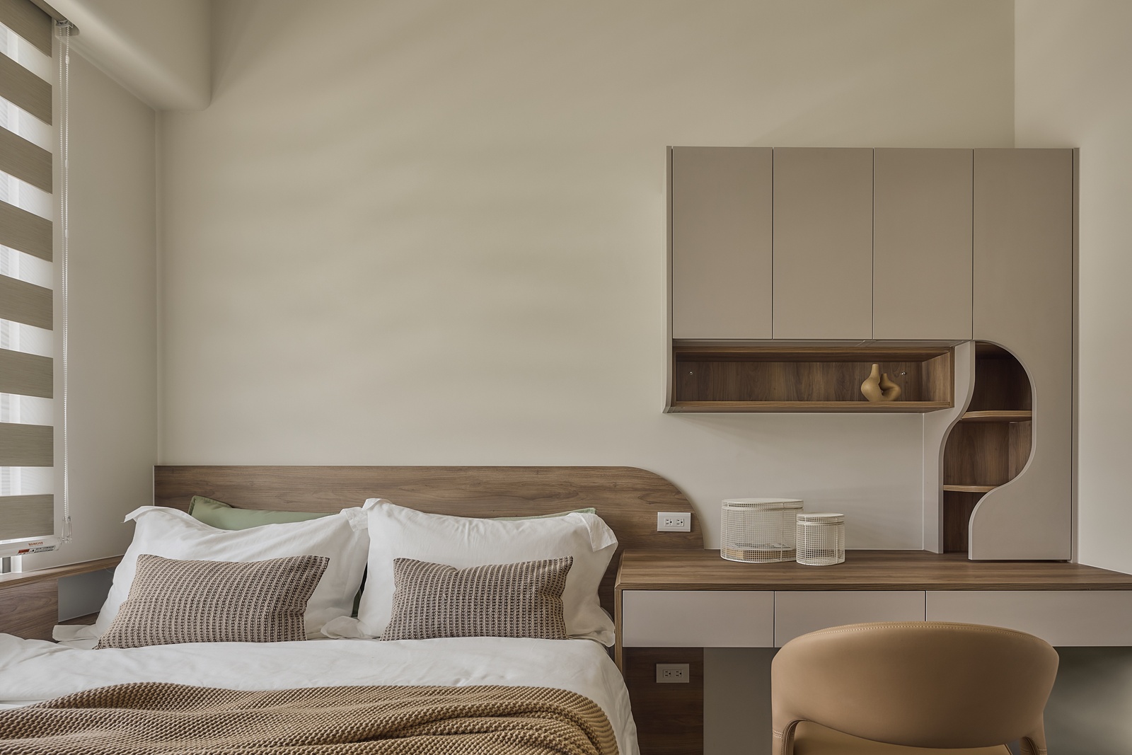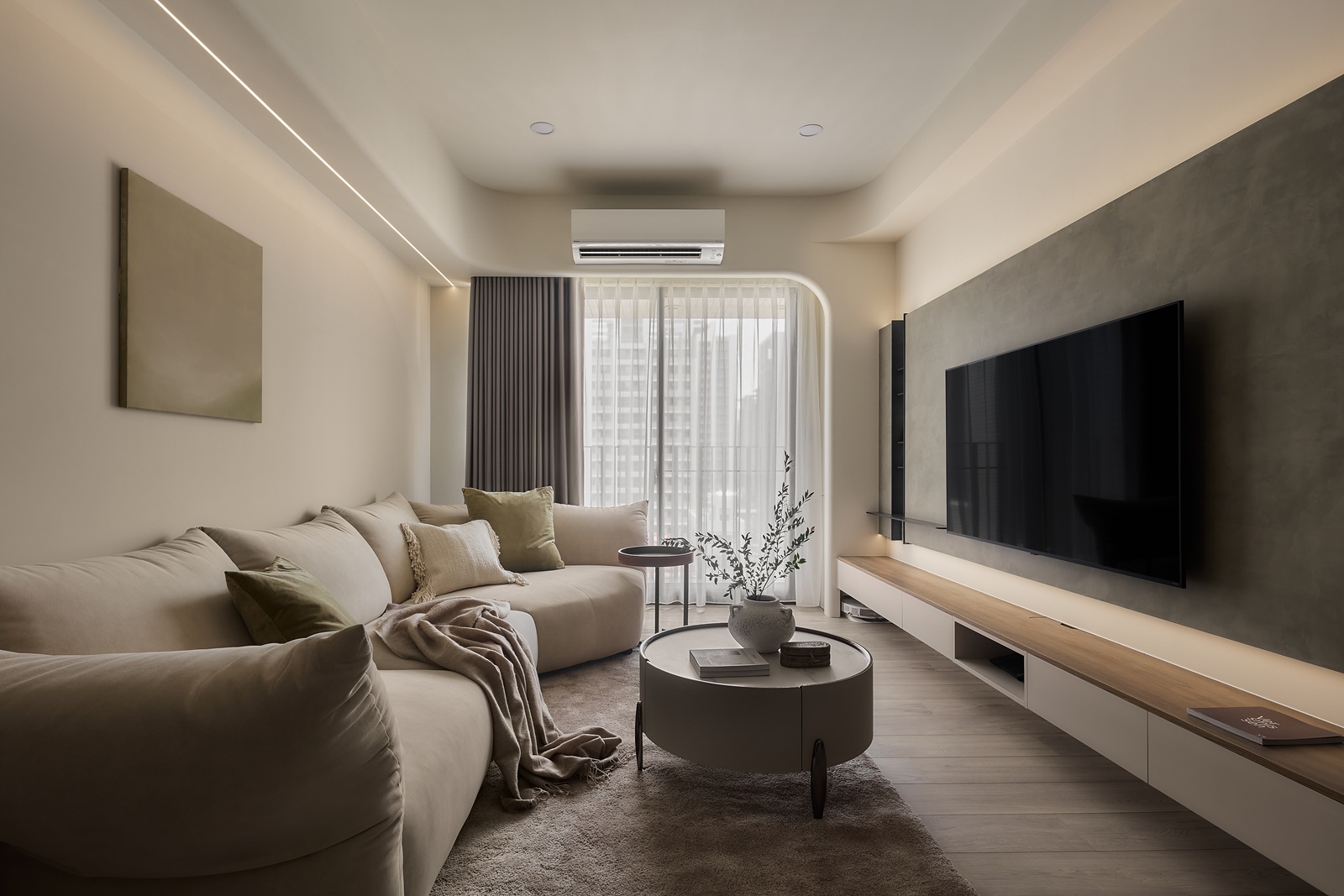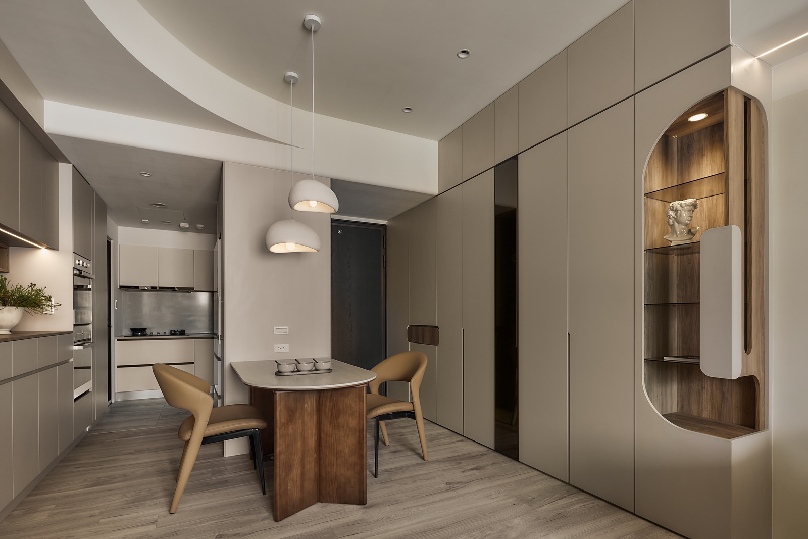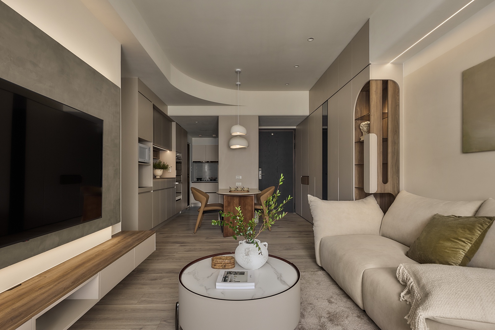 公共空間採開放式設計,串聯客廳與餐廚,運用輕柔淺色調,拓展了整體視野。餐廚以俐落櫃體整合電器設備,中央配置圓潤餐桌,木質底座折疊成立體幾何造型,兼具雕塑感與實用性。客廳以舒適L型沙發為核心,與懸浮電視櫃形成視覺軸線。灰色藝術塗料的電視櫃與米色牆壁形成對比,間接照明則烘托溫暖氛圍。臥室則承接公區語彙,書桌與收納櫃一體成形,弧形細節點綴其中,維持柔和而沉穩的生活節奏。