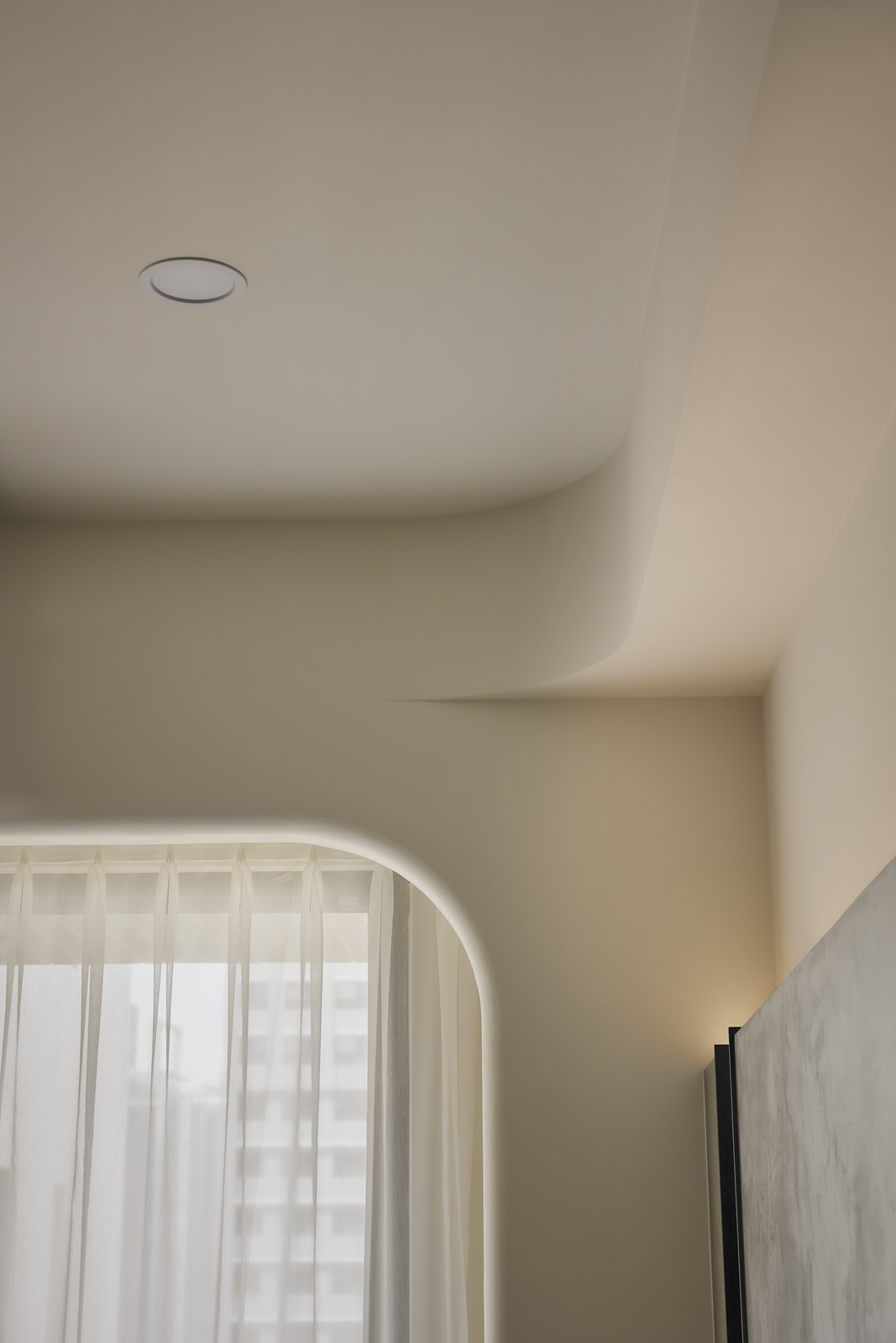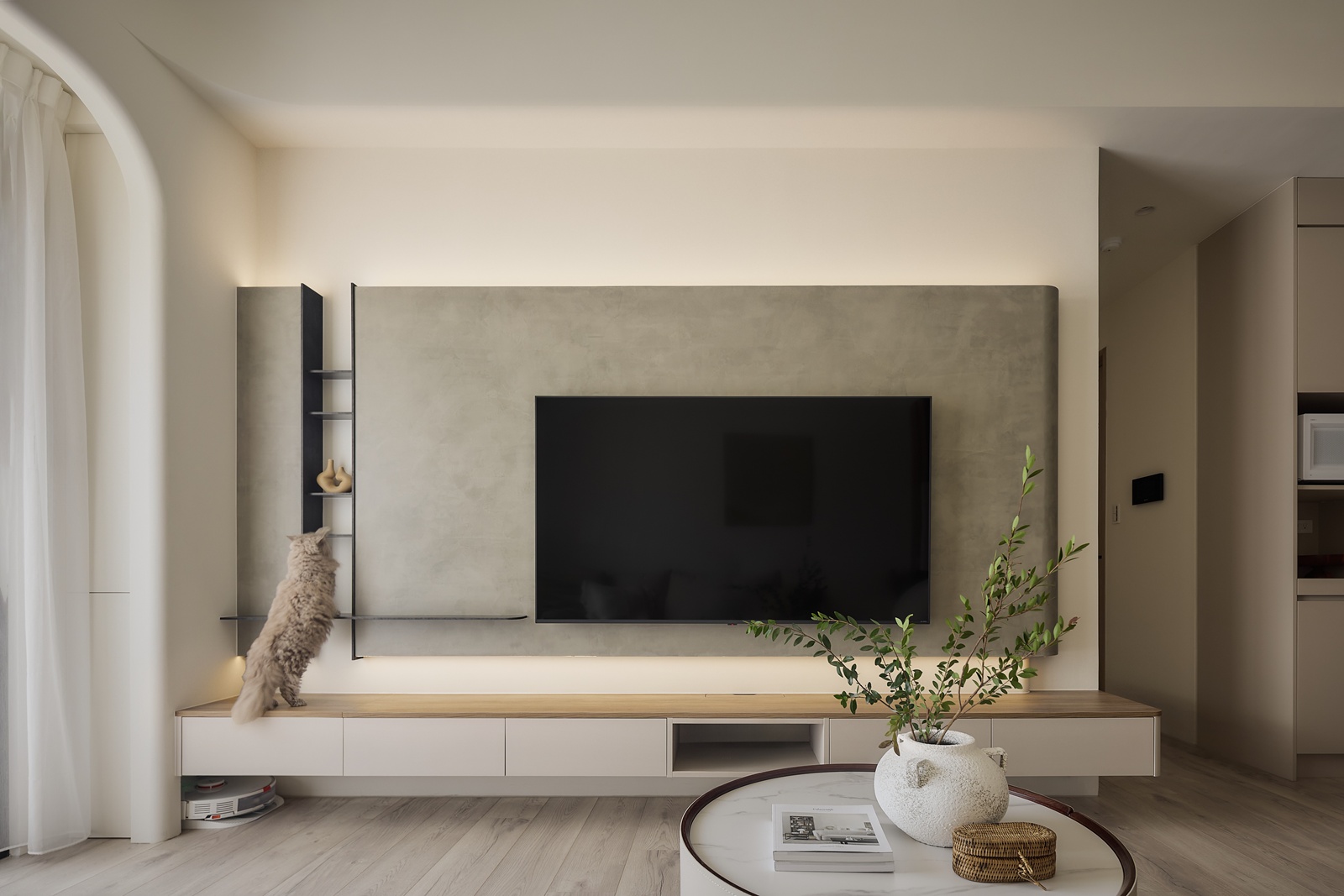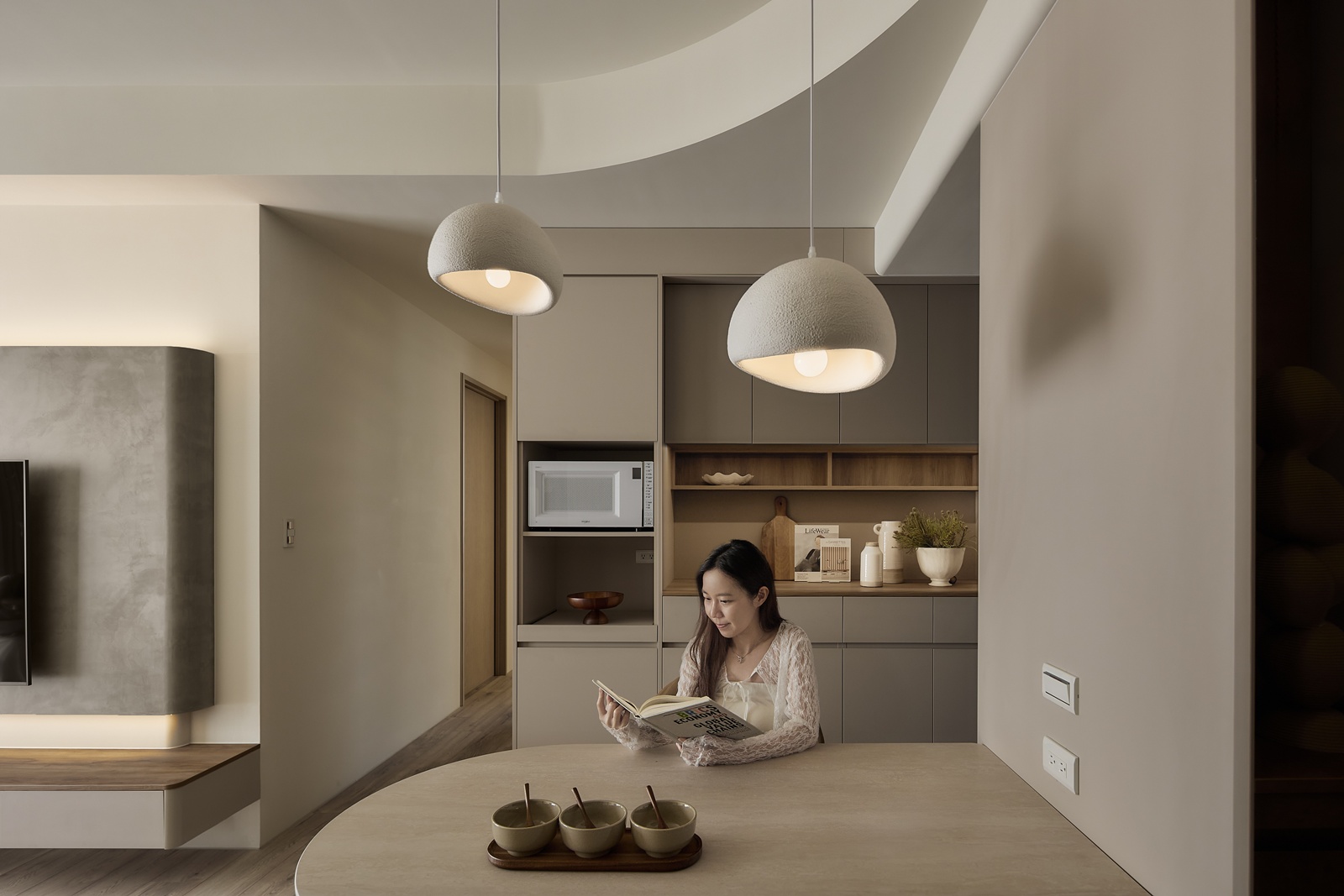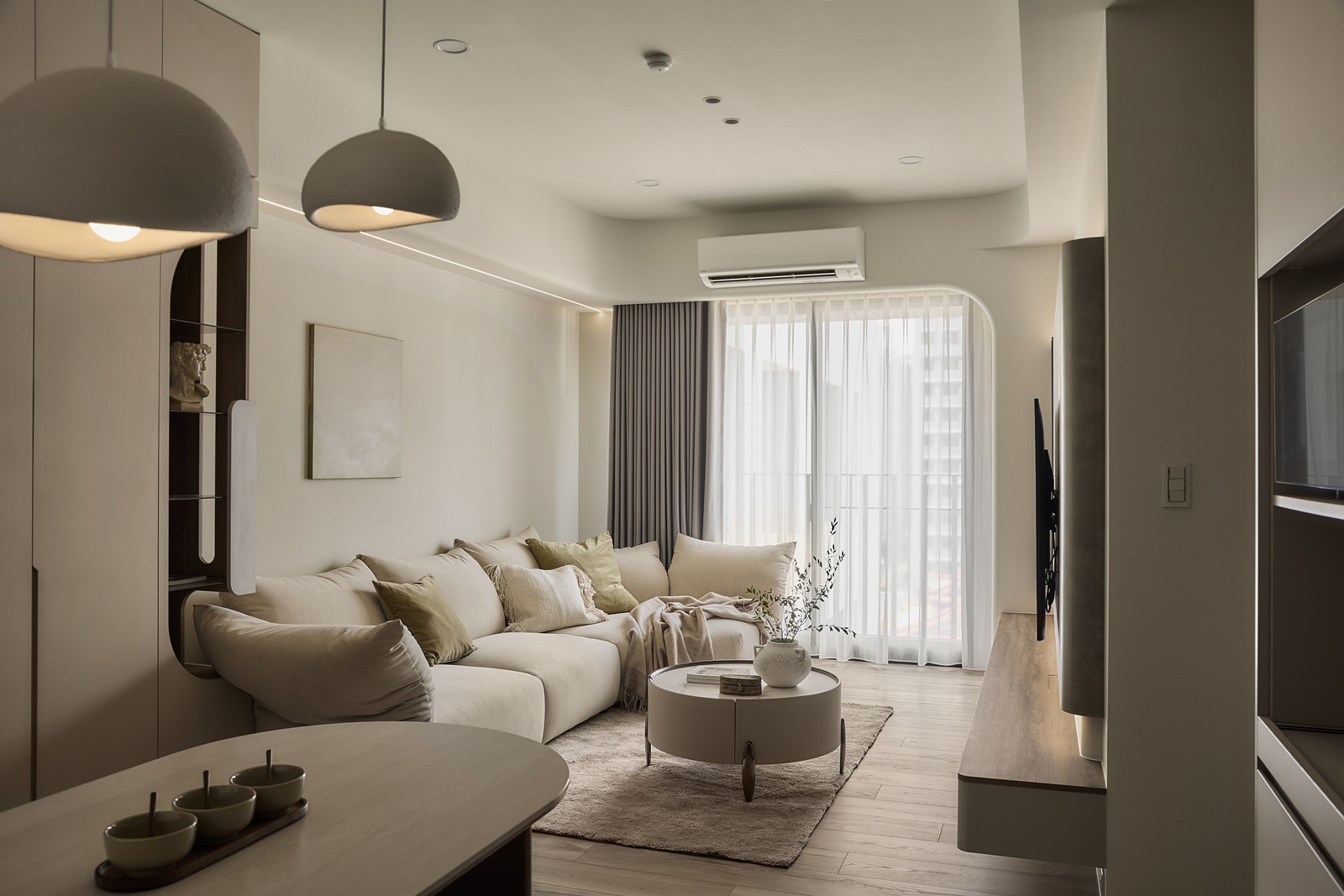 公共空間採開放式設計,串聯客廳與餐廚,運用輕柔淺色調,拓展了整體視野。餐廚以俐落櫃體整合電器設備,中央配置圓潤餐桌,木質底座折疊成立體幾何造型,兼具雕塑感與實用性。客廳以舒適L型沙發為核心,與懸浮電視櫃形成視覺軸線。灰色藝術塗料的電視櫃與米色牆壁形成對比,間接照明則烘托溫暖氛圍。臥室則承接公區語彙,書桌與收納櫃一體成形,弧形細節點綴其中,維持柔和而沉穩的生活節奏。
