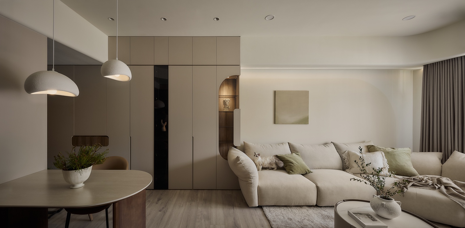 此案為單身寓所,設計核心以柔和曲線與溫潤材質,形塑舒心而有歸屬感的生活場域。整體以奶茶色為基調,搭配木質材料鋪敘空間。捨棄銳利線條,於天花板、牆面、櫃體等處融入圓弧元素,使氛圍流動而親和,讓人歸家時能自然卸下疲憊,感受空間溫柔的承接。
