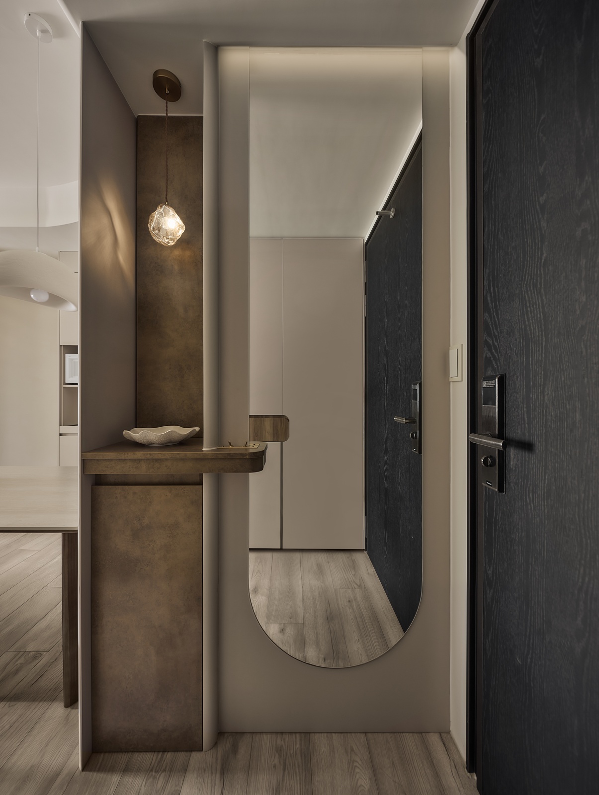 步入玄關,弧形穿衣鏡、古銅色玄關台與幾何燈具相互映襯,玄關台深邃的背景襯托淺色基調空間,凝聚出一處視覺焦點。隨即映現的是一座頂天立地的收納櫃體,門片以淺灰啞光面板呈現,並鑲嵌垂直橢圓形凹槽,搭配隱藏式照明,為日常收納增添層次感與觀賞性。