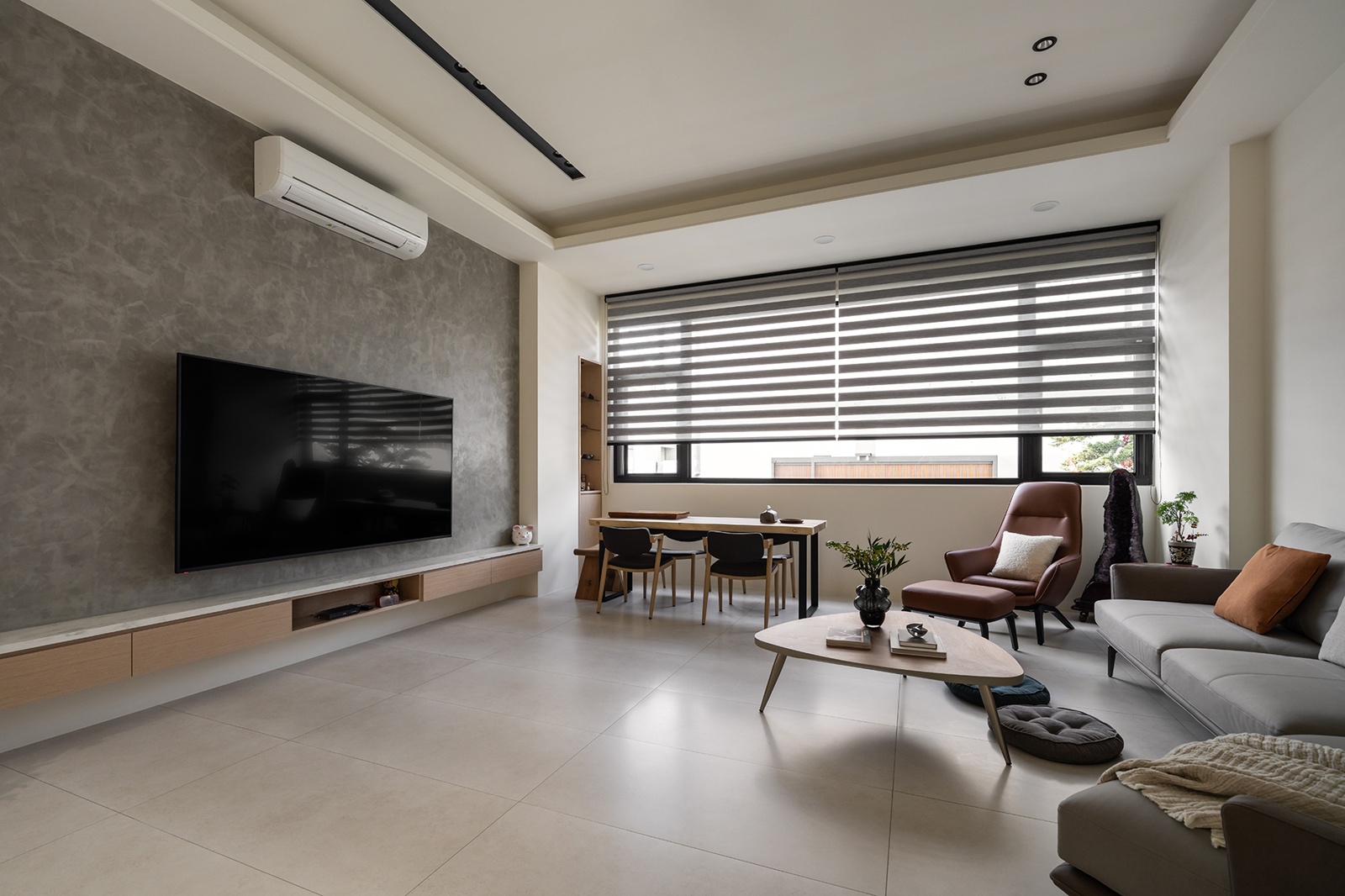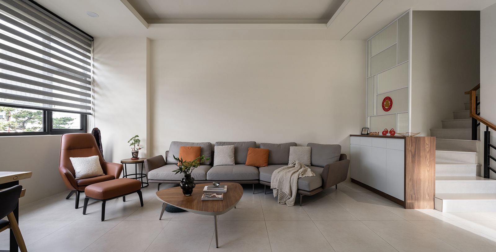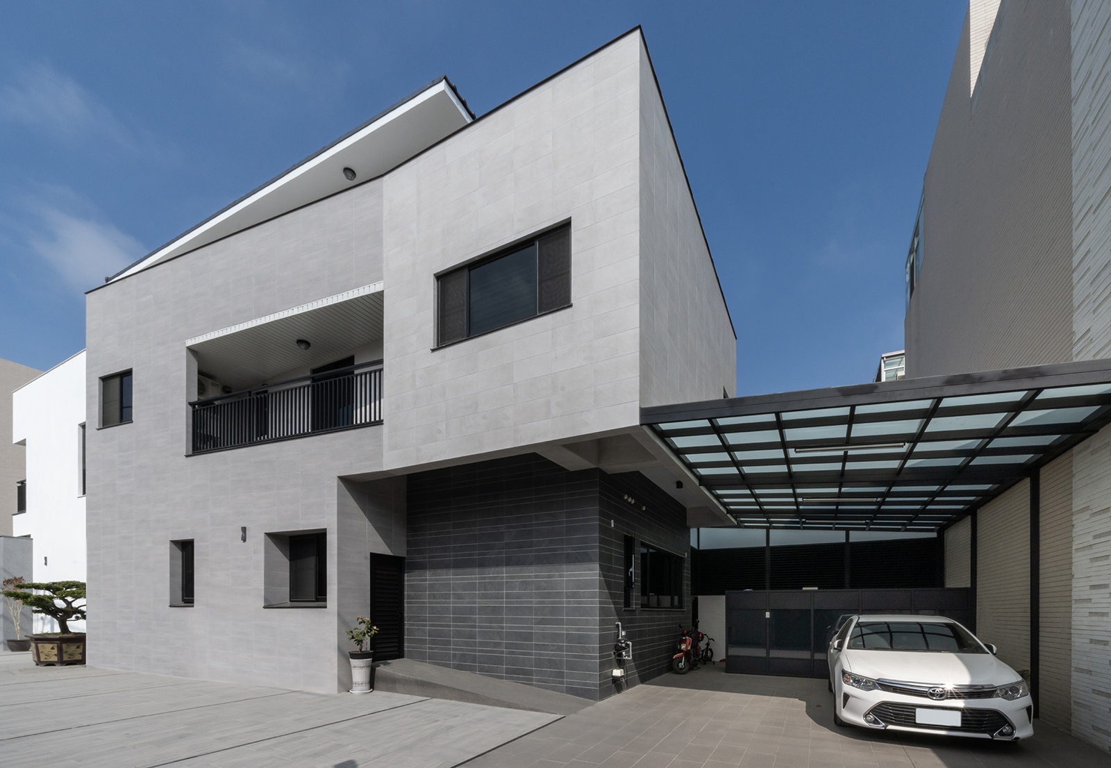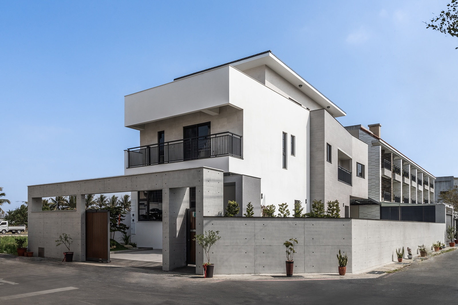 本案為三代同堂自地自建住宅規劃,基地寬廣且緊臨都市轉角。設計重點在於將既有西向長立面轉化爲優勢,錘鍊感官動態及外觀節奏,並打造結合都會感和舒適性的宜居場域。因應長達33公尺的主體結構,專業團隊藉由後縮陽台、斜面造型量體及上挑屋頂設計,匯聚光影變化與空間節奏;不僅有效減輕西曬影響,同時化解長向透天過於延展所造成的單調與壓迫視感,更添形貌趣味,使量體呈現如律動般起伏的層疊印象。室內採行簡約手法鋪敘,家具依據日照採光與開窗精心配置,貫通家居路徑,全方位兼顧功能實用與視覺美感,凝鍊簡明澄淨而潤澤充盈的日常美居。