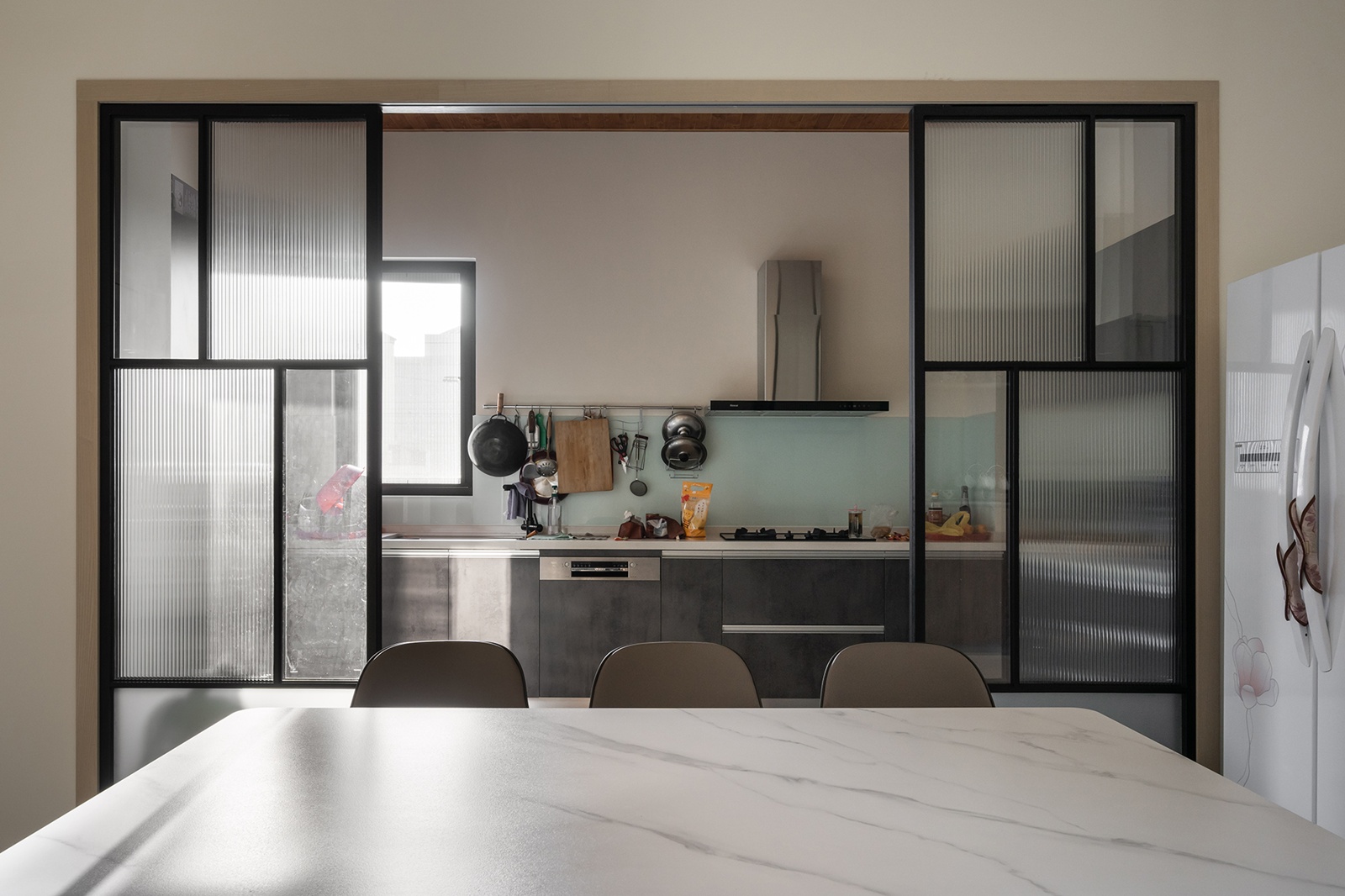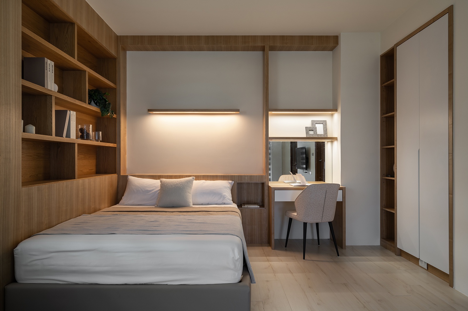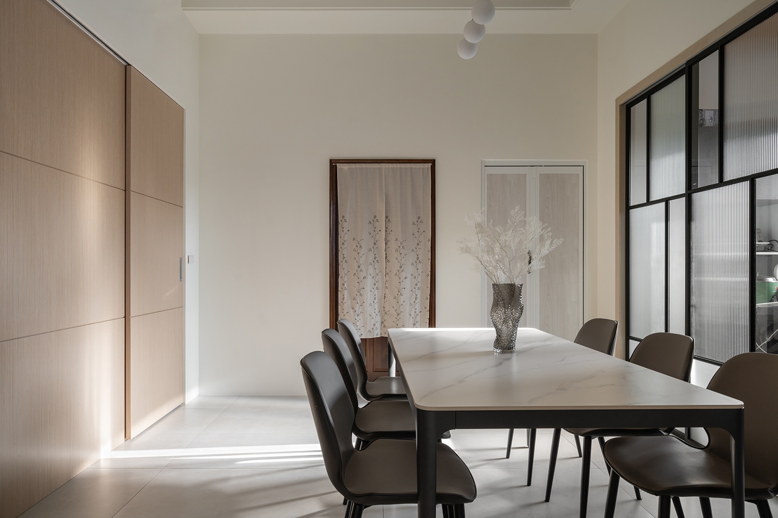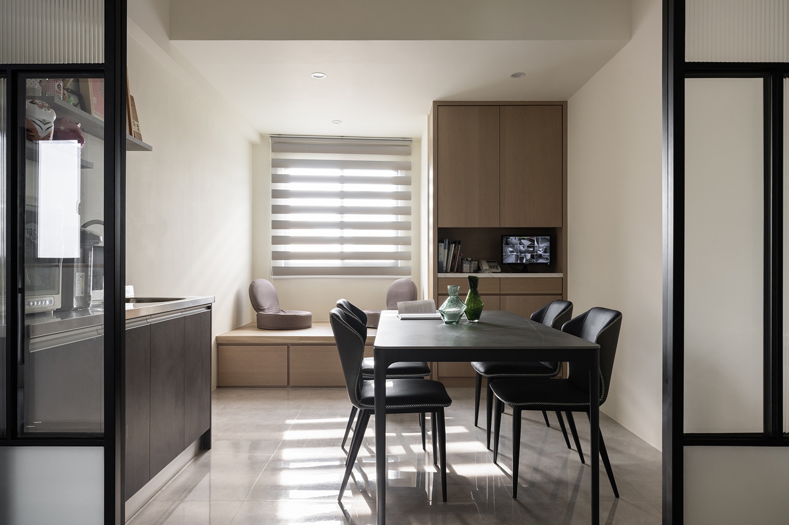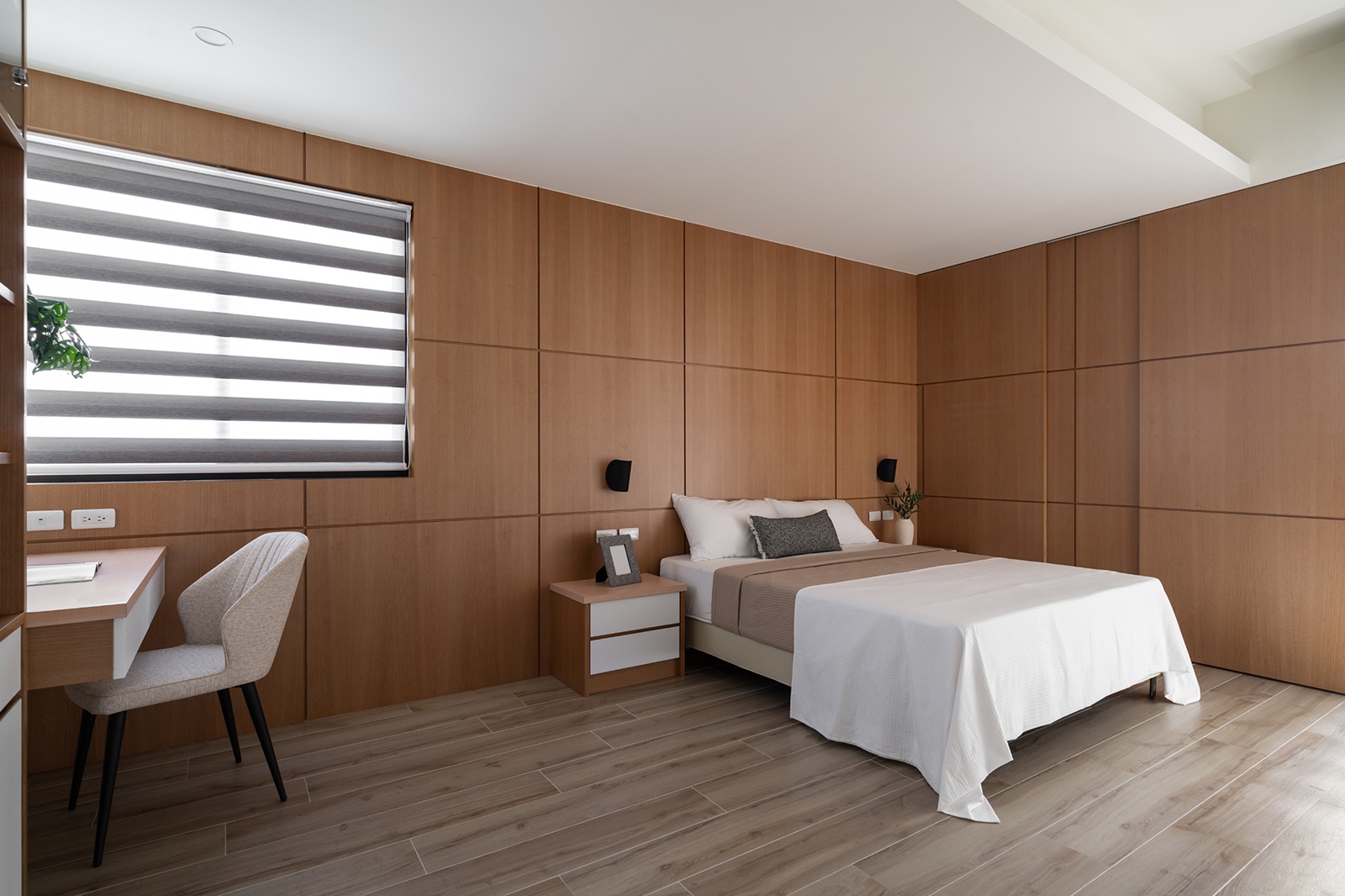 本案為三代同堂自地自建住宅規劃,基地寬廣且緊臨都市轉角。設計重點在於將既有西向長立面轉化爲優勢,錘鍊感官動態及外觀節奏,並打造結合都會感和舒適性的宜居場域。因應長達33公尺的主體結構,專業團隊藉由後縮陽台、斜面造型量體及上挑屋頂設計,匯聚光影變化與空間節奏;不僅有效減輕西曬影響,同時化解長向透天過於延展所造成的單調與壓迫視感,更添形貌趣味,使量體呈現如律動般起伏的層疊印象。室內採行簡約手法鋪敘,家具依據日照採光與開窗精心配置,貫通家居路徑,全方位兼顧功能實用與視覺美感,凝鍊簡明澄淨而潤澤充盈的日常美居。