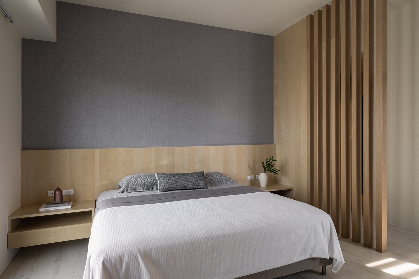 一樓劃設敞亮主廳及會客區,作為家庭聚會與訪客交流的生活中樞;通廊引向斜面結構內廚台,後門則可順延孝親房與廚區,動線順暢舒展,方便長者出入和使用。二樓之上透過層次露台降低建築外周熱源,四間臥房沿南北軸巧妙佈局,確保光照與通風均衡;樓面間隔藉起居室、茶飲雅座及閱讀書區串接,形塑靈活中介場所,細膩關照住戶多樣化的生活需求。基地留設適度餘裕,廣植松木與花草,扶疏綠意映照清水色基調,營造裡外連結、和諧且次序分明的靜謐韻致。