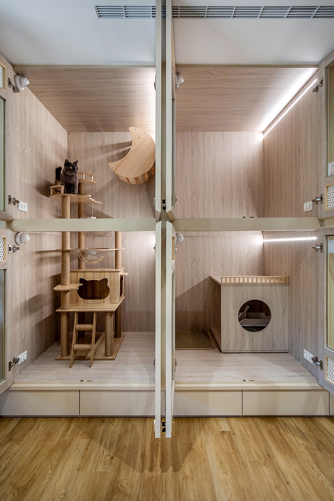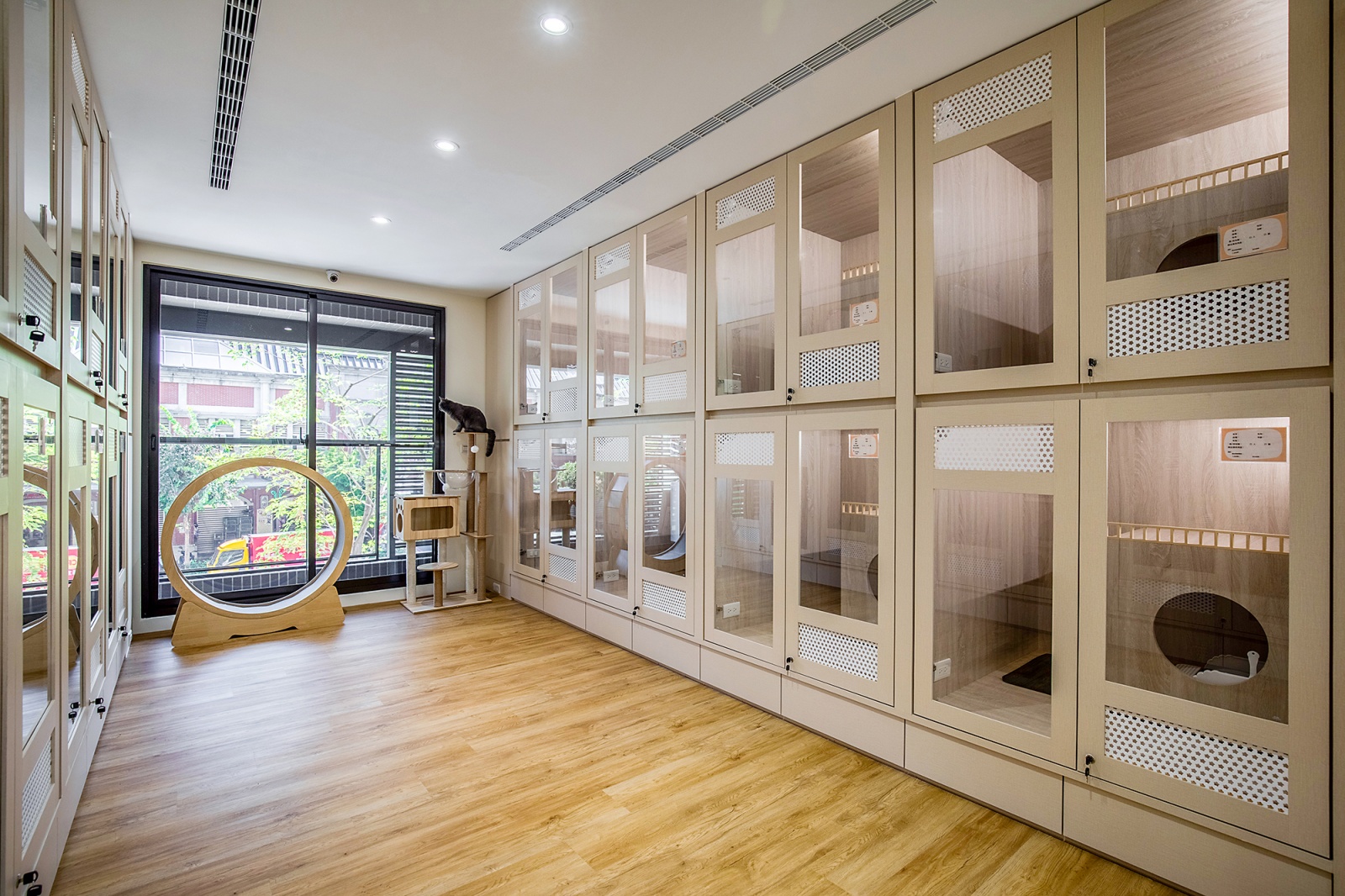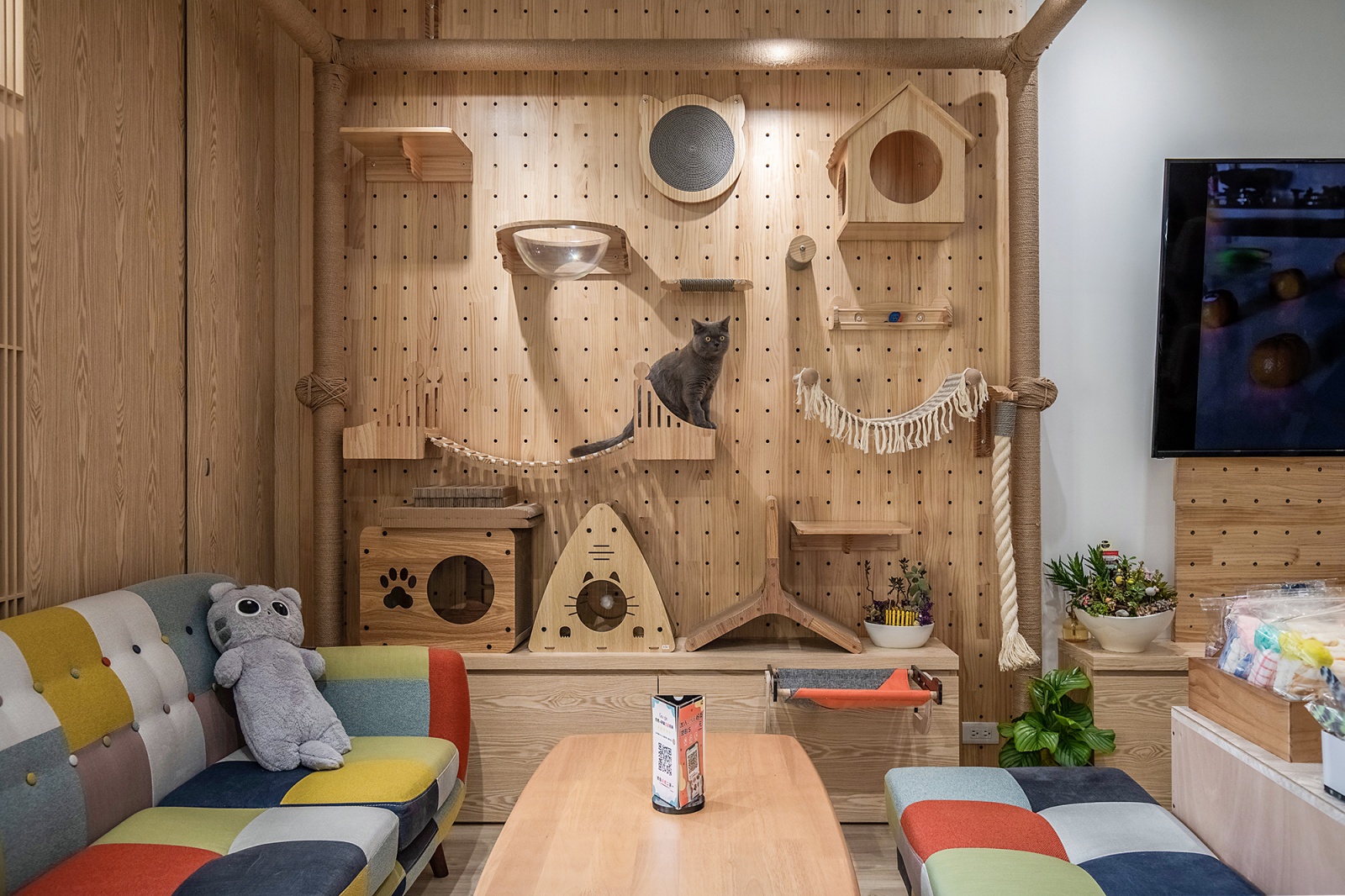 時至今日,貓咪不再只是寵物,而是陪伴飼主的家人、心靈夥伴。因應現代人的需求和對自家毛孩的重視,二樓的貓咪旅館特地以如同月子中心的高規格、高標準進行擘劃。從提供一房一wifi密碼的設定,到設置錄像、語音雙功能的監控系統,讓因工作出差而無法親自照料毛孩的飼主,能實時觀察其生活狀況,實現遠程守護。直得一提的是,貓咪住宿的房間,其上、下區間有導入可拆解設計。不僅能讓空間使用上更加靈活,還能讓來自同家庭的2~3隻貓咪一起同住,進而減少孤單與焦慮感。