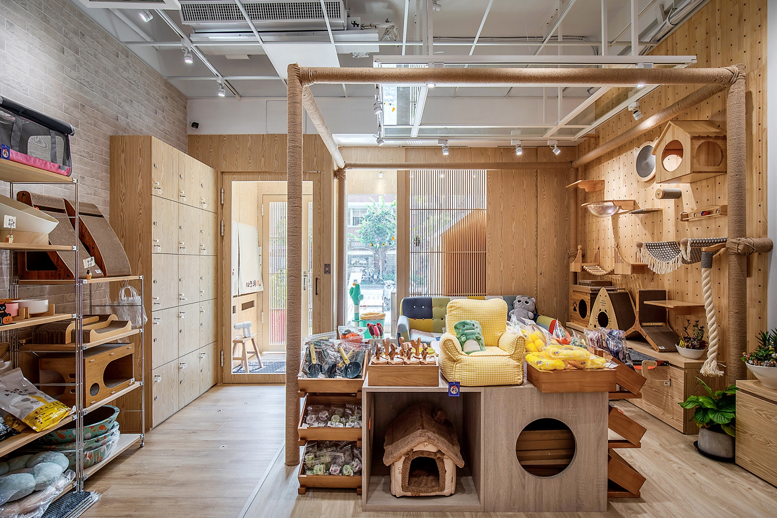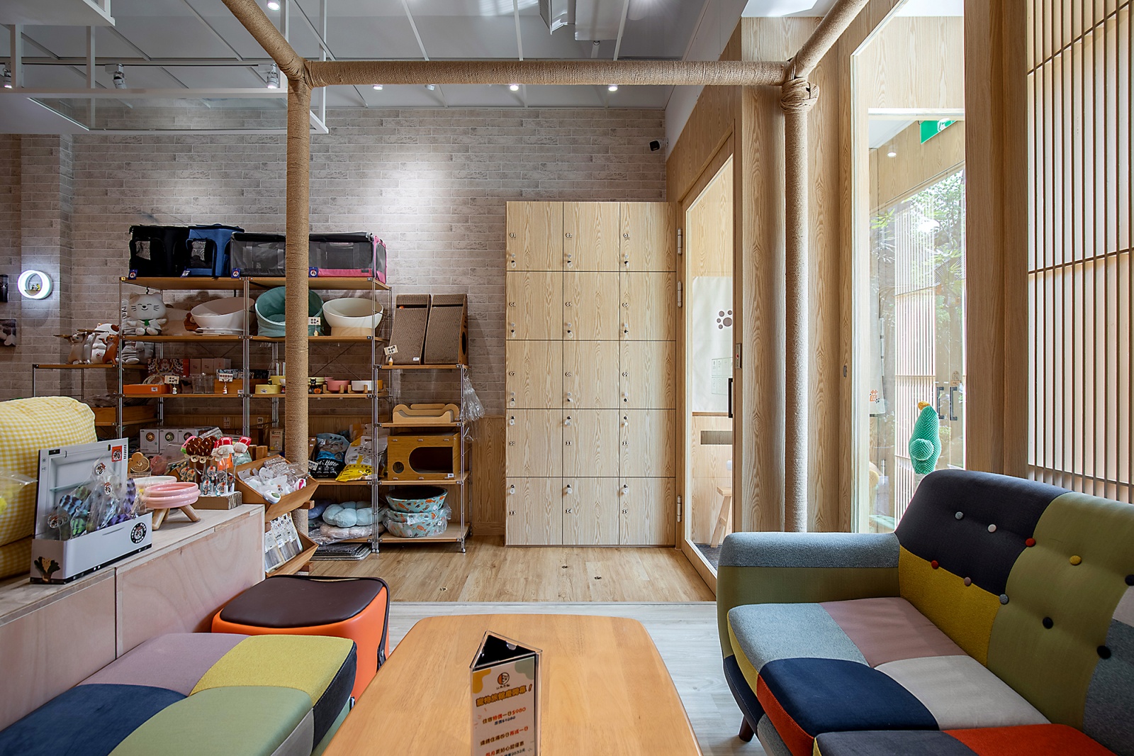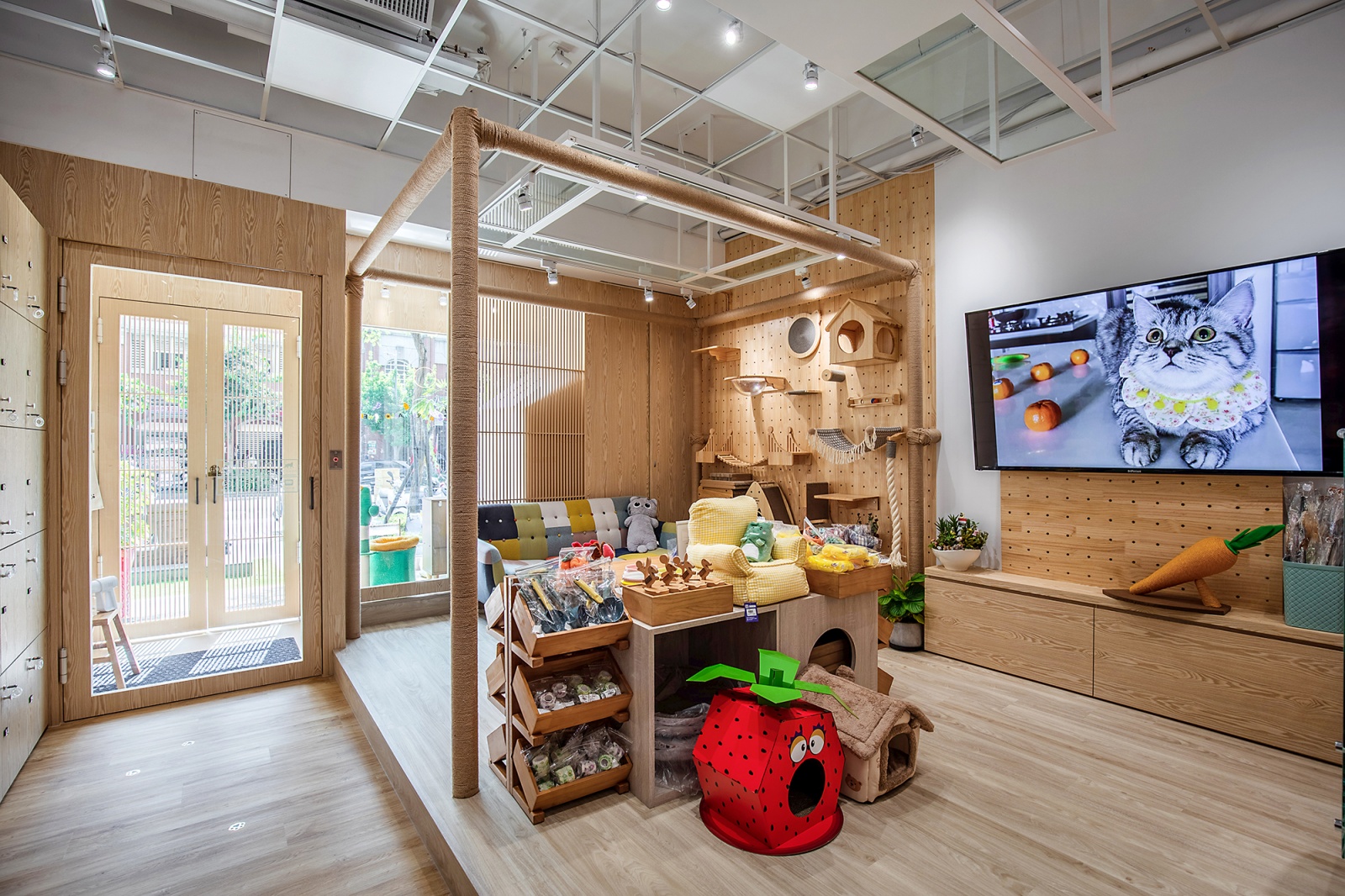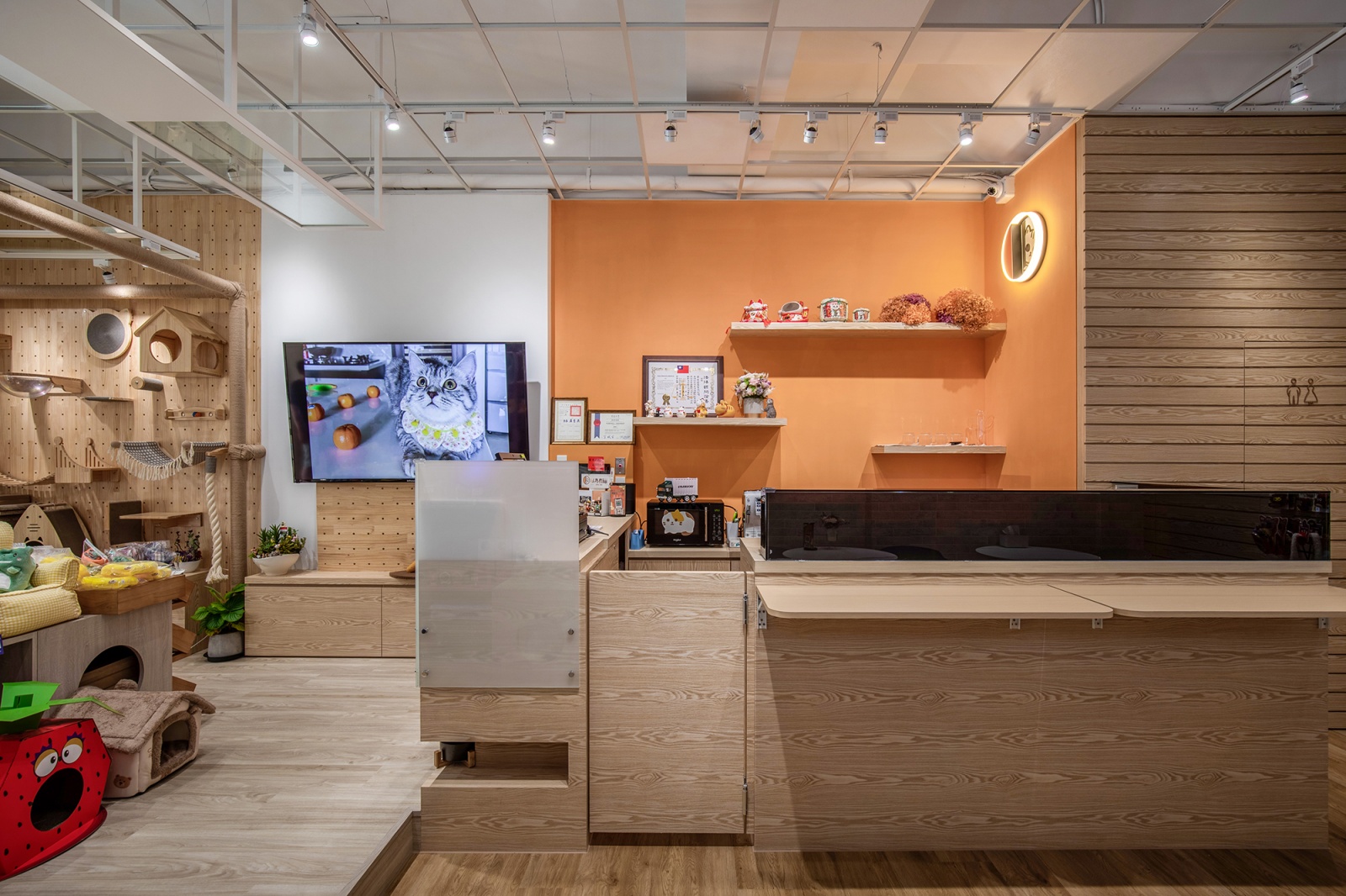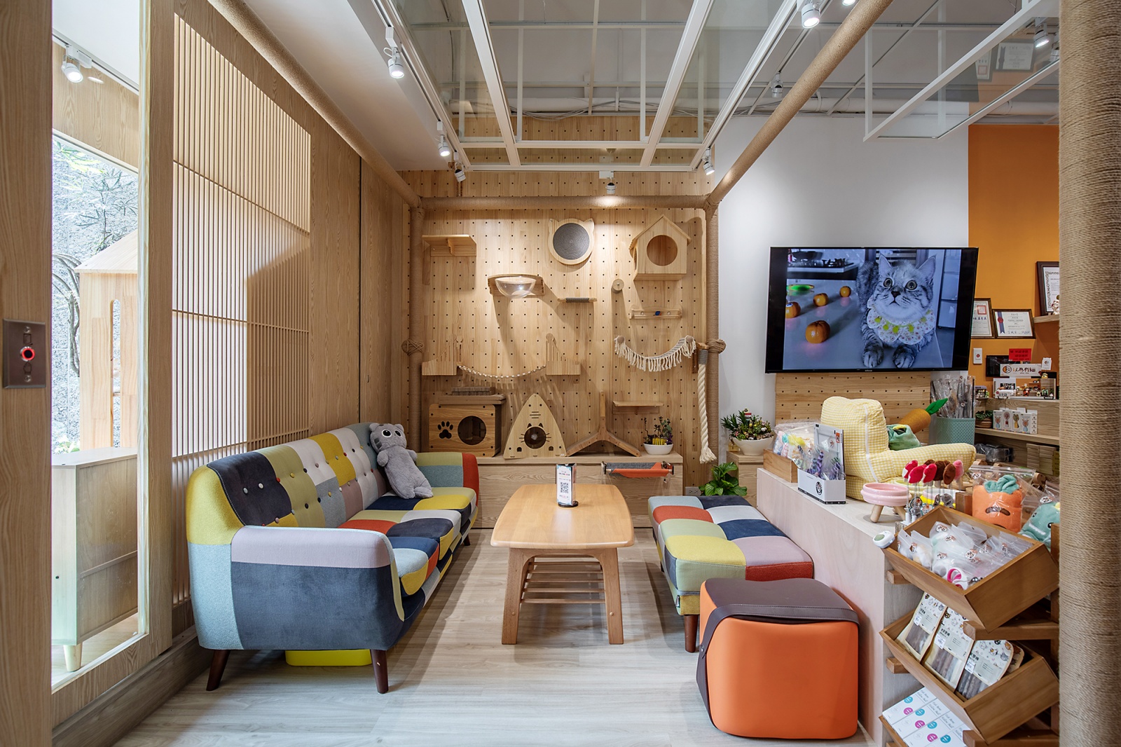 本案為商品販售店鋪結合貓咪旅館的複合式商空設計案。其佈景是以日式雜貨店的風格為主軸,再搭配木質元素的應用,可為空間挹注溫馨、親切的家居氛圍,打破商空冰冷、制式的既定印象。其中,考量到因自身居住環境限制而無法飼養貓咪的顧客,團隊特意於一樓規劃了一區如居家客廳的接待區,讓顧客能沉浸式享受與店貓的互動。而二樓即為貓咪旅館,團隊採取同月子中心的高規格設計,設置專屬監控設備,讓飼主能隨時查看自家毛孩的狀況,以安心托付。