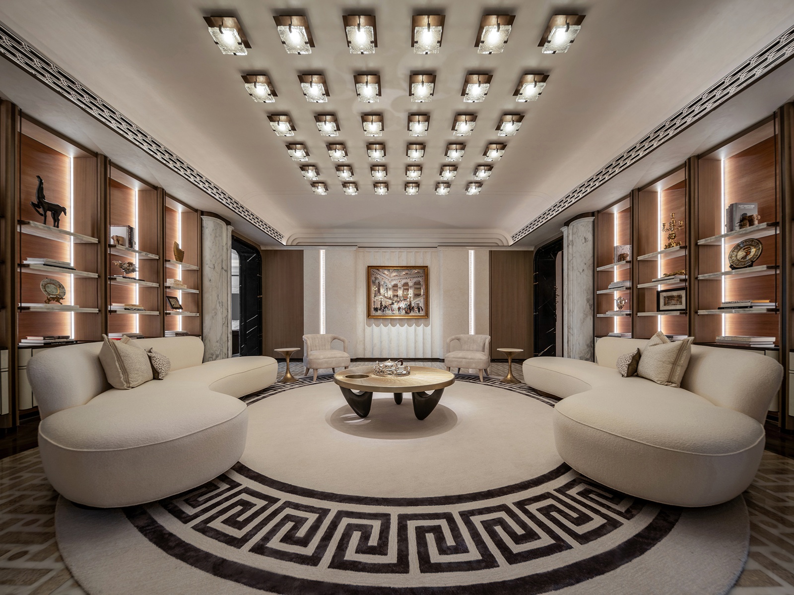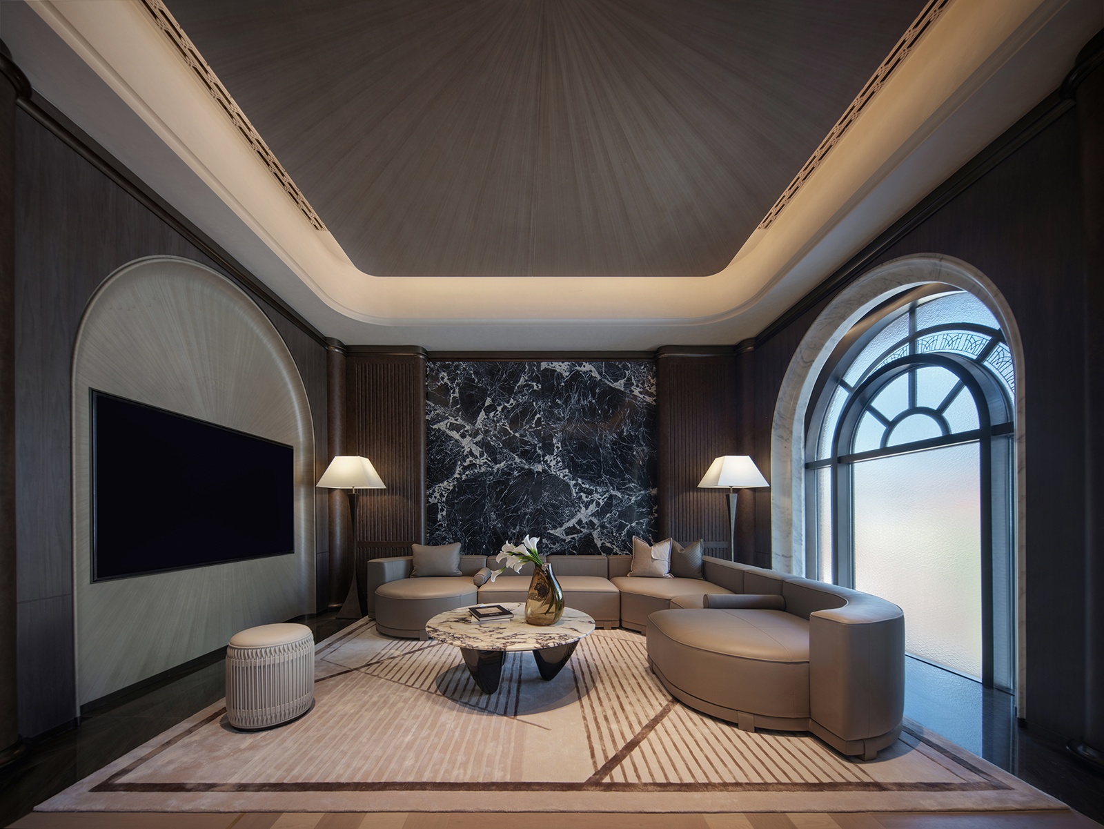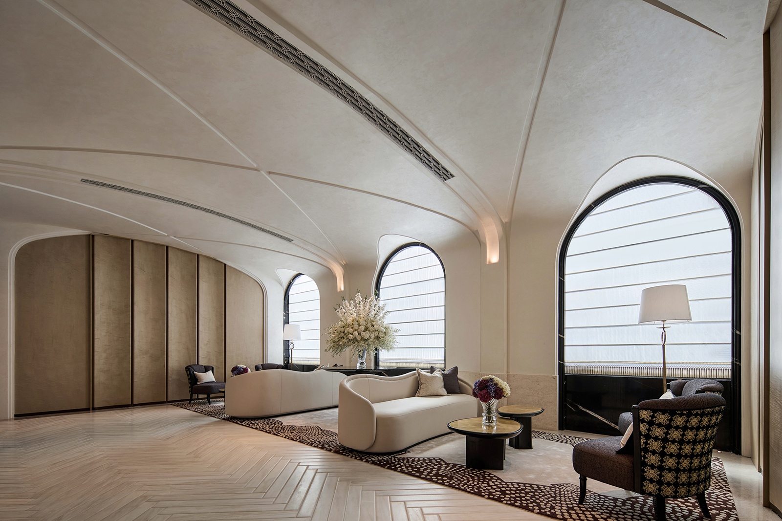 本作以巴黎歌劇院為靈感,演繹一座「時光沉澱的藝術殿堂」。團隊透過現代設計詮釋拱形結構與巴洛克曲線,揉合幾何秩序與金屬光澤,使線條於層序間錯落有致,宛若徐緩奏響的空間樂章。此外,米白與暖金色韻傾瀉其間,讓古典氣息與當代韻律相融,凝聚文化底蘊與美學格調的藝術聖堂。