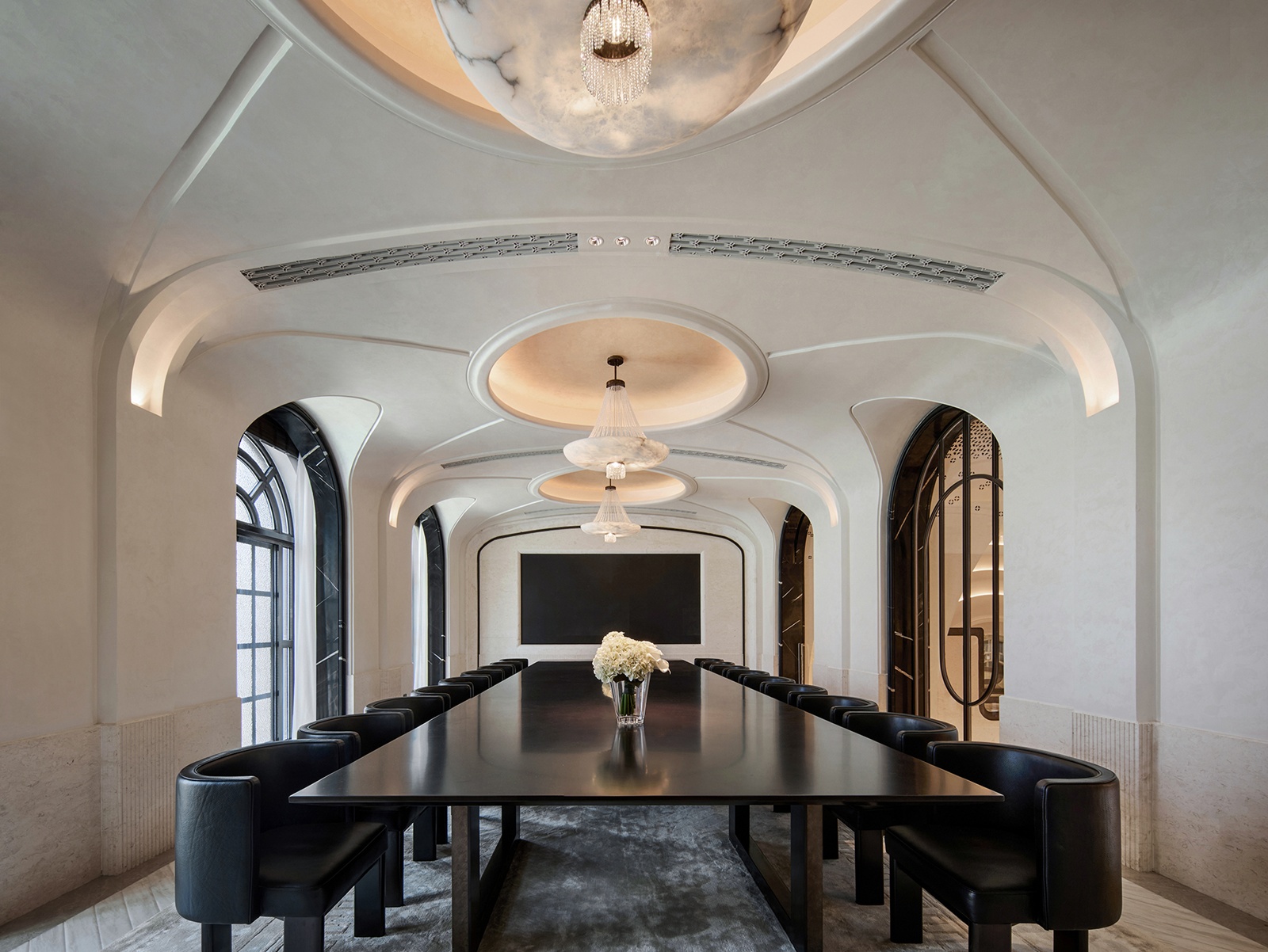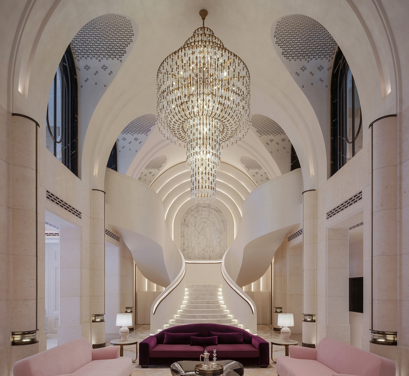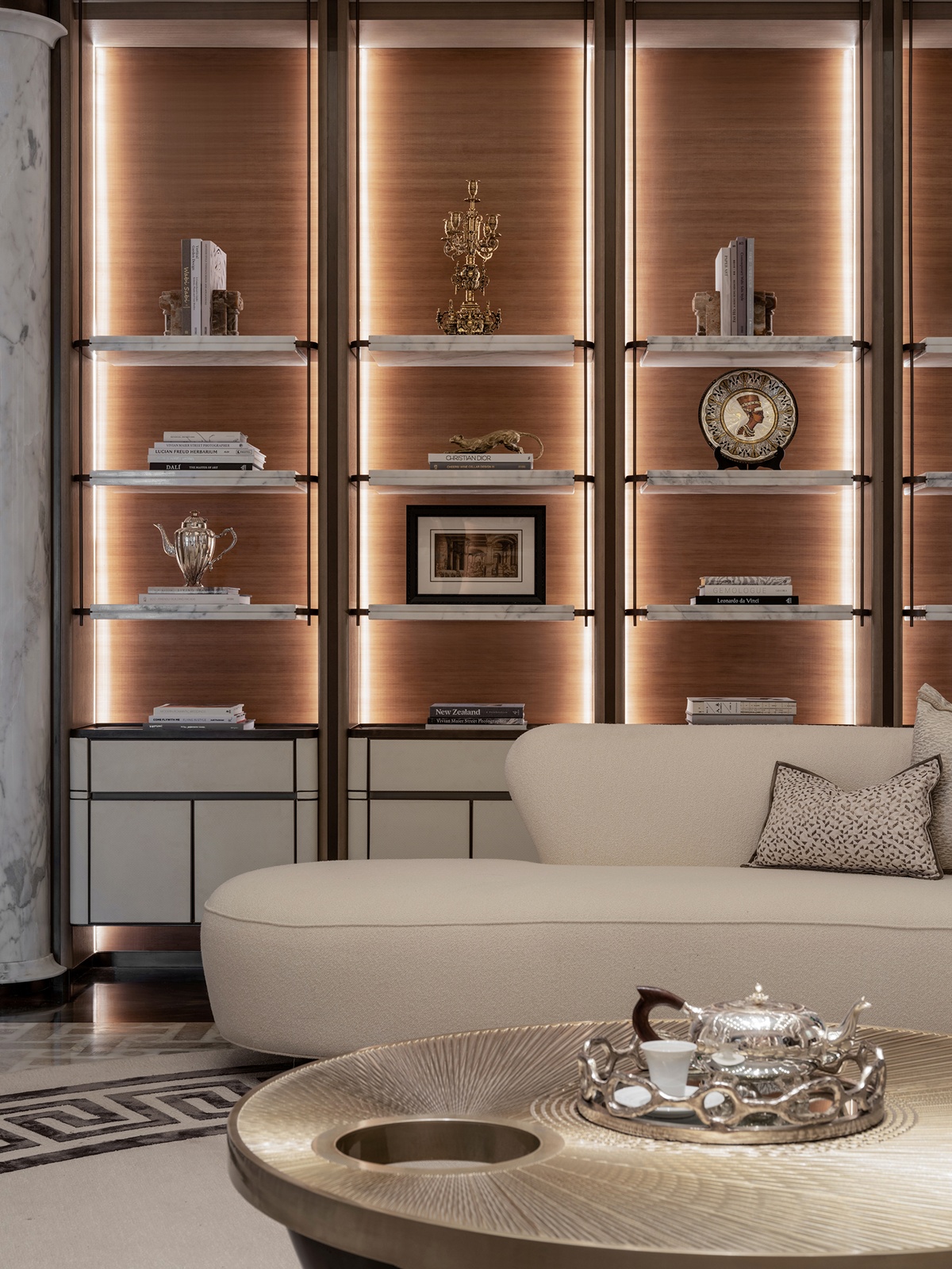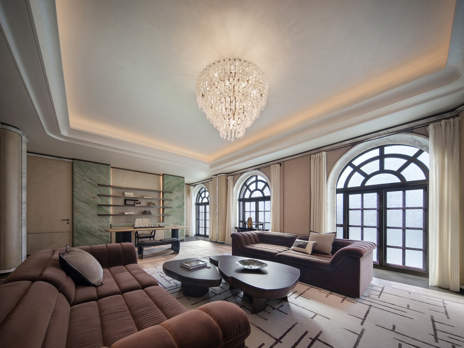 本作以巴黎歌劇院為靈感,演繹一座「時光沉澱的藝術殿堂」。團隊透過現代設計詮釋拱形結構與巴洛克曲線,揉合幾何秩序與金屬光澤,使線條於層序間錯落有致,宛若徐緩奏響的空間樂章。此外,米白與暖金色韻傾瀉其間,讓古典氣息與當代韻律相融,凝聚文化底蘊與美學格調的藝術聖堂。