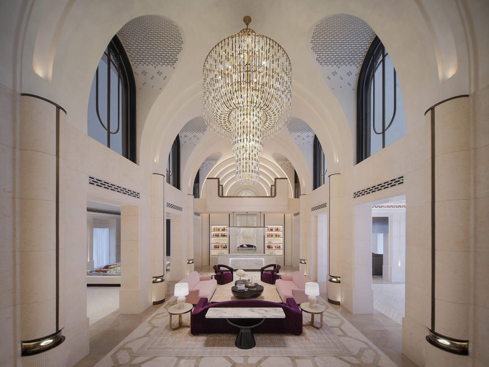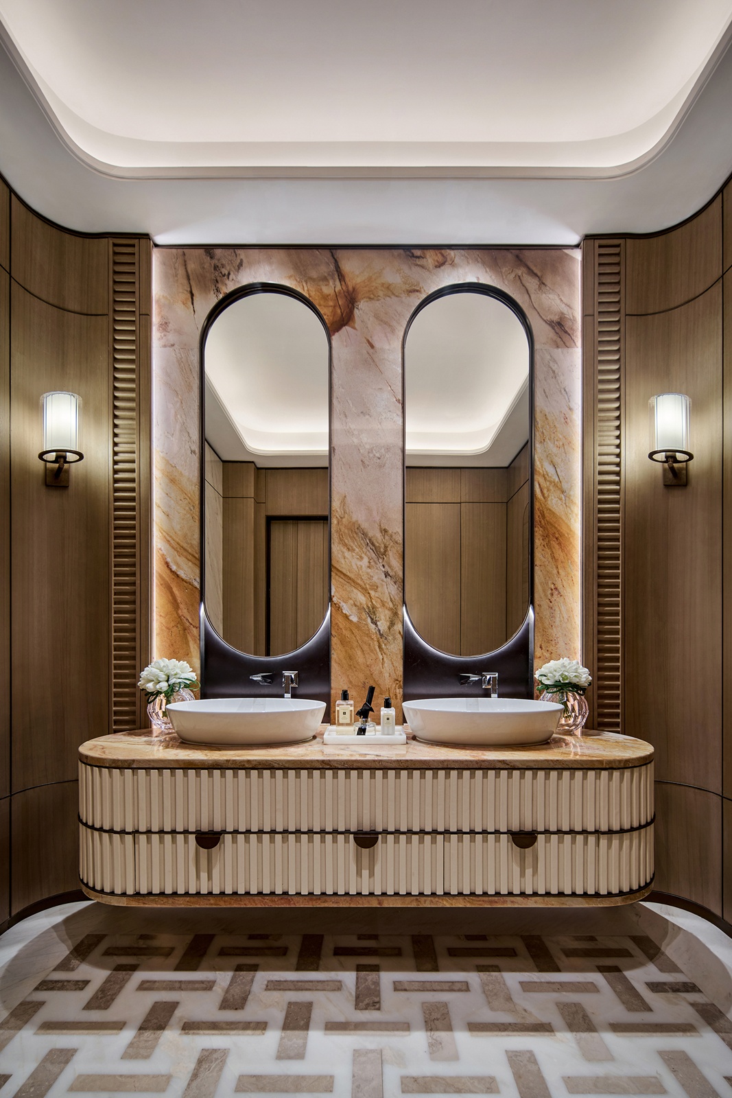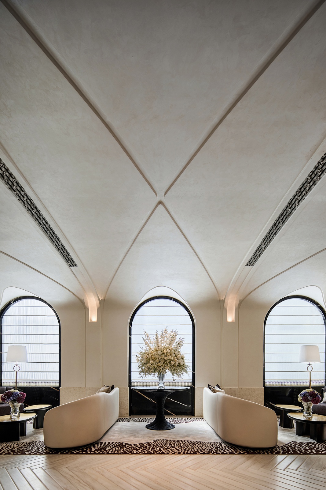設計以ART DECO風格的石材拼花構築層次,開展一齣關於比例與光影的環境歌劇。一樓接待前廳與大堂藉米白石材鋪陳肌理,金屬飾條與懸垂水晶燈細織其間,描繪其莊麗恢宏氣勢。立面以對稱手法為筆,結合金屬構件與石面相互輝映,視線依循弧形階梯蜿蜒而升,使曲線與水晶光澤交織成畫。同時,天花融入LOGO圖紋,將品牌精神化幻化為空間語彙。地坪採取面包石鋪敘,其立體紋理道出洋行與商號的歷史印跡;電梯廳設計復古樓層指示燈,於細節間點亮文化溫度。