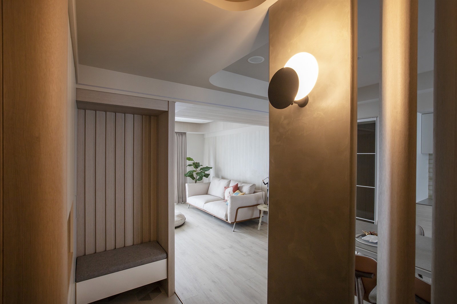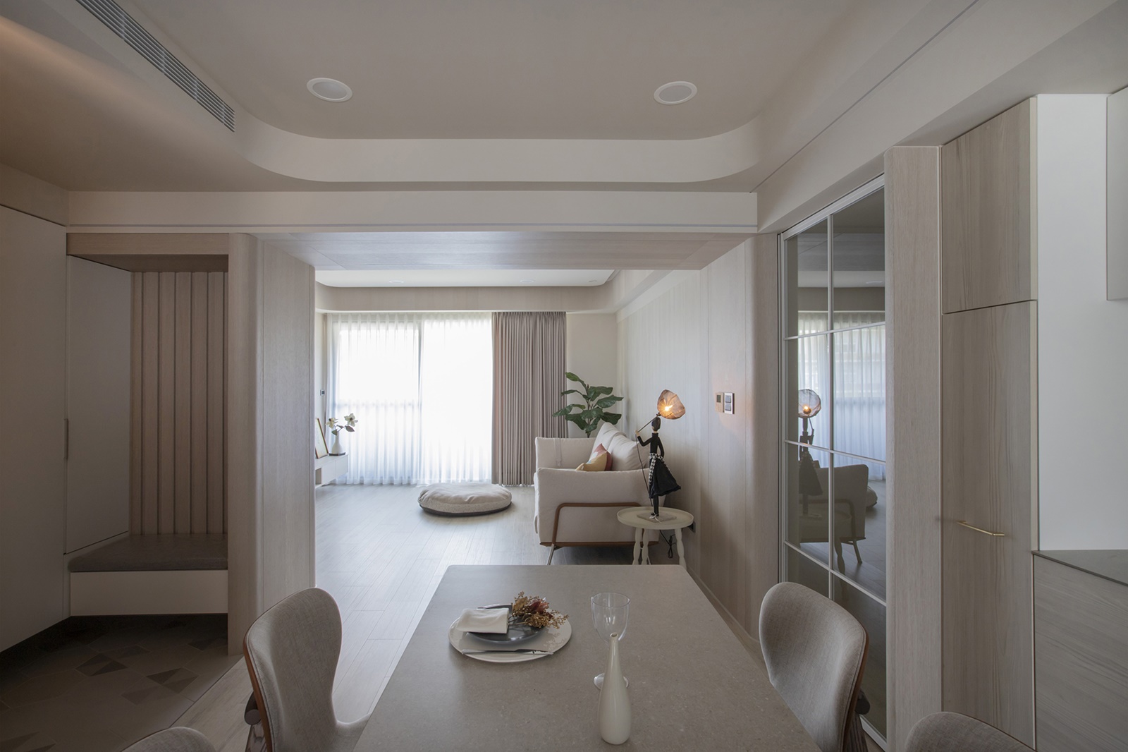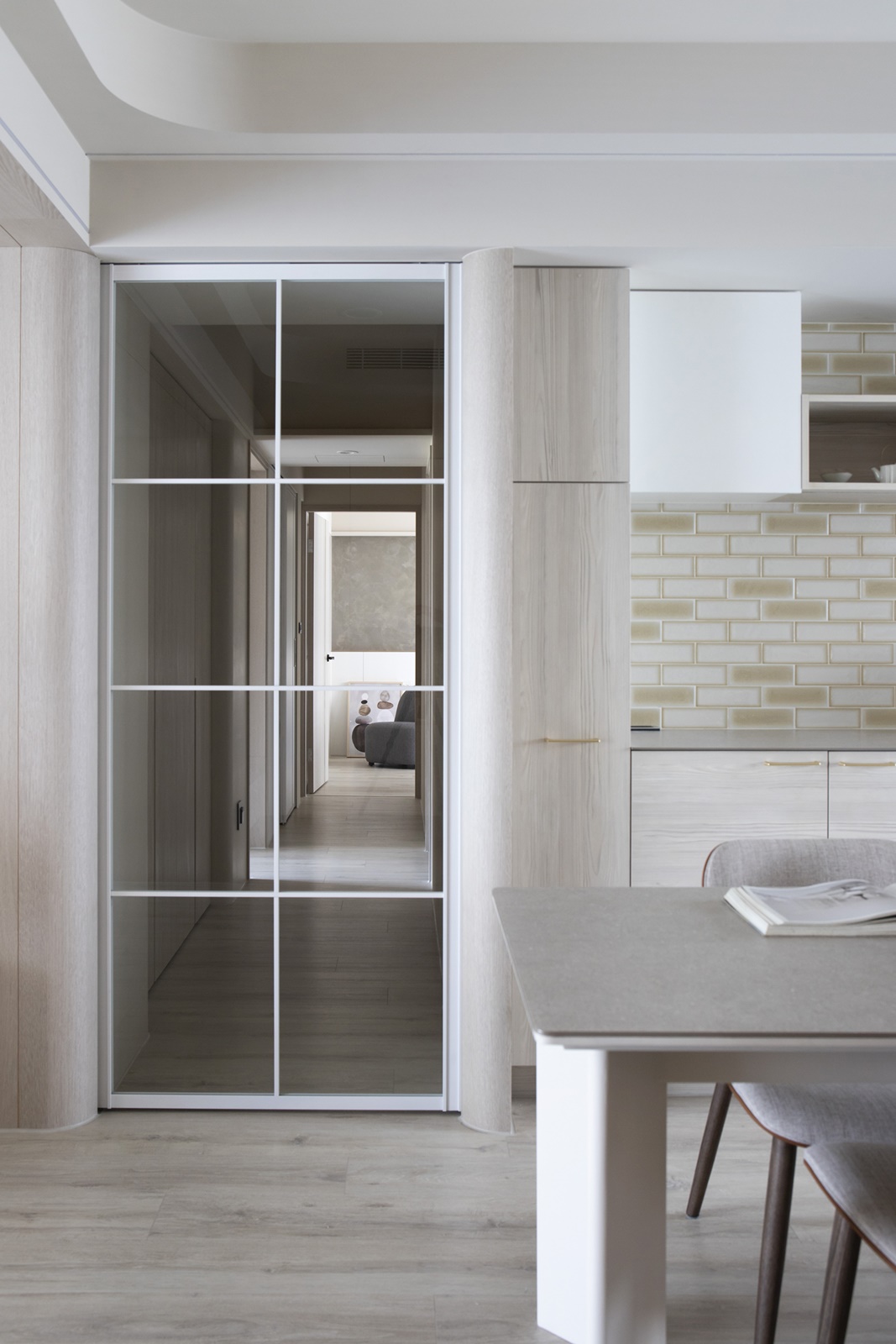 甫入屋,玄關與公領域之間設有格柵作為屏風,既能界定場域,又能延續自然光的流淌,維持空間的明亮度。向內走至公領域,團隊特意在部分牆面轉角、天花板、傢俱導入圓弧元素,再搭配溫潤的木料應用,以消弭住所原先的冷硬感。而為發揮開窗引光的最大成效,團隊先是採用了開放式佈局整合客、餐廳,接著再選用玻璃拉門作為廚房、戶外工作間和私領域的隔間設計,以此塑造出寬敞明亮的空間感受。另外,考量到居者大量的收納需求,團隊在客廳電視牆後亦有增設儲藏室,而其門扇是採用暗門設計,能將其隱匿於場域之中。