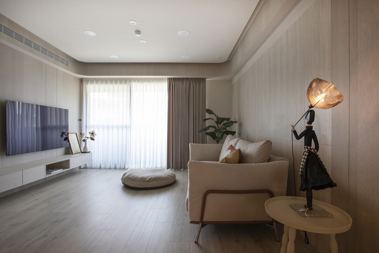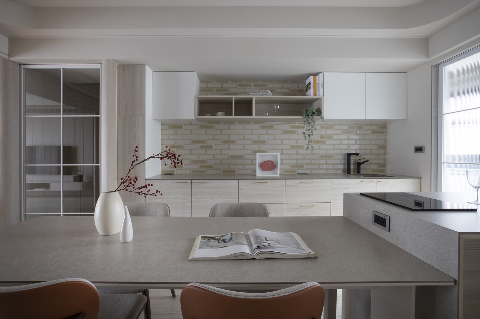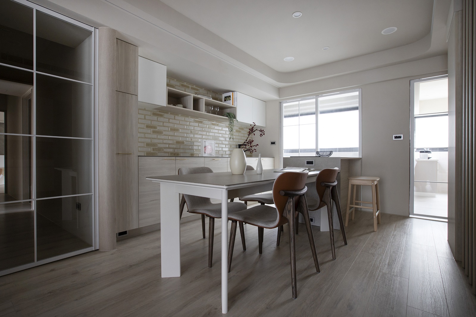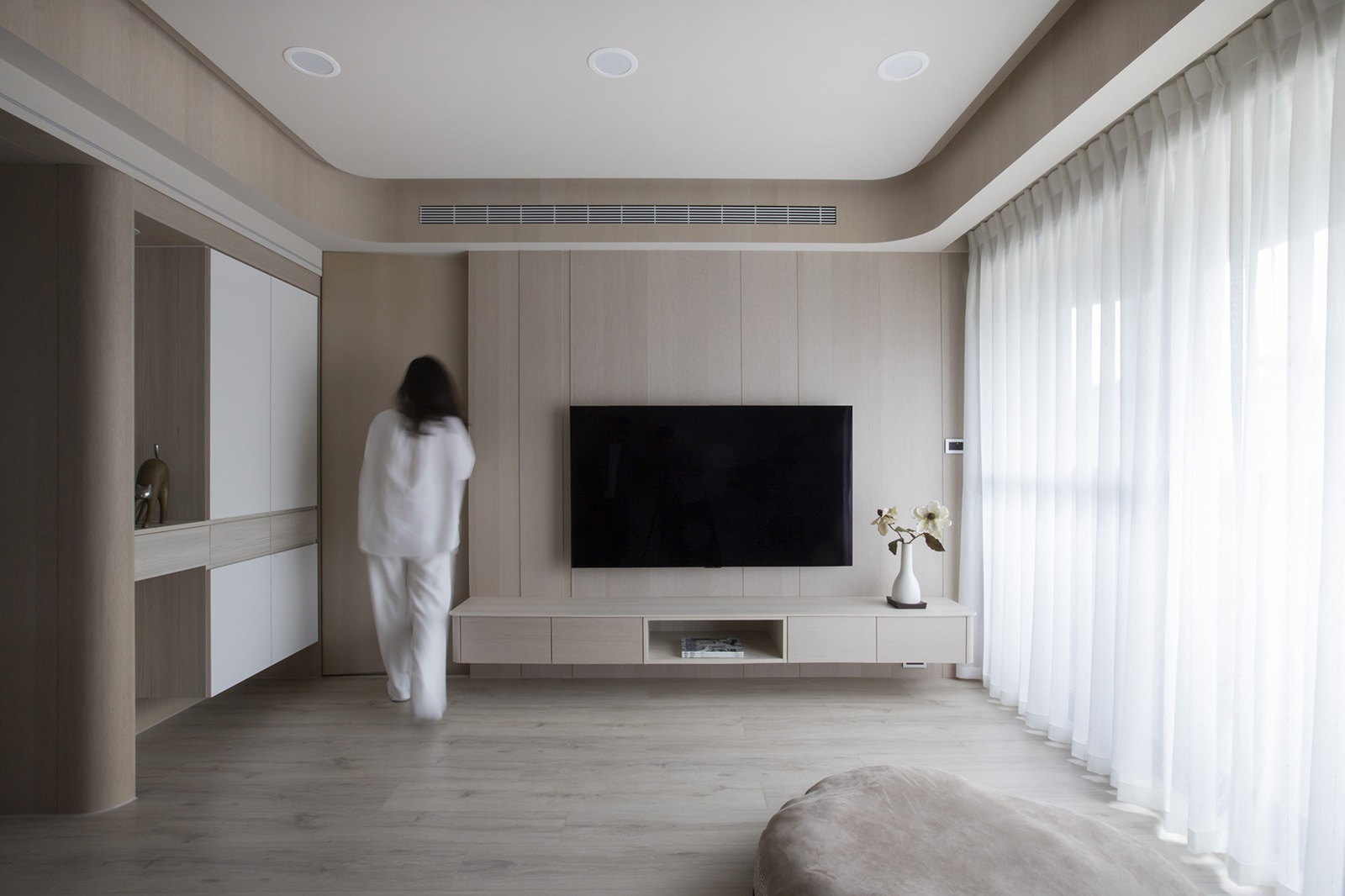 甫入屋,玄關與公領域之間設有格柵作為屏風,既能界定場域,又能延續自然光的流淌,維持空間的明亮度。向內走至公領域,團隊特意在部分牆面轉角、天花板、傢俱導入圓弧元素,再搭配溫潤的木料應用,以消弭住所原先的冷硬感。而為發揮開窗引光的最大成效,團隊先是採用了開放式佈局整合客、餐廳,接著再選用玻璃拉門作為廚房、戶外工作間和私領域的隔間設計,以此塑造出寬敞明亮的空間感受。另外,考量到居者大量的收納需求,團隊在客廳電視牆後亦有增設儲藏室,而其門扇是採用暗門設計,能將其隱匿於場域之中。