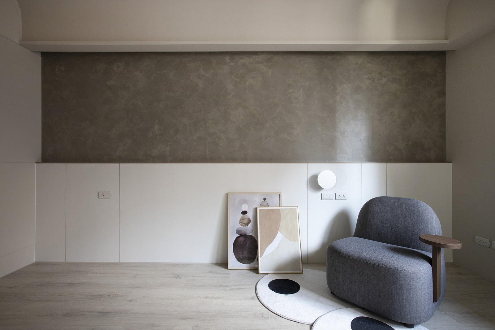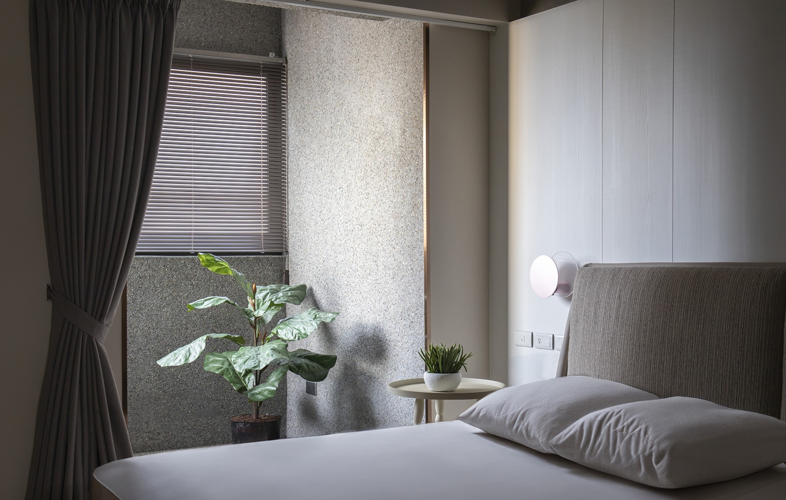 順著動線走向私領域,團隊不僅於廊道壁面嵌入櫃體,更是選用了相同的材質將櫃門與牆面融為一體,以此達到美觀與實用性。在臥室的空間塑造上強調個性化設計,團隊特意依循不同居者的喜好,分別為每間臥房導入相應的顏色,並規劃出獨特的空間場景。譬如主臥的更衣室門片與衣櫃的門片選擇相同造型,能為居者帶來新奇有趣的使用體驗;擁有半室內陽台的臥房,能為居者提供蒔花弄草的小天地,以享受綠意繚繞的生活。