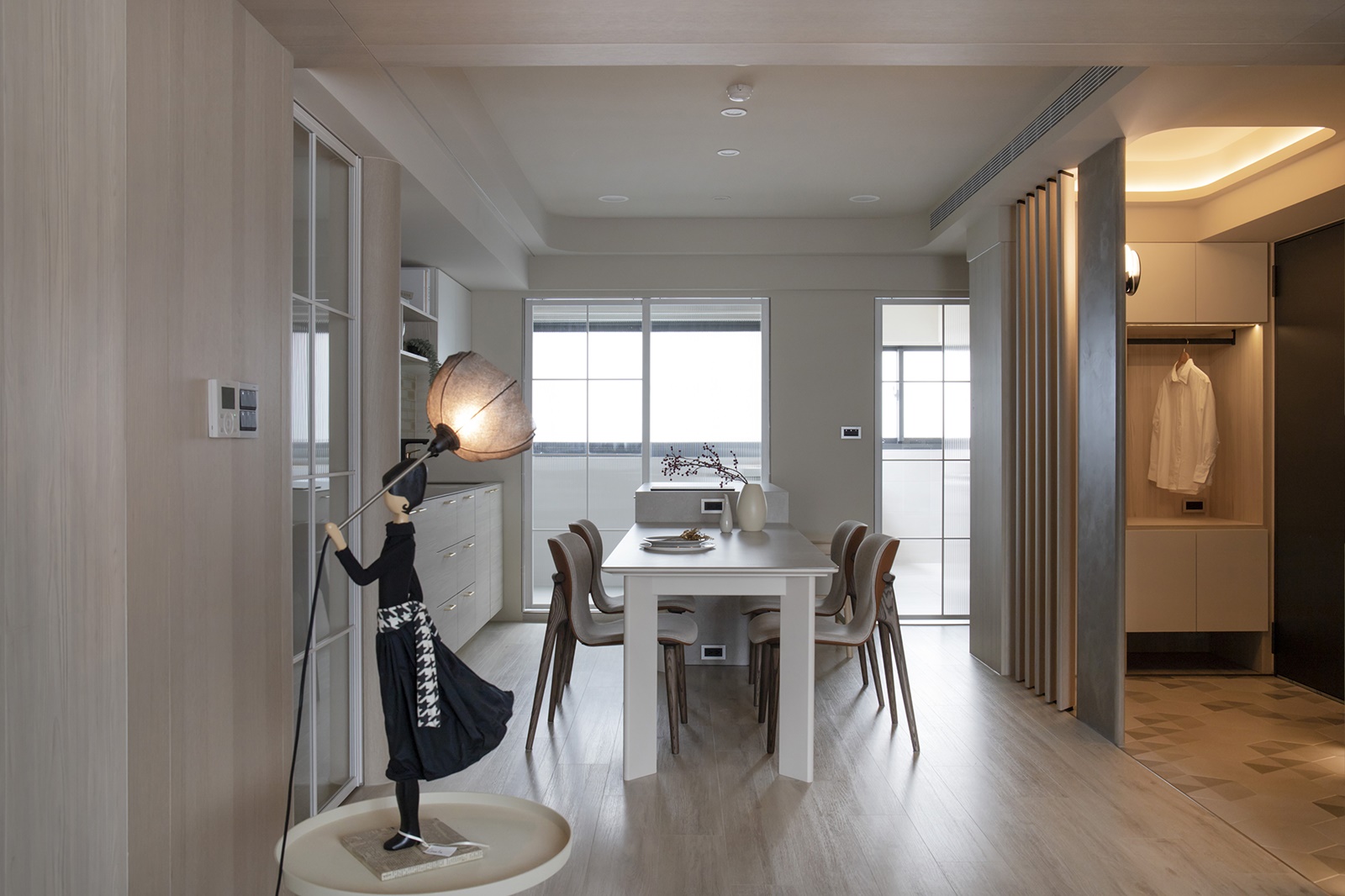 本案為舊屋翻修規劃案。隨著業主家中三位孩童長大成人,其便決定為孩子提供專屬的居住環境。為此,專門委託團隊將原有的辦公空間重新改造,以構建出符合三位女兒生活的住所。整體設計依循三位女孩的居住需求,對格局進行了大幅度的調整,包括規劃出開放式的客、餐廳及附設更衣室的臥房。其中,臥室又分為兩間套房和一間擁有半室內陽台的雅房。藉此,不僅為三姊妹提供了互動交流的公共空間、個人獨享的私人場域,也滿足了大容量的收納需求。