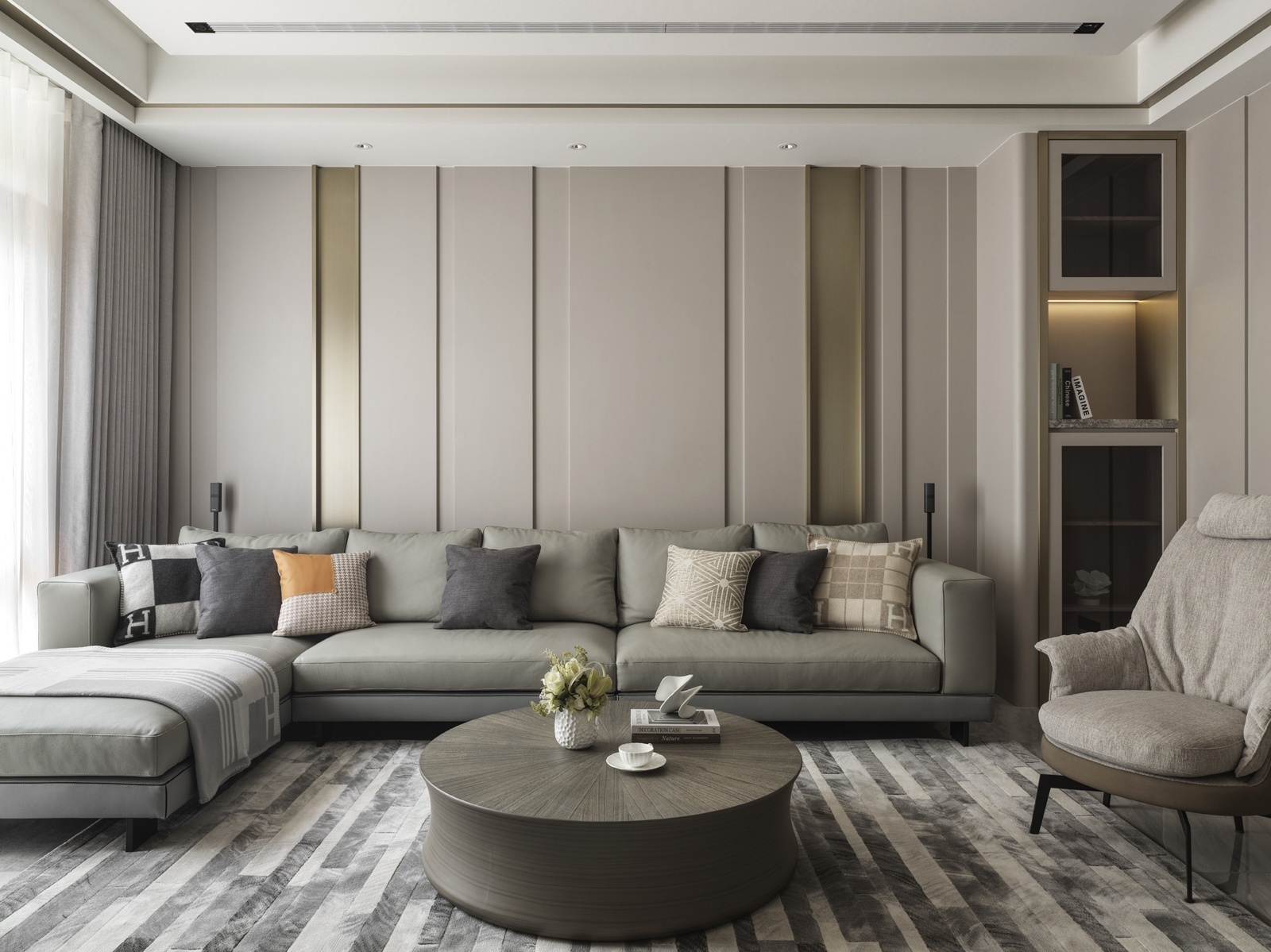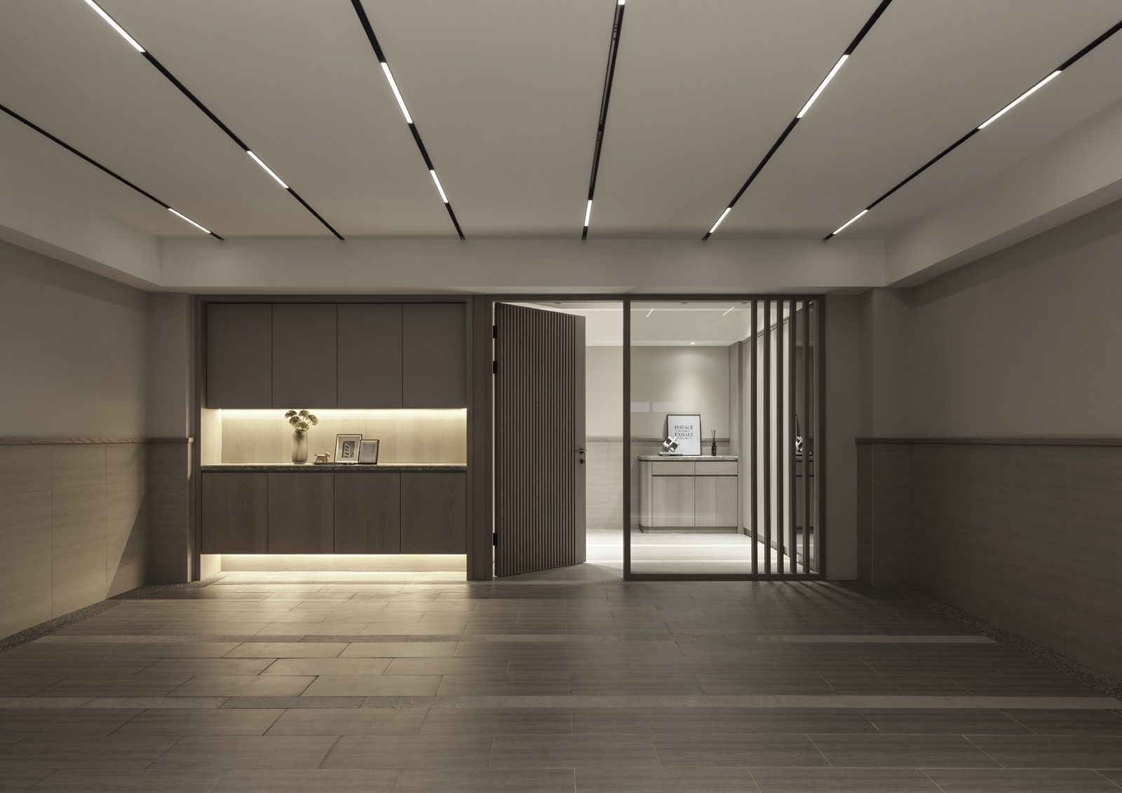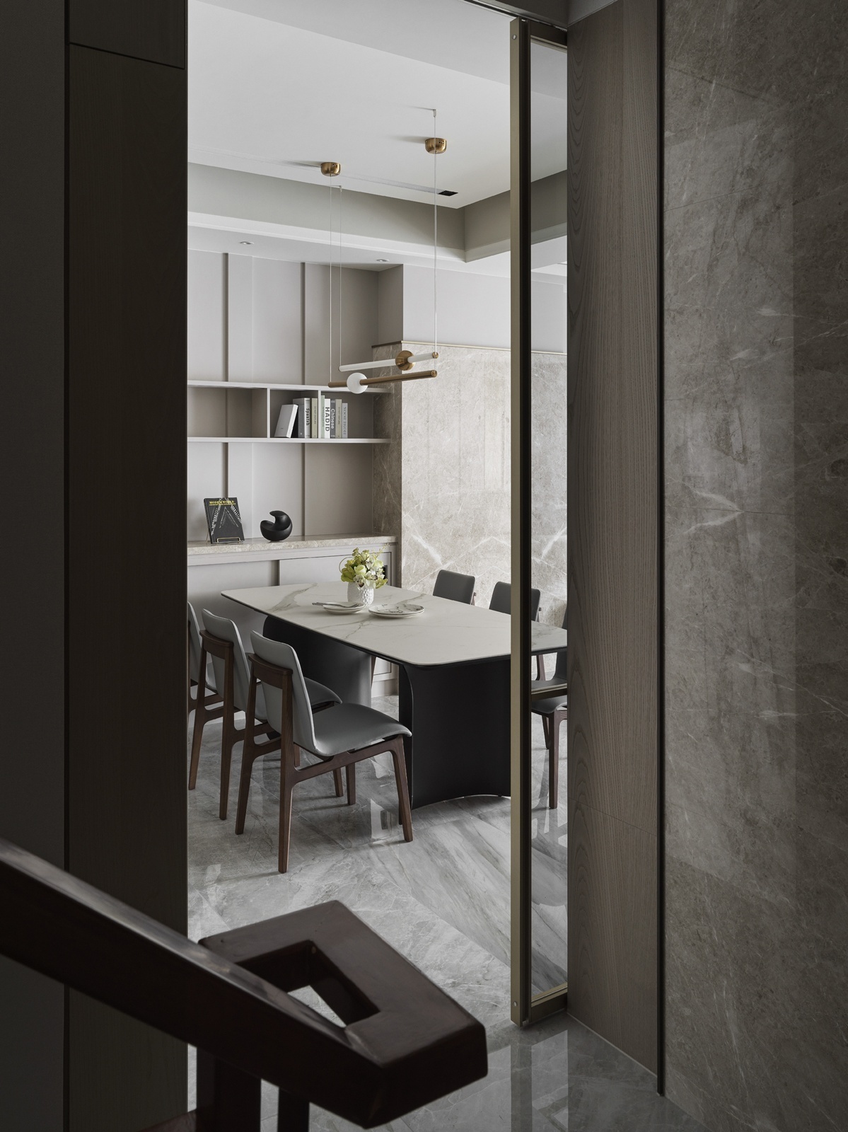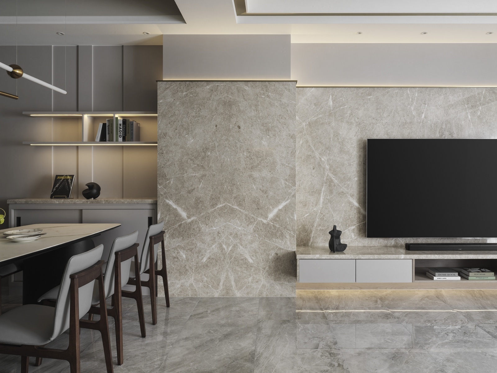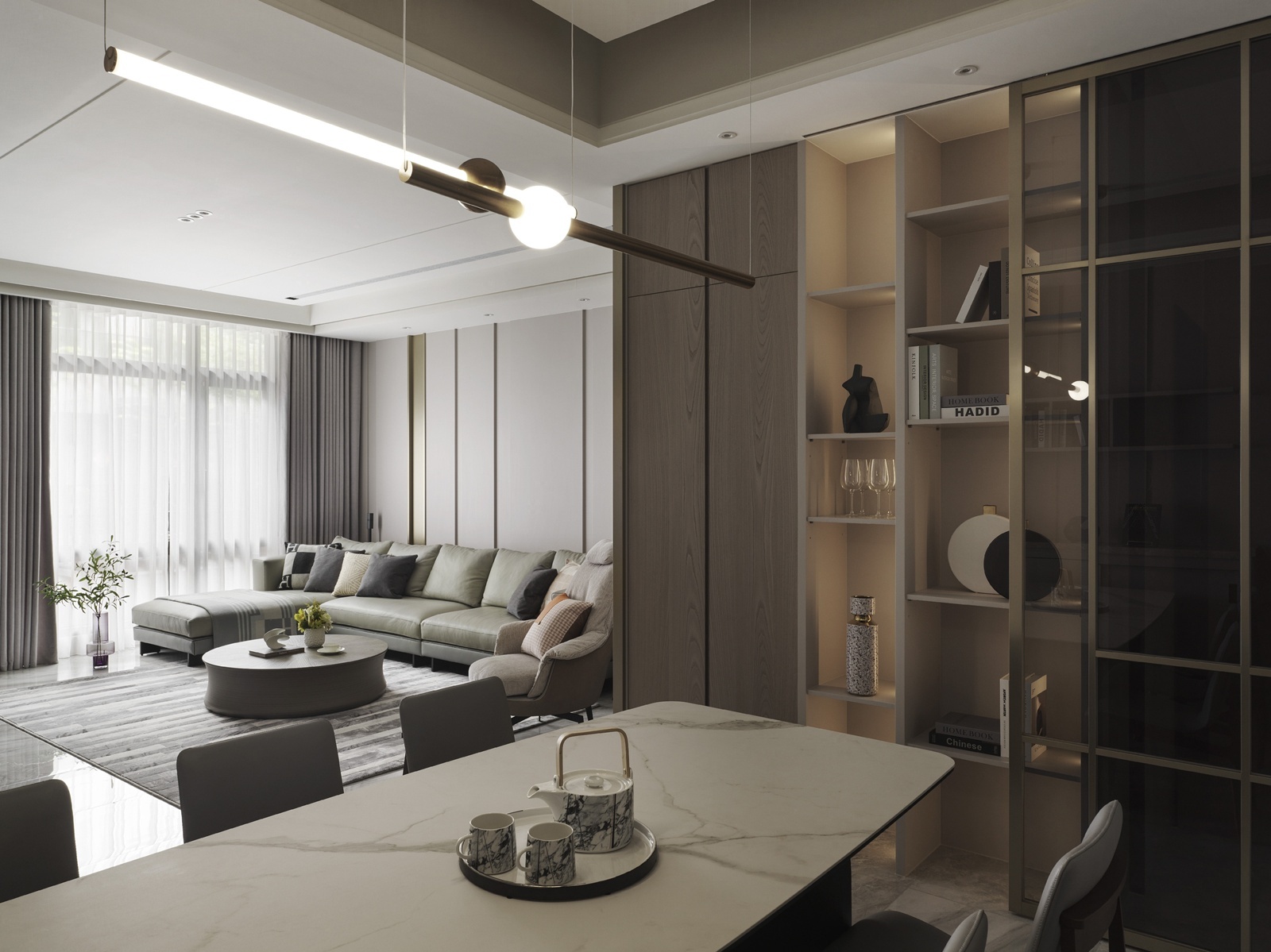 一樓為車庫與玄關機能空間,動線經由樓梯或電梯上行,逐步展開明亮寬敞的客餐場域。客廳以L型沙發與單椅構成開放式對話區,並配置象徵財位的展示櫃,呼應屋主風水需求。後方牆面運用垂直線板與金屬飾條增添層次,展現沈穩有序的立面語調。電視牆採用與地坪及櫃體呼應的石紋,搭配階梯式立面與嵌入式燈條,延展視覺比例並串聯餐廳區域。餐廳主牆搭配層架與造型吊燈,通往廚房與樓梯間則以金屬玻璃拉門界定分區。主臥延續整體的暖灰色調,融入橘色抱枕作為跳色點綴。一盞金屬環形吊燈垂掛於側,與壁面光影相映成趣,為臥房注入優雅氣息。衛浴空間以深淺石材結合木質鋪面,平衡冷暖材質比例,營造沉靜溫潤的洗浴氛圍。配置上除浴缸亦規劃有淋浴區,滿足多元使用情境。