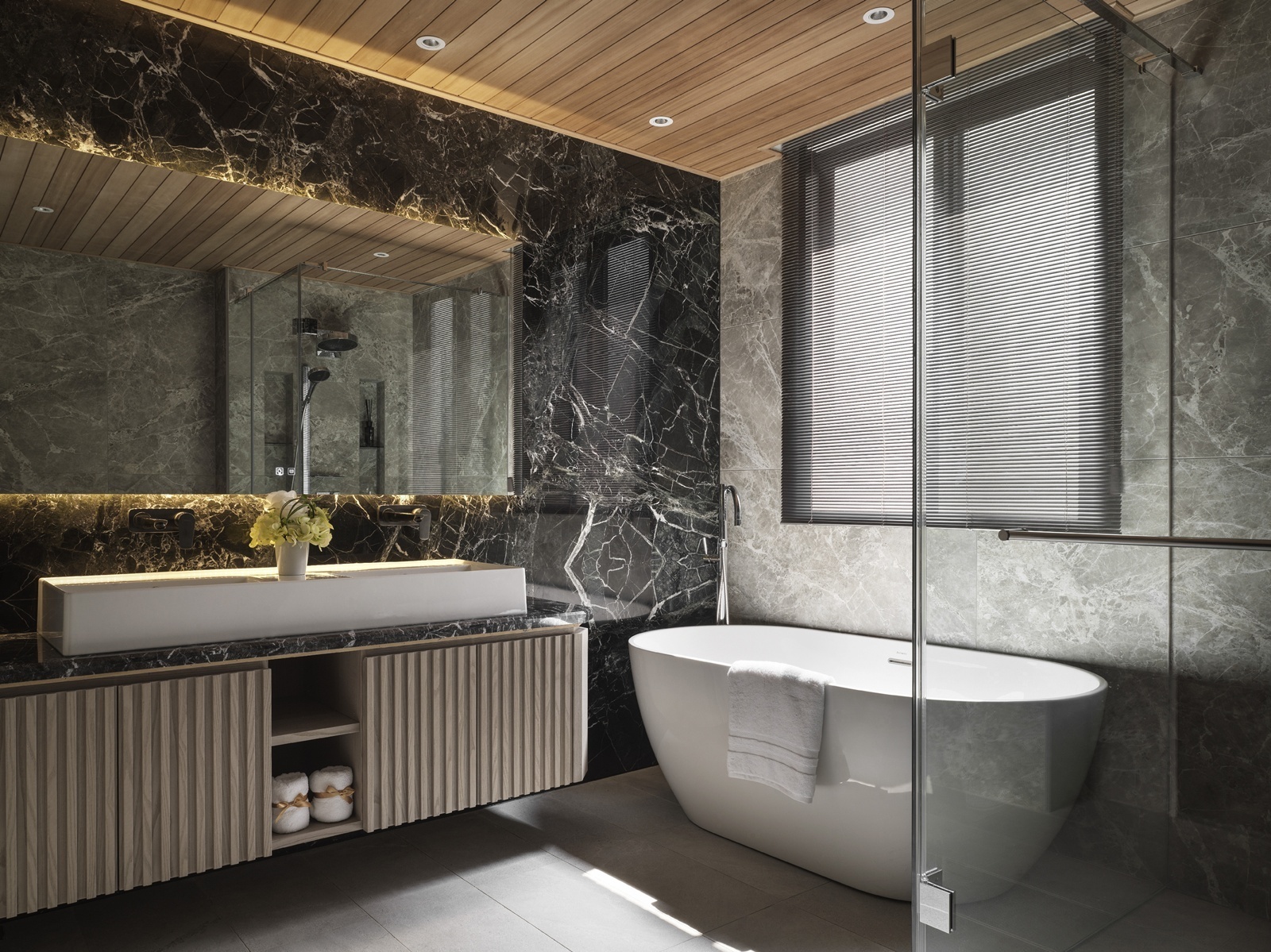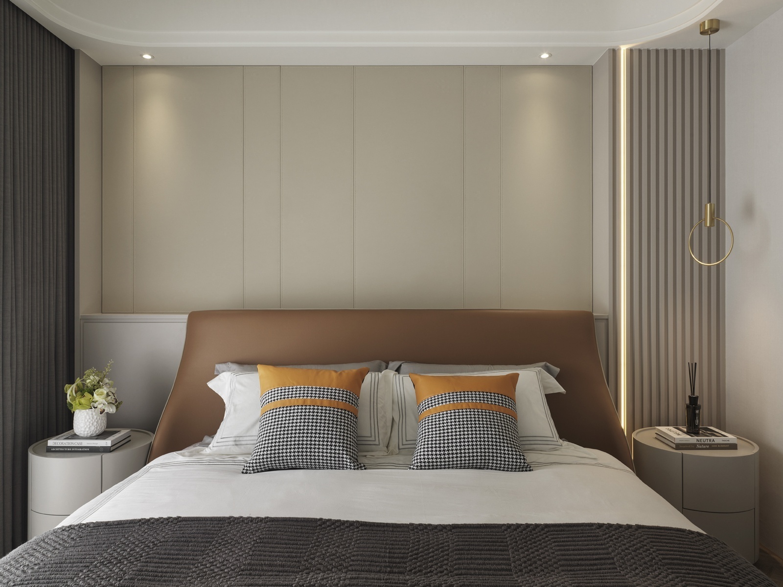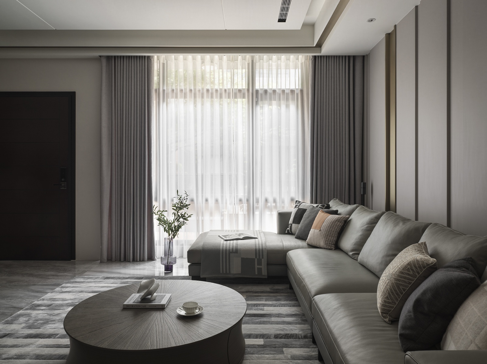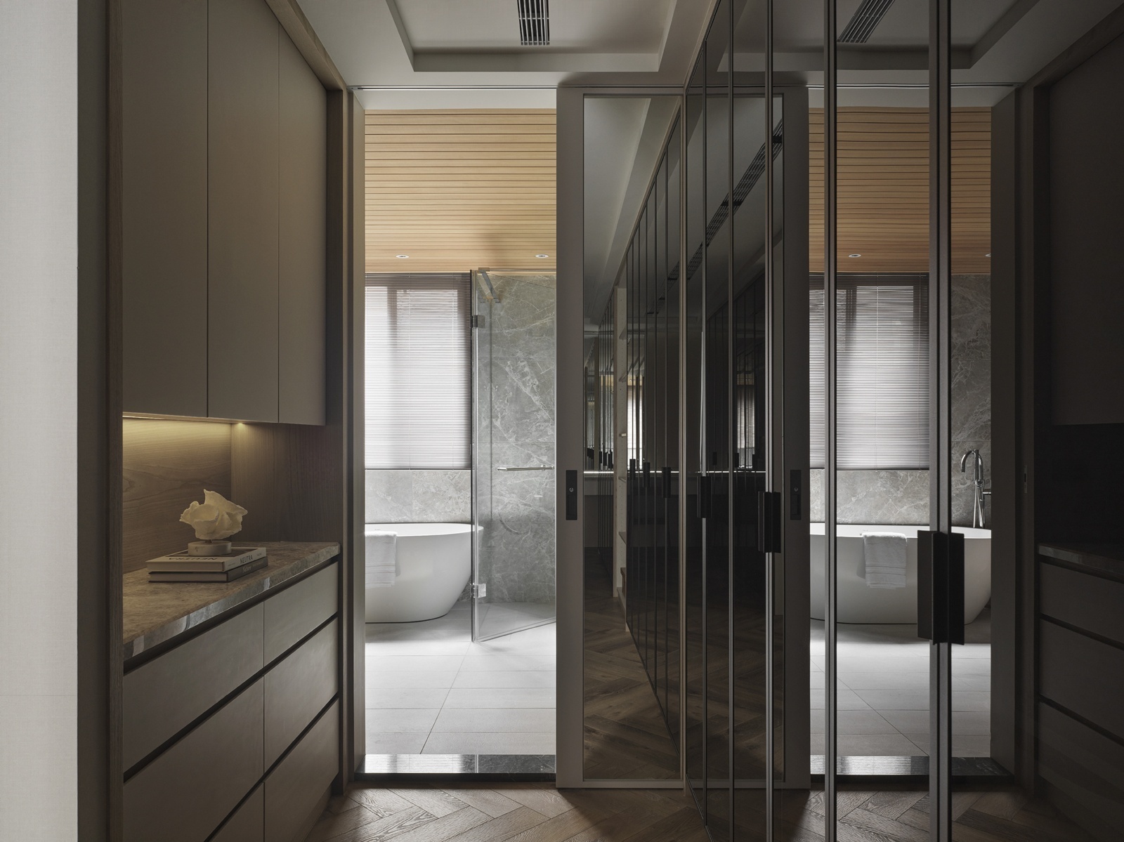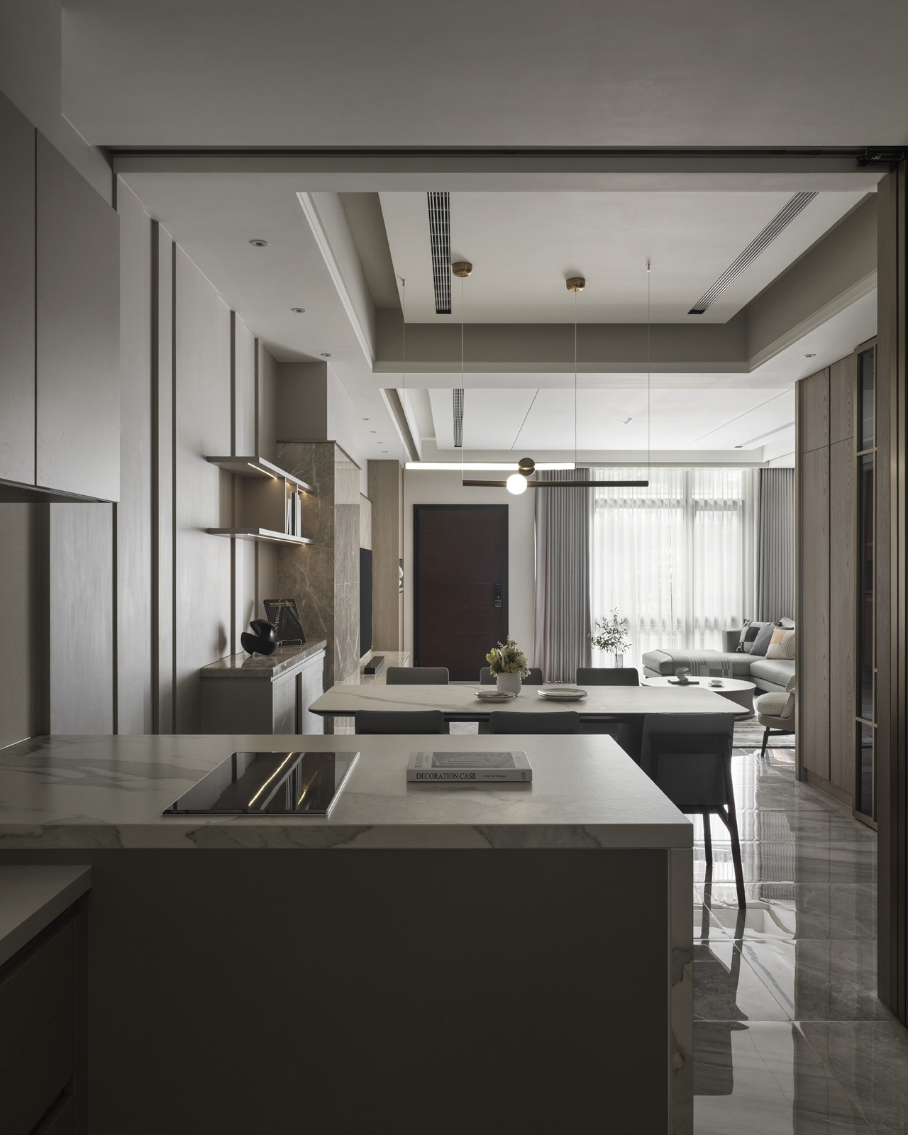 一樓為車庫與玄關機能空間,動線經由樓梯或電梯上行,逐步展開明亮寬敞的客餐場域。客廳以L型沙發與單椅構成開放式對話區,並配置象徵財位的展示櫃,呼應屋主風水需求。後方牆面運用垂直線板與金屬飾條增添層次,展現沈穩有序的立面語調。電視牆採用與地坪及櫃體呼應的石紋,搭配階梯式立面與嵌入式燈條,延展視覺比例並串聯餐廳區域。餐廳主牆搭配層架與造型吊燈,通往廚房與樓梯間則以金屬玻璃拉門界定分區。主臥延續整體的暖灰色調,融入橘色抱枕作為跳色點綴。一盞金屬環形吊燈垂掛於側,與壁面光影相映成趣,為臥房注入優雅氣息。衛浴空間以深淺石材結合木質鋪面,平衡冷暖材質比例,營造沉靜溫潤的洗浴氛圍。配置上除浴缸亦規劃有淋浴區,滿足多元使用情境。