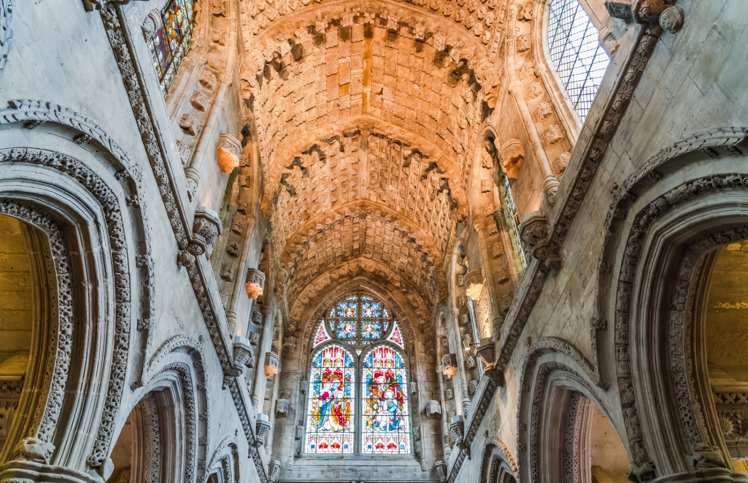 透過大窗戶的日光照亮了壯觀的天花板拱頂,裝飾著玫瑰、百合花和浮雕