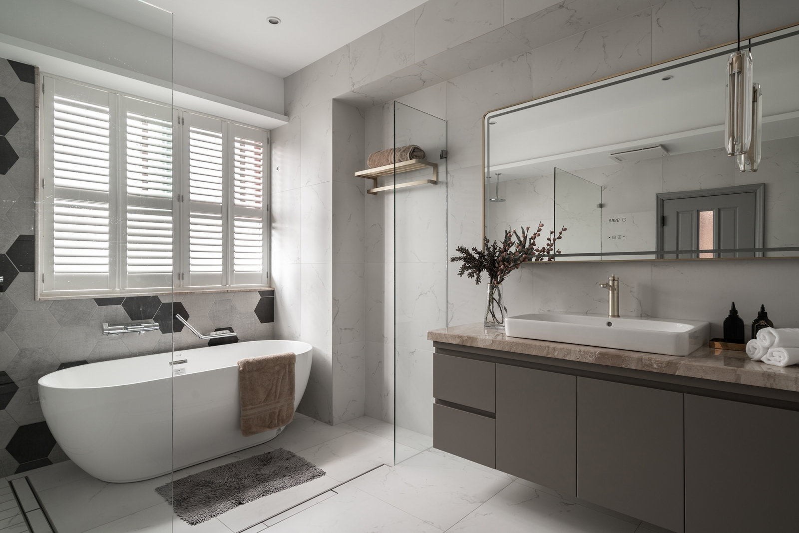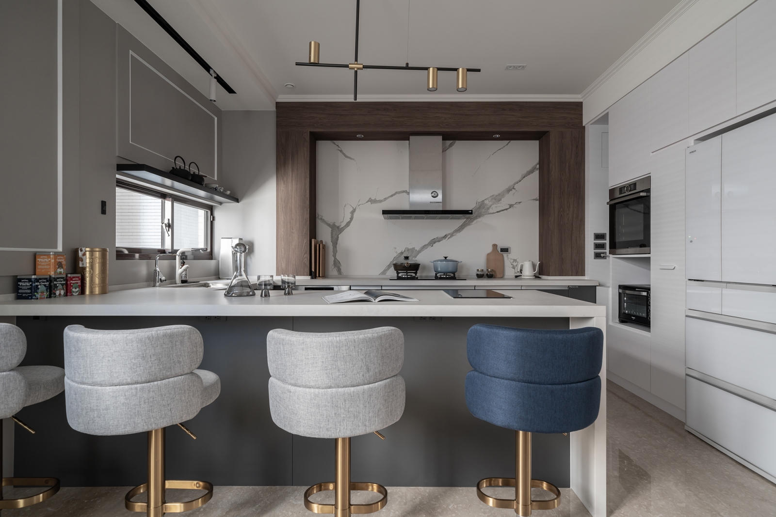 而二樓則是全面改裝,從拆除客廳、餐廚區之間的隔間到色彩統合,皆是為了讓場域顯得敞亮、輕盈。其中,兩區過道間設有整面展示櫃,以陳列年份馬克杯及紅酒藏品;而另一側則設有電器櫃牆,以提高煮食便利性。另外,為改善原浴室格局大而不當的問題,團隊重新規劃了配置與機能設施。透過導入寬闊的流理台、獨立浴缸、淋浴間及重建防水、開窗等機制,從而改善原先大型按摩浴缸佔地過多和內部漏水、濕悶等問題。