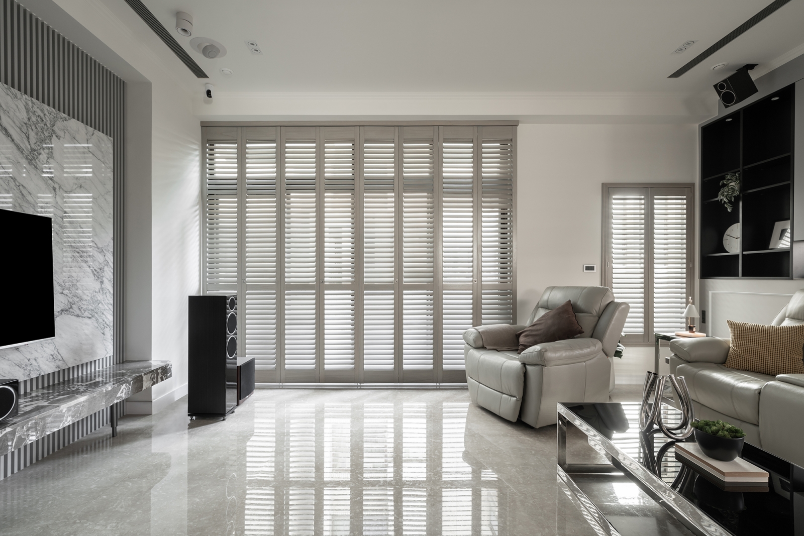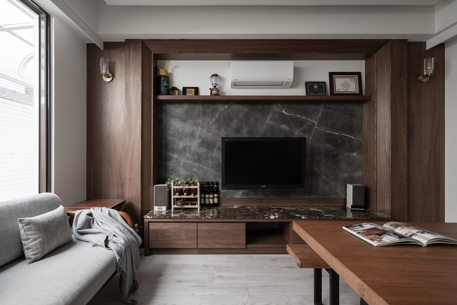 一樓空間設定為男主人的小天地,其是以木質調為基底。該區特點是最大程度保留老屋既有裝修。在電視主牆原構造不變的情況下,採用KD木皮、黑色大理石與壁燈做綴飾。其中,電視櫃的大理石桌檯是沿用原屋留存的材料,並經重新設計轉化而成,體現了再利用的環保精神。