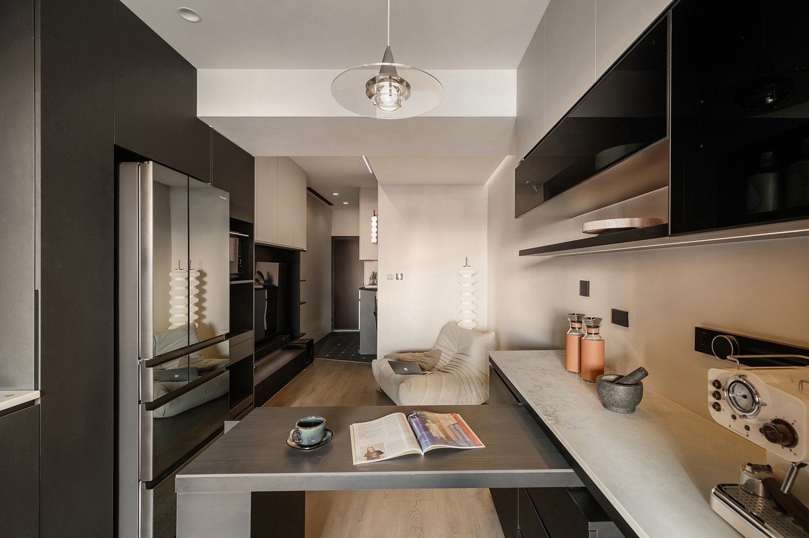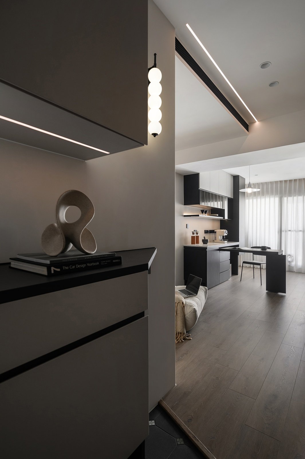玄關鋪設法式復古花磚,白色紋理如貓咪輕踏的足印,成為日常的詩性序章。地坪以斜切手法延展視覺深度;鞋櫃底部配置滑動輪式抽拉盤,置物平台延伸出導斜層板並規劃雨傘吊掛,兼顧儀式性與便捷性。客餐廳以柔和中性色調為主,櫃體以黑色輔以奶茶色,紫色廚房玻璃增添復古質感。考量小宅動線,設計旋轉餐桌與摺疊門以增加彈性;所有櫃體採隱藏式崁把手,維持表面的簡潔俐落。